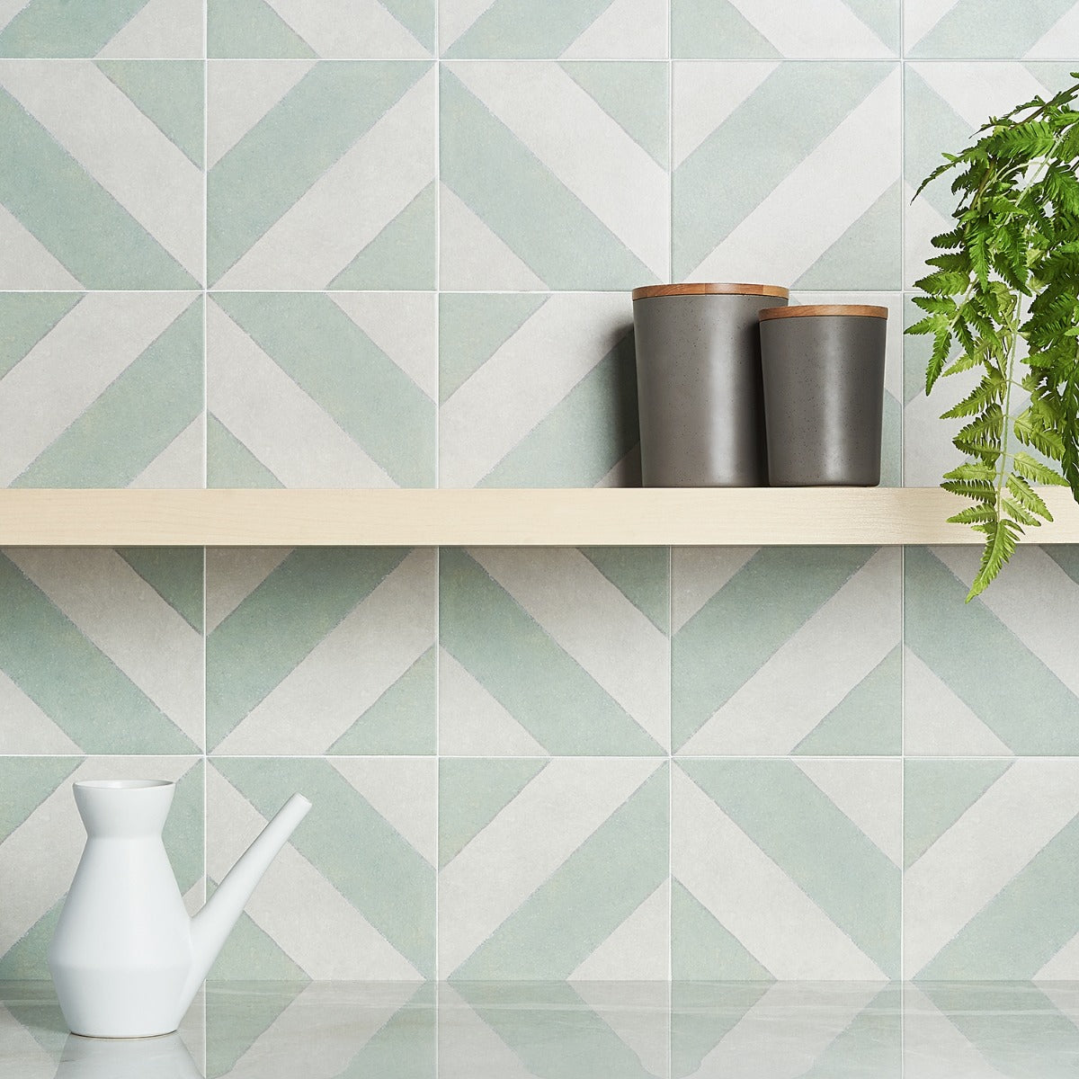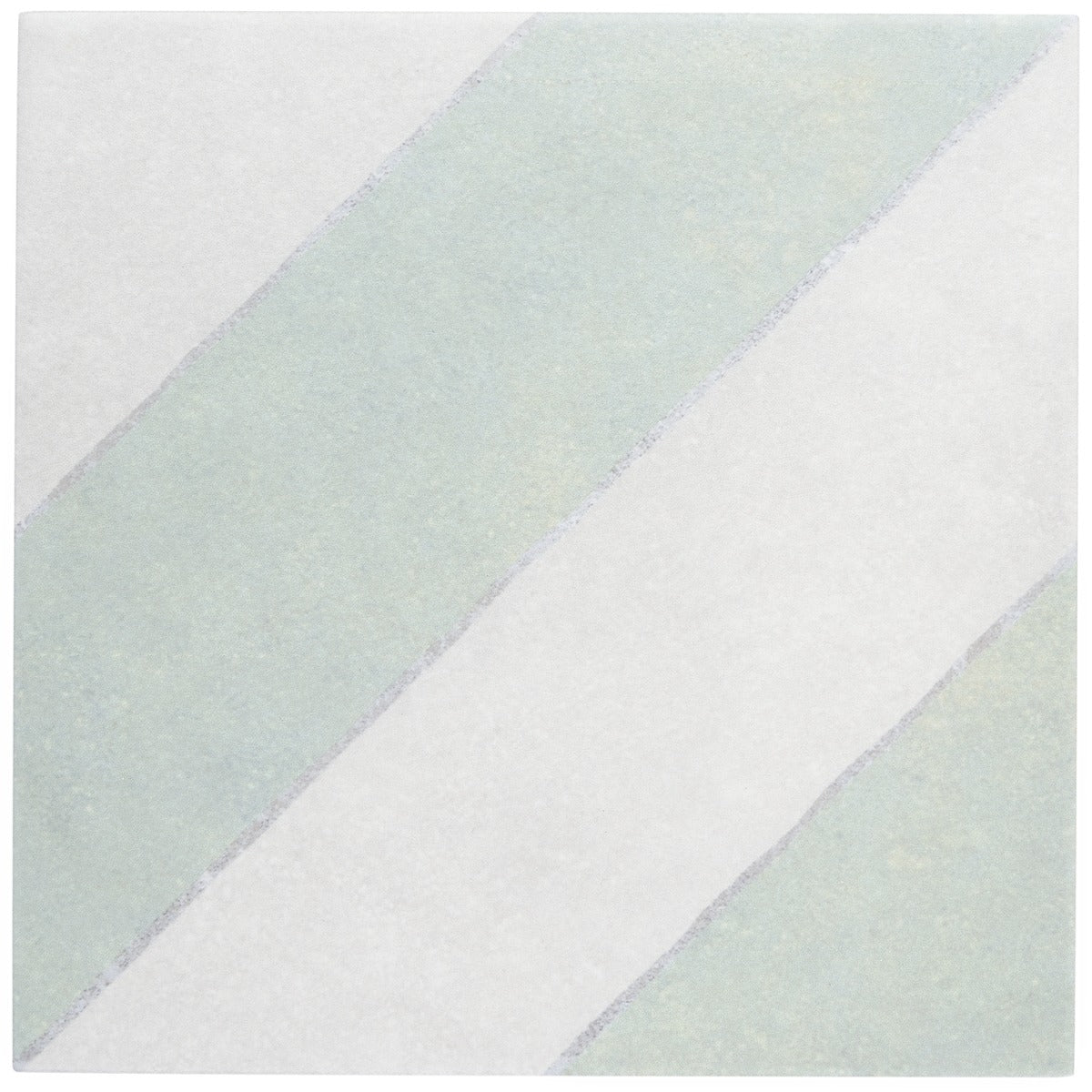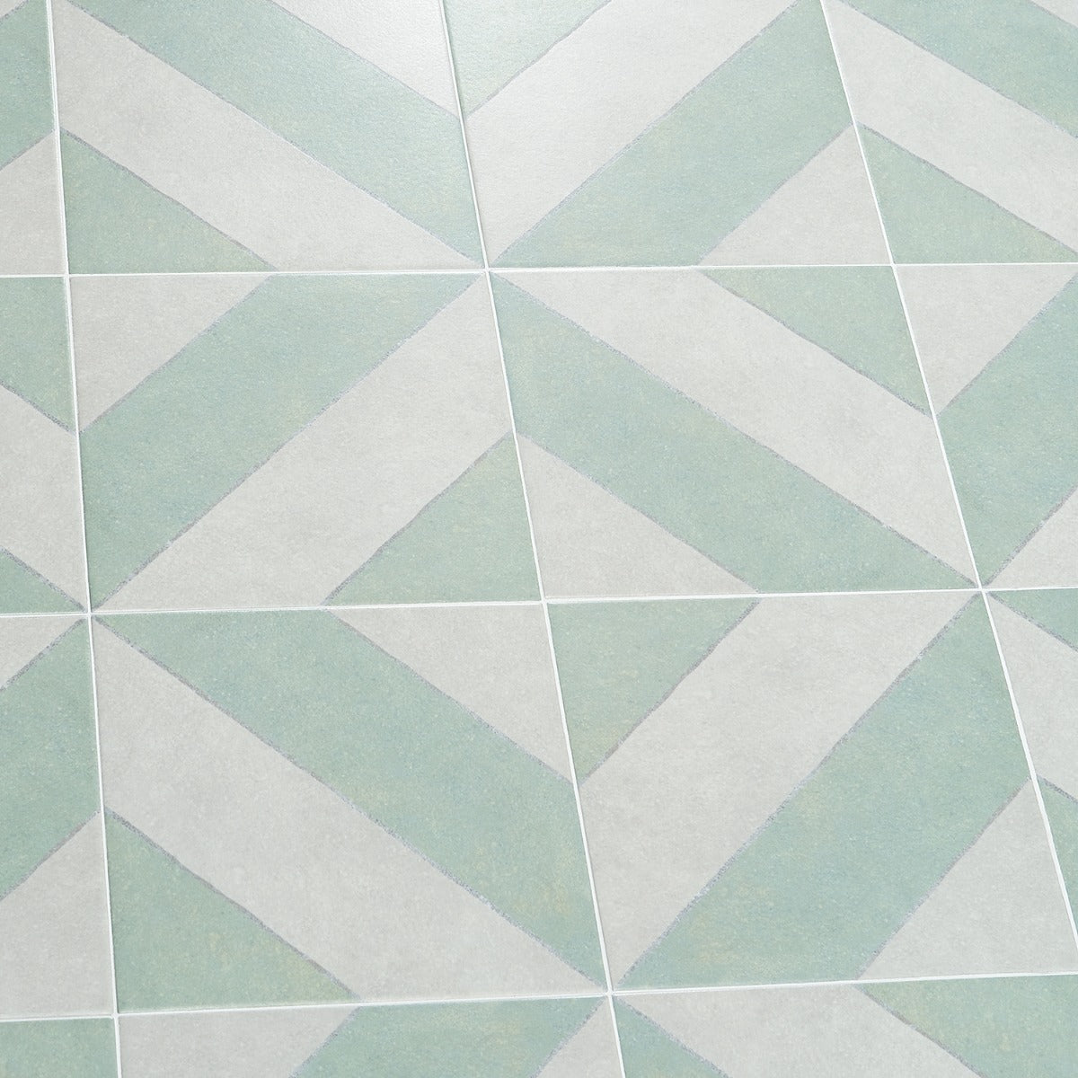 The Auteur Kaleidoscope Sage Green 9x9 Matte Porcelain Tile features a playful diagonal pattern in mossy green and white, offering artisanal quality and creative freedom. Its durable porcelain material replicates the look of handmade encaustic tiles, providing scratch, water, and fade resistance.