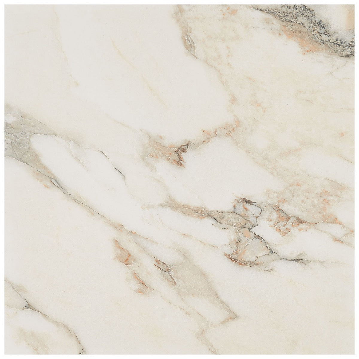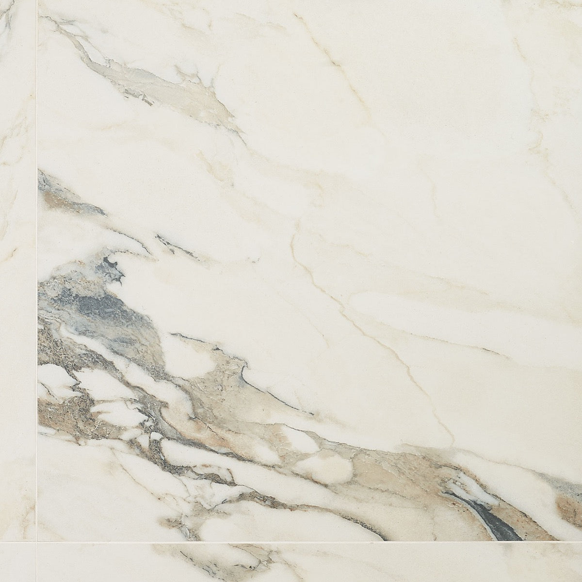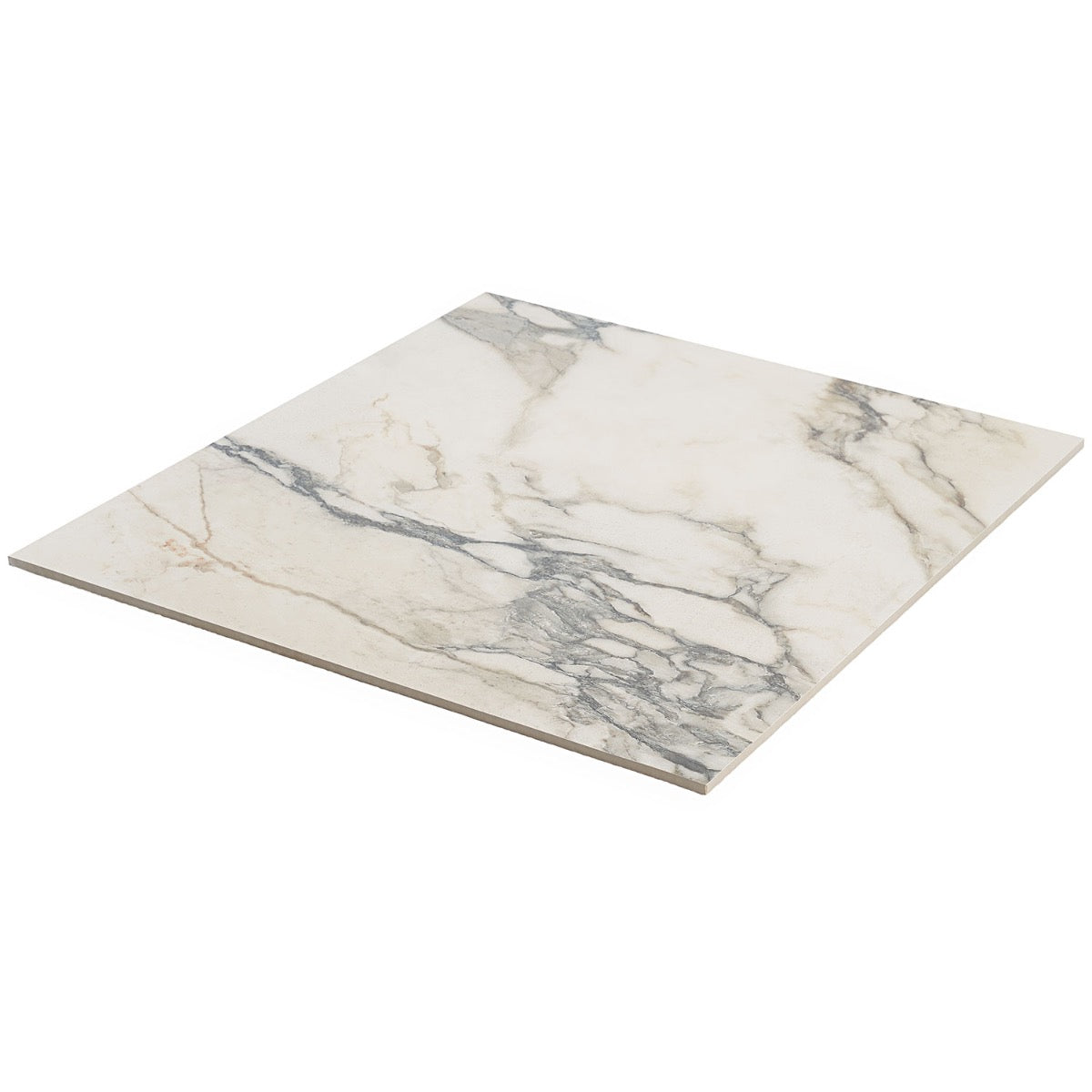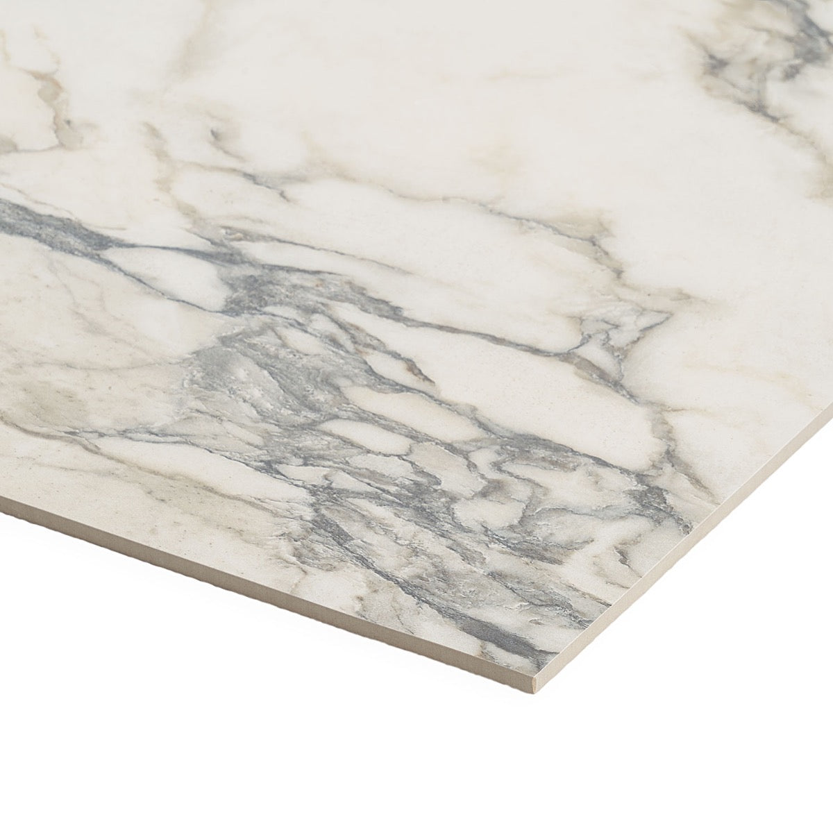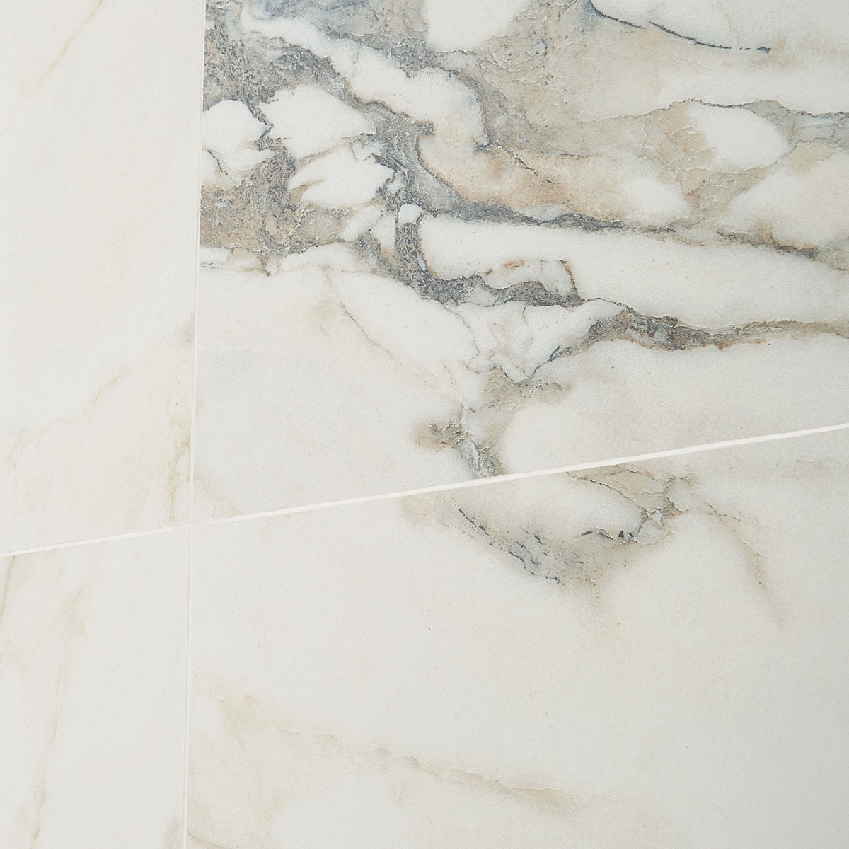 A: The tile features warm ivory tones and dramatic blonde veining, mimicking the appearance of natural Calacatta marble.