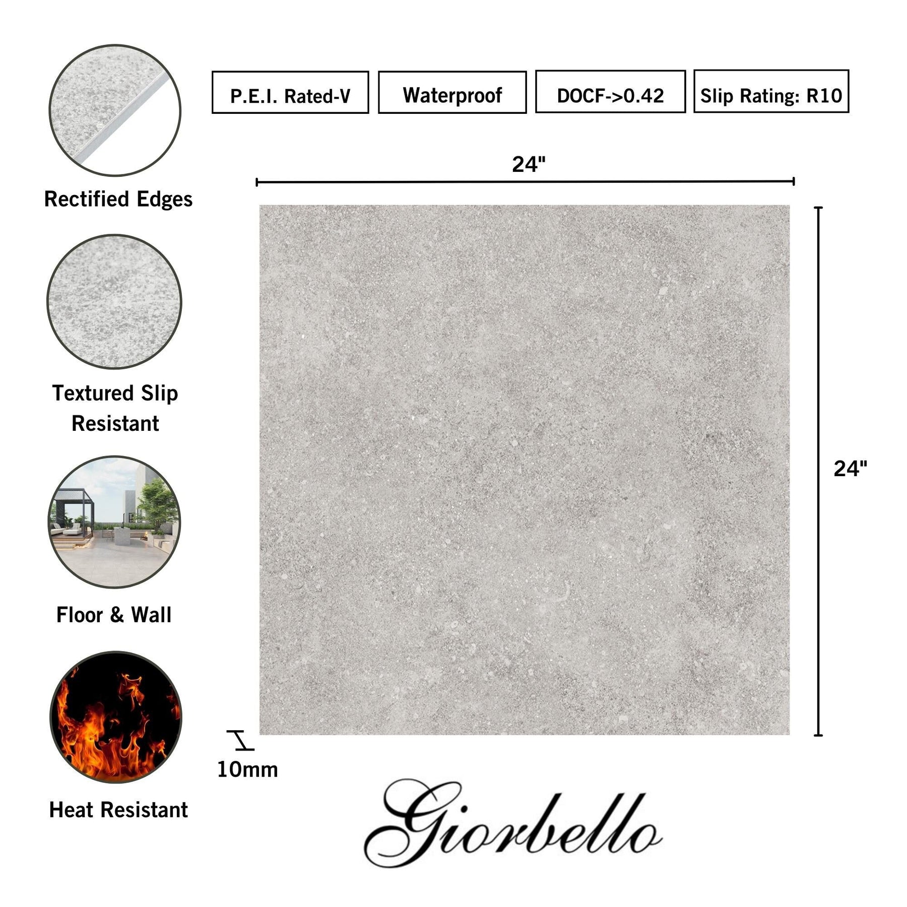 Elevate any space with the Giorbello Ambience Natural Silver Matte Porcelain Stone Look Floor Tile. Crafted in Italy, these 24-inch square tiles offer a stunning stone appearance with the durability of porcelain, perfect for both high-traffic residential and commercial areas.