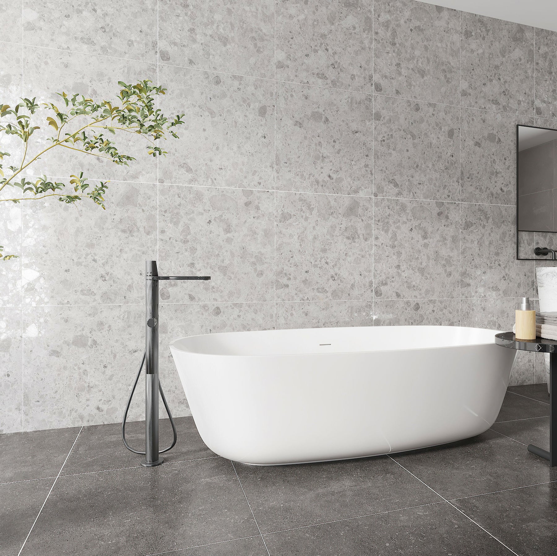 Embrace the timeless elegance of Italian design with Giorbello's Ambience Terrazzo Silver tiles, artfully blending modern aesthetics with classic allure. With their matte finish sprinkled with shimmering speckles, these tiles bring a subtle sophistication to any space. Consider pairing them with minimalist decor to let their quiet luxury take center stage, or use them underfoot to create a seamless flow from indoors to an outdoor patio. These tiles are not just a surface, but a foundation of luxury living.