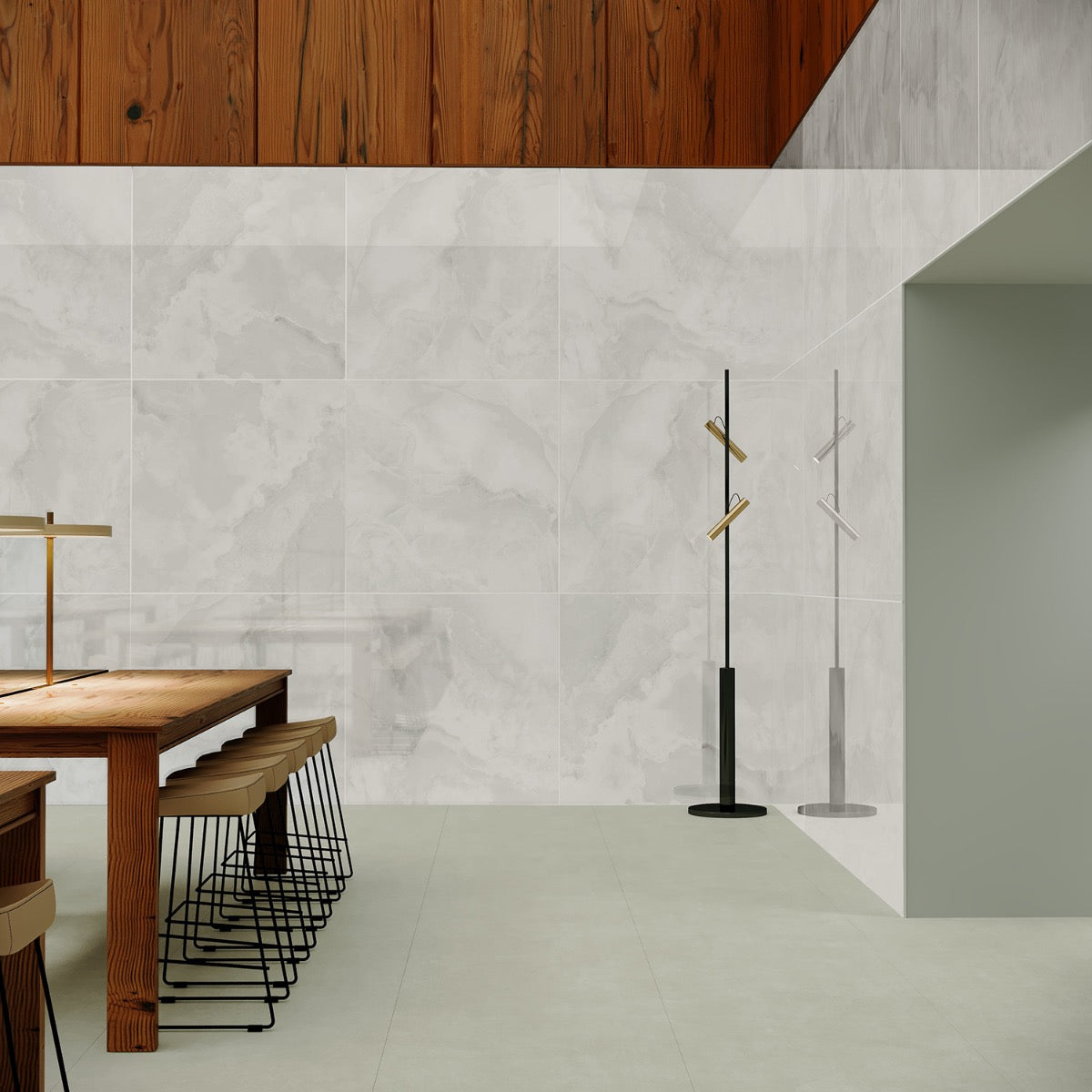 The Jewel Onyx White Polished Porcelain Tile offers a luxurious and durable solution for your flooring and wall needs. Its polished finish mimics the elegance of white onyx, providing a seamless and sophisticated look.