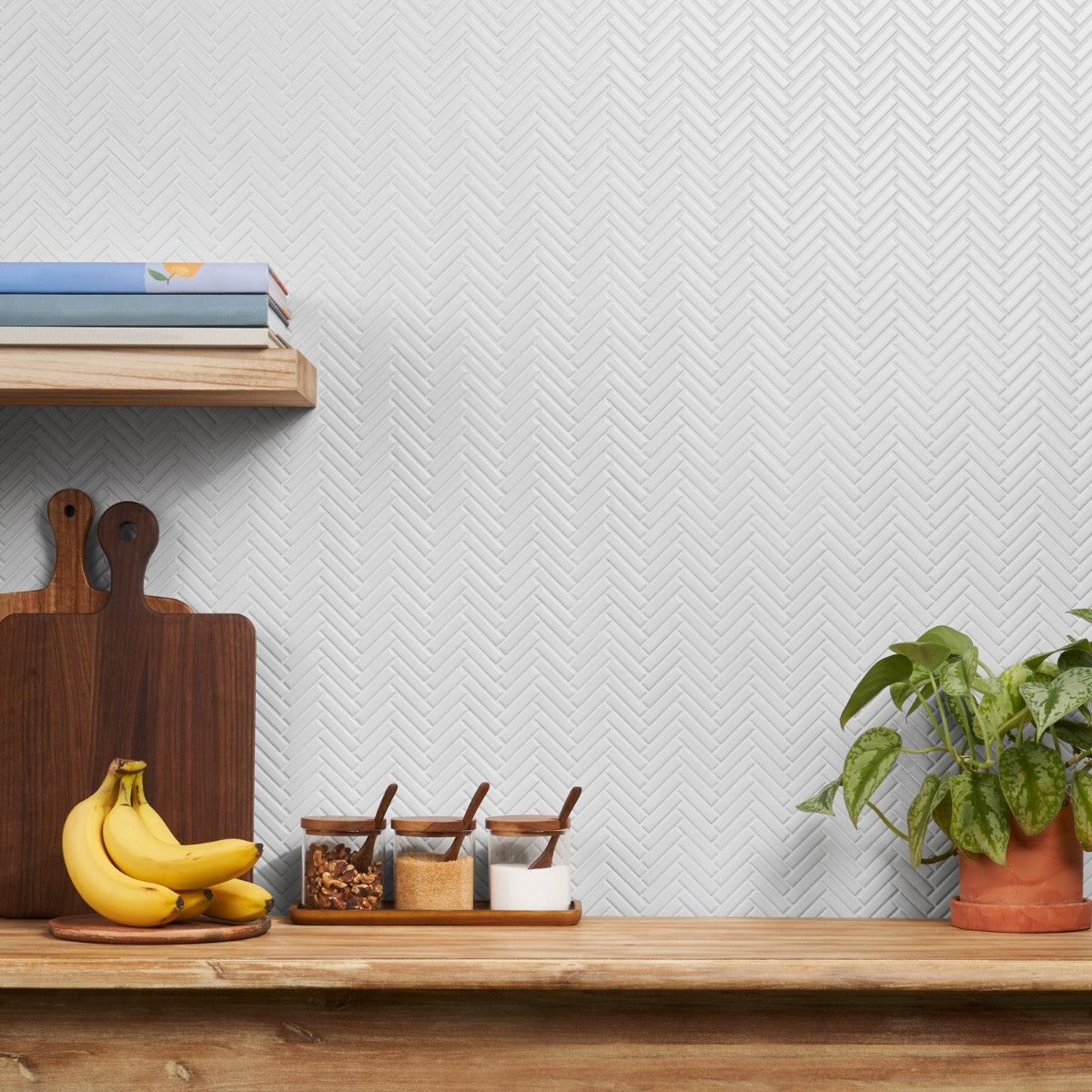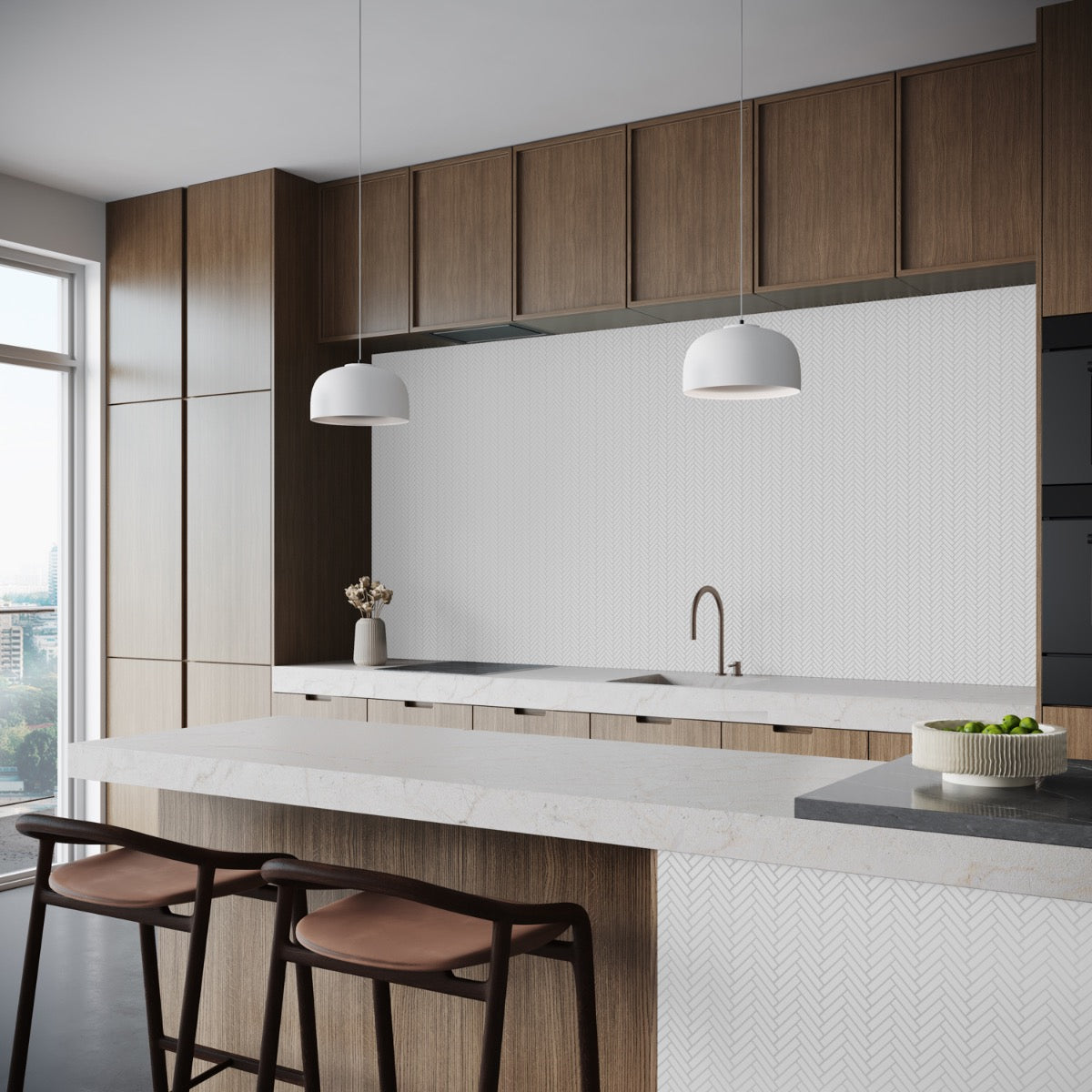 Transform your space with the timeless elegance of the Kai White Herringbone Tile—order now to elevate your design.