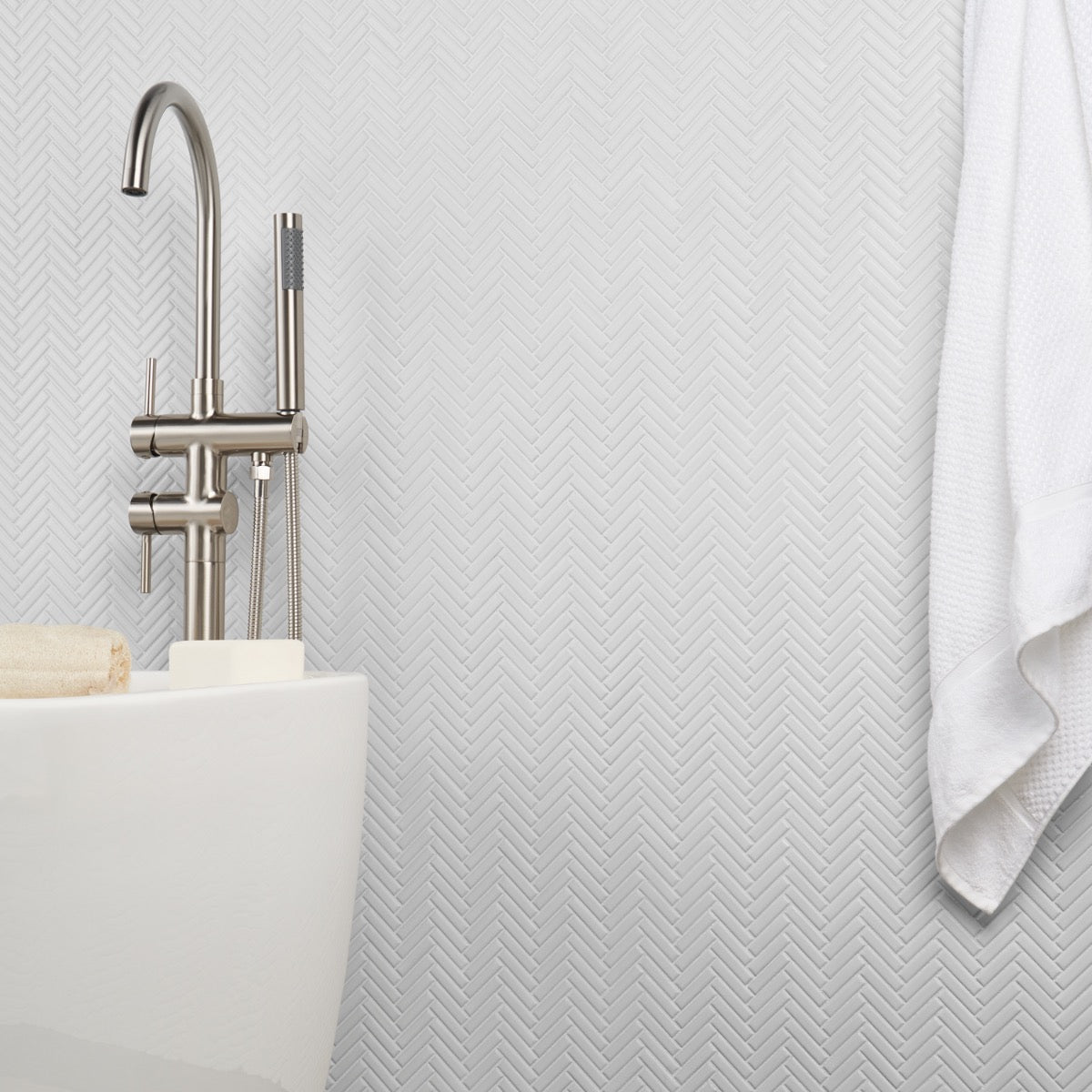 The Kai White Herringbone Matte Porcelain Mosaic Tile combines timeless design with modern elegance. Featuring a warm white color and a soft matte finish, this durable porcelain tile is perfect for a variety of applications, from backsplashes to showers.