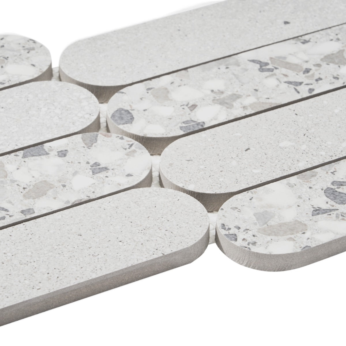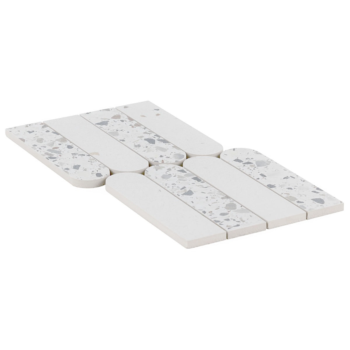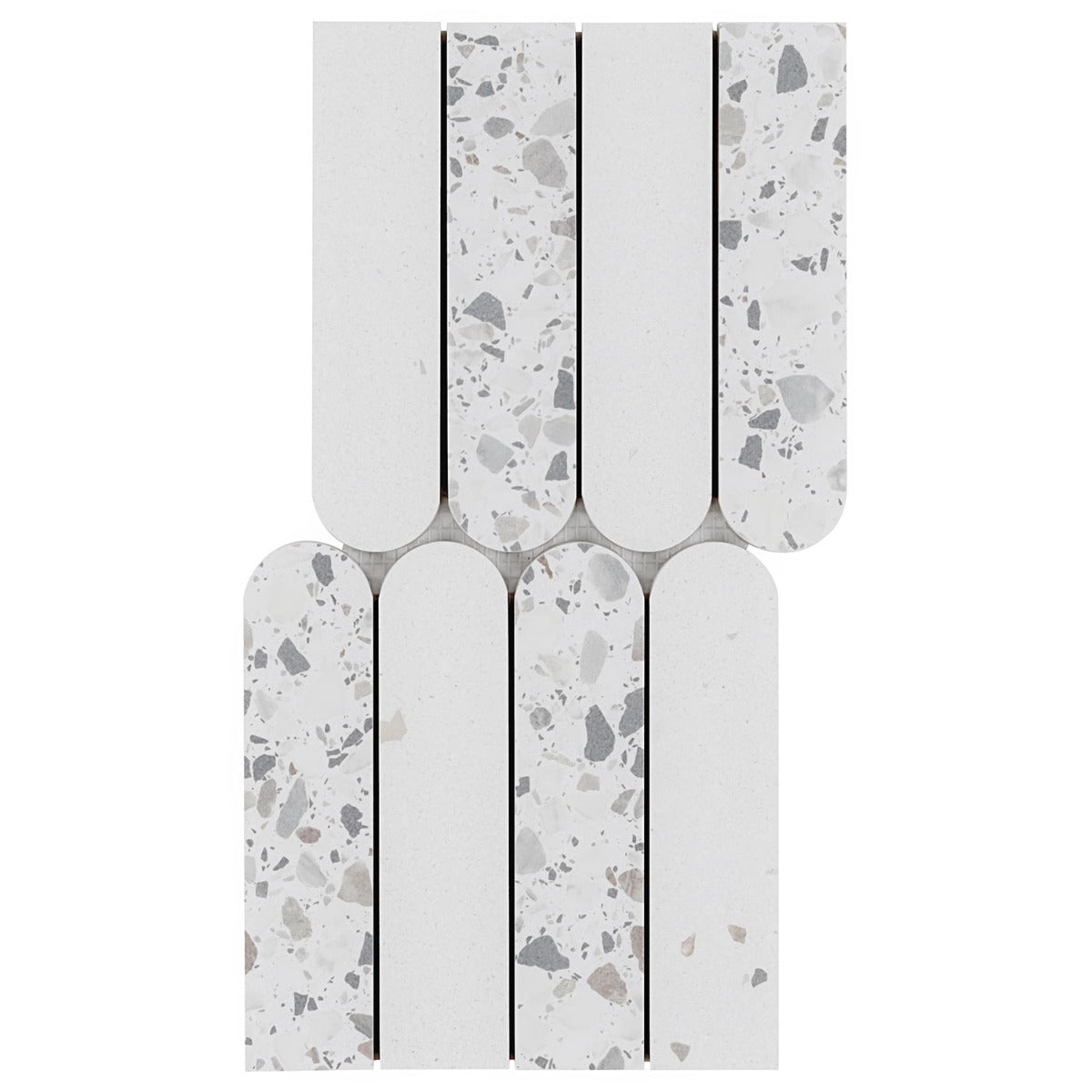 The Kobe Fin Ice White Terrazzo Mosaic Tile combines modern 3D printing with a classic terrazzo look, offering exceptional durability and a seamless design for both indoor and outdoor applications.