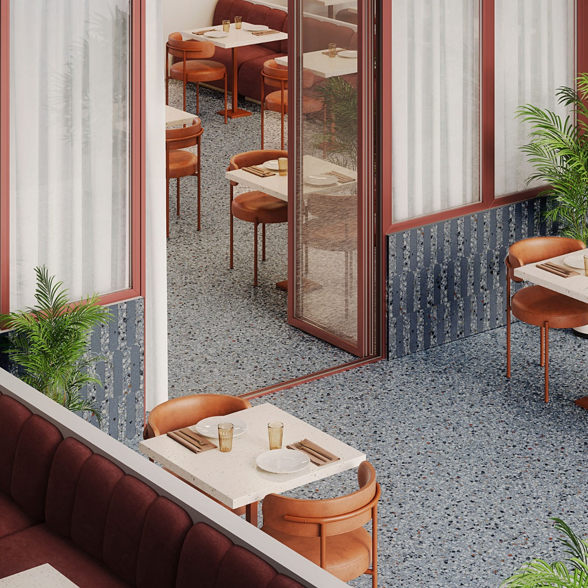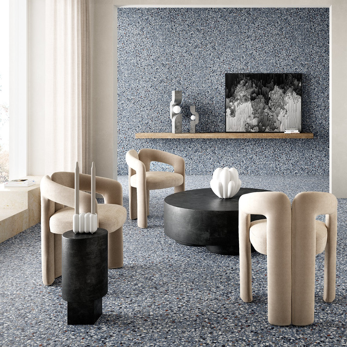• Timeless Design: Evokes classic terrazzo with multicolored chips on a sea-colored background.