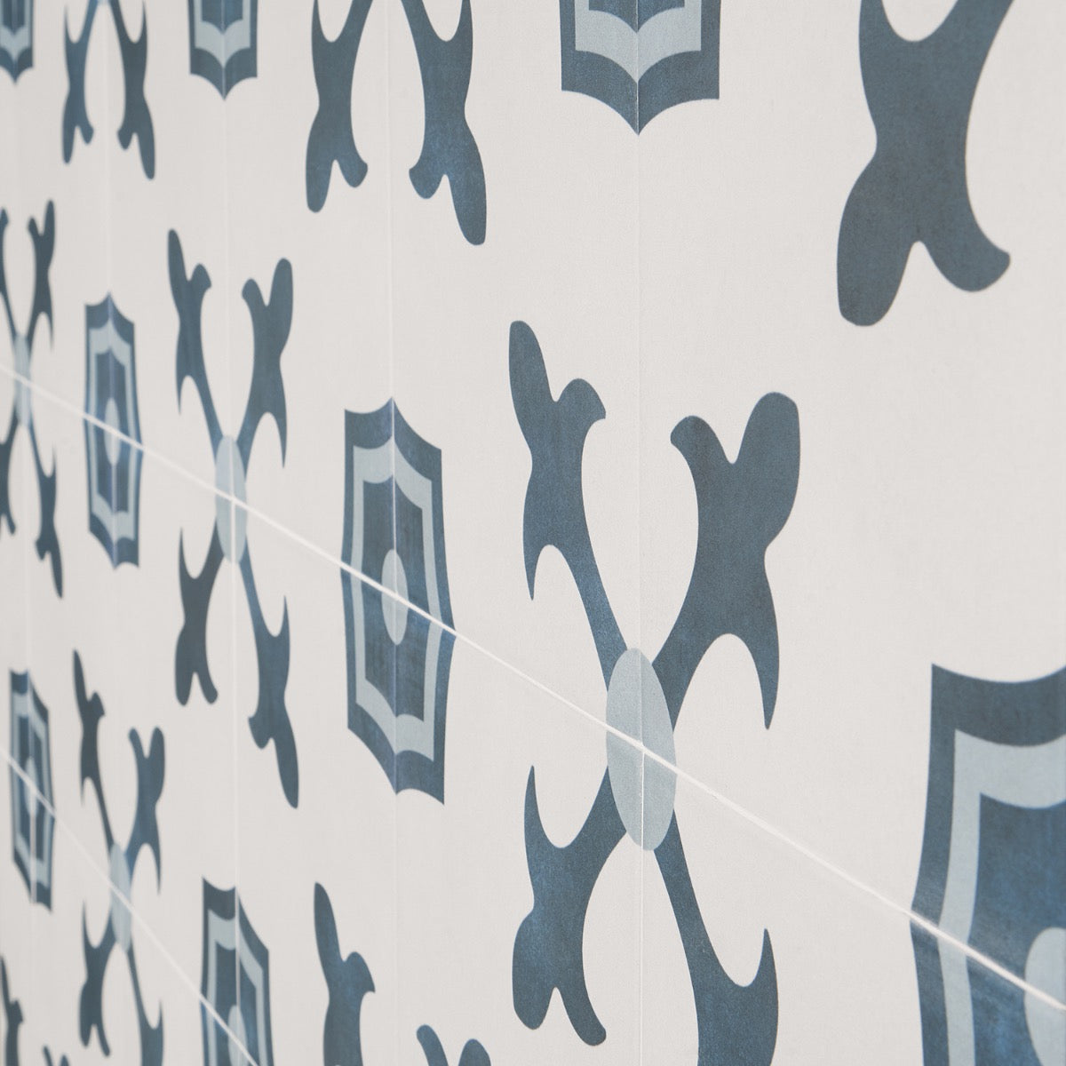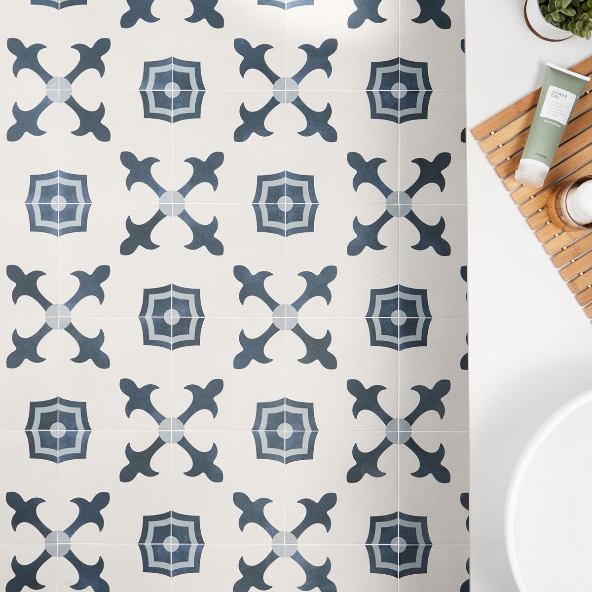 Transform your space with the Mediterranean-inspired Lapaz White & Blue Herald Tile—order now to bring timeless elegance to your home.