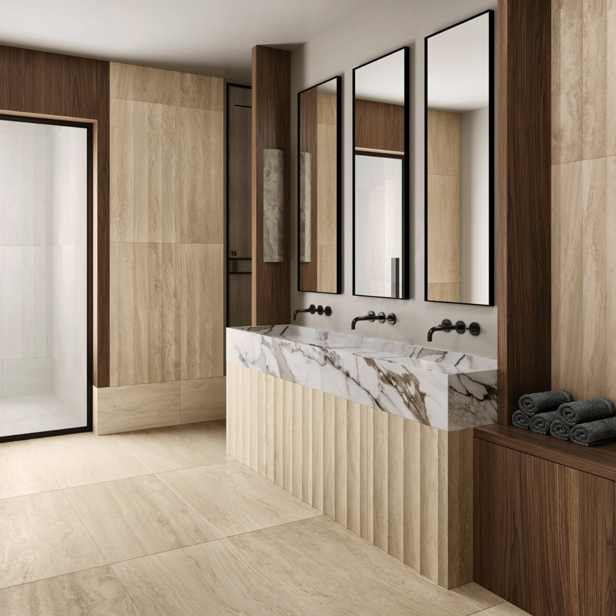 The Lumar Waves 3D Travertino Crema Beige tile is a masterpiece of design, blending the warmth of natural travertine with the durability of porcelain. Its fluted texture creates a captivating play of light and shadow, perfect for accent walls or luxurious bathrooms. Pair it with minimalist fixtures to let its beauty shine, or use it as a backdrop for bold decor. This tile is not just a surface—it's a statement of refined taste.