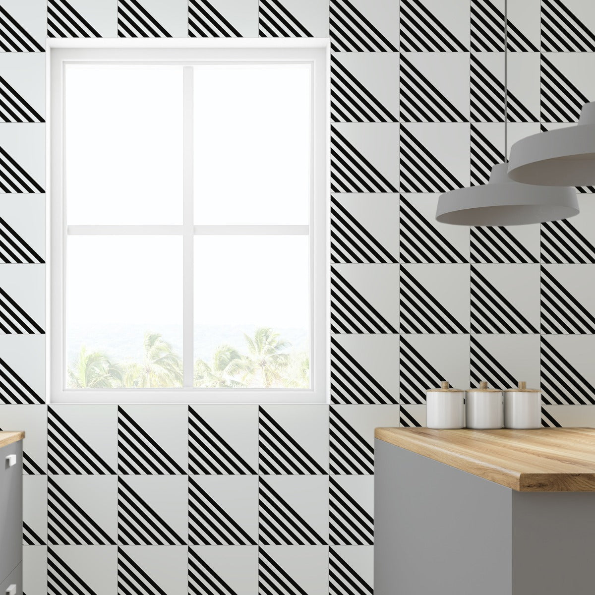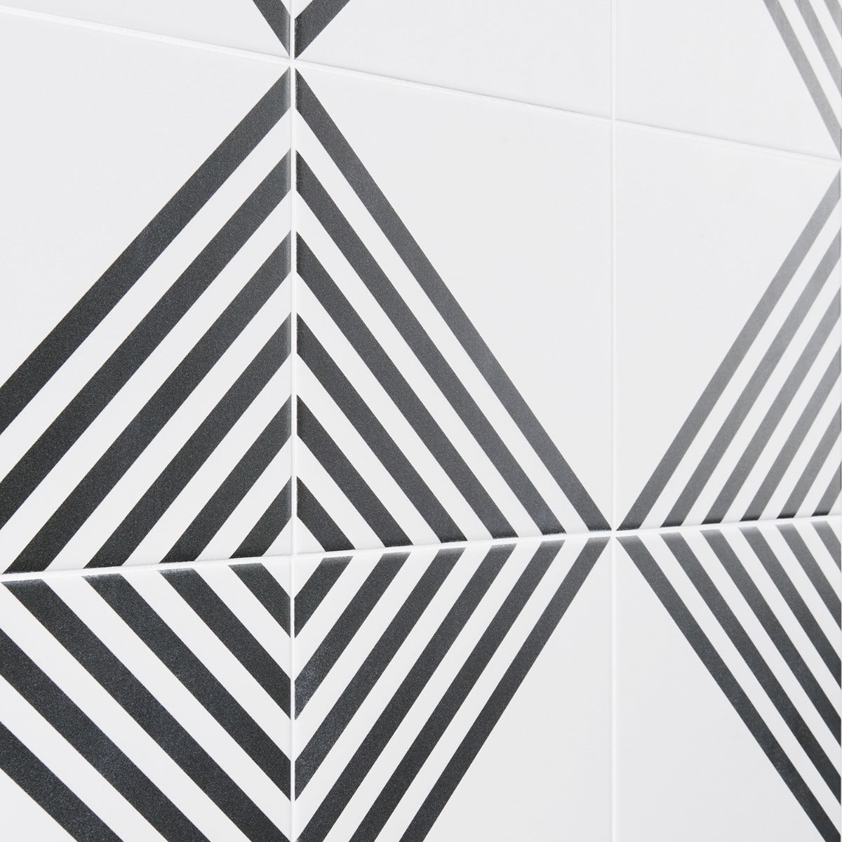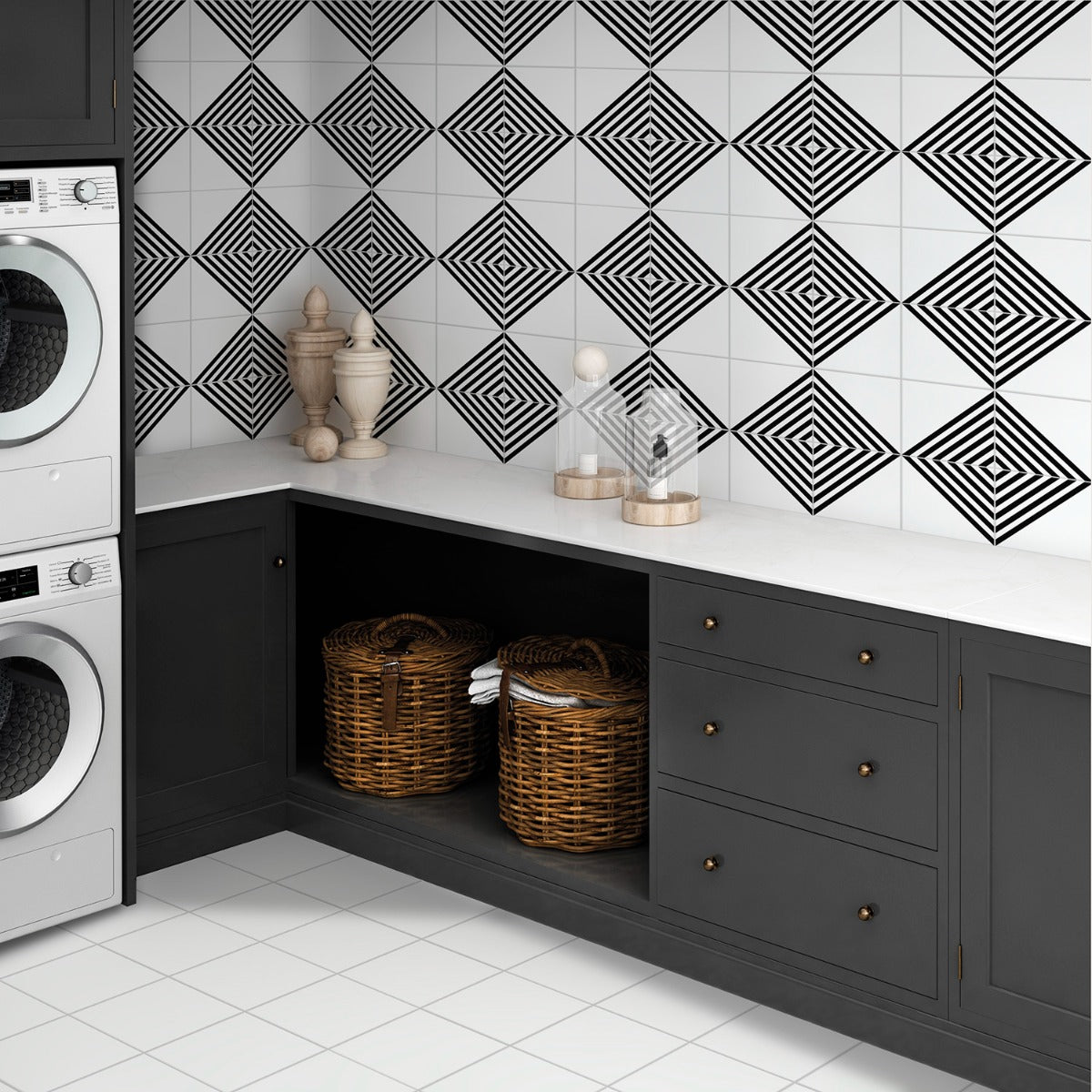 The B2W Stripe Positive Matte Porcelain Tile combines bold black-and-white geometric patterns with a durable porcelain construction. Its matte finish and encaustic-inspired design make it a versatile choice for modern and traditional spaces alike.