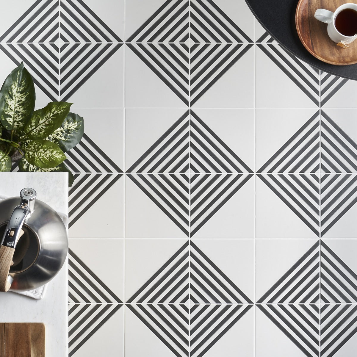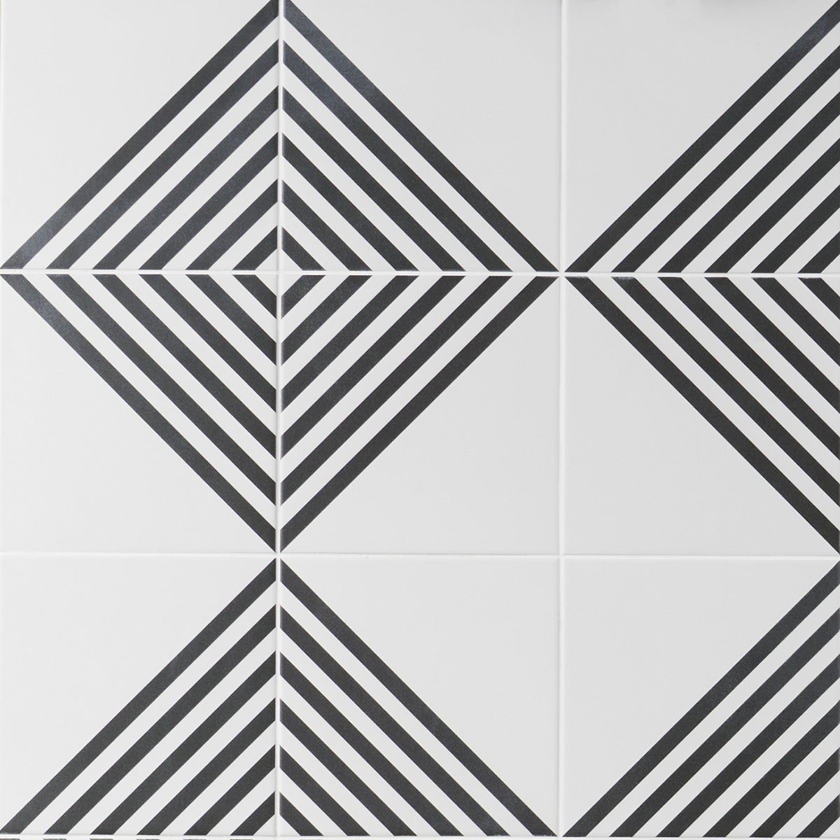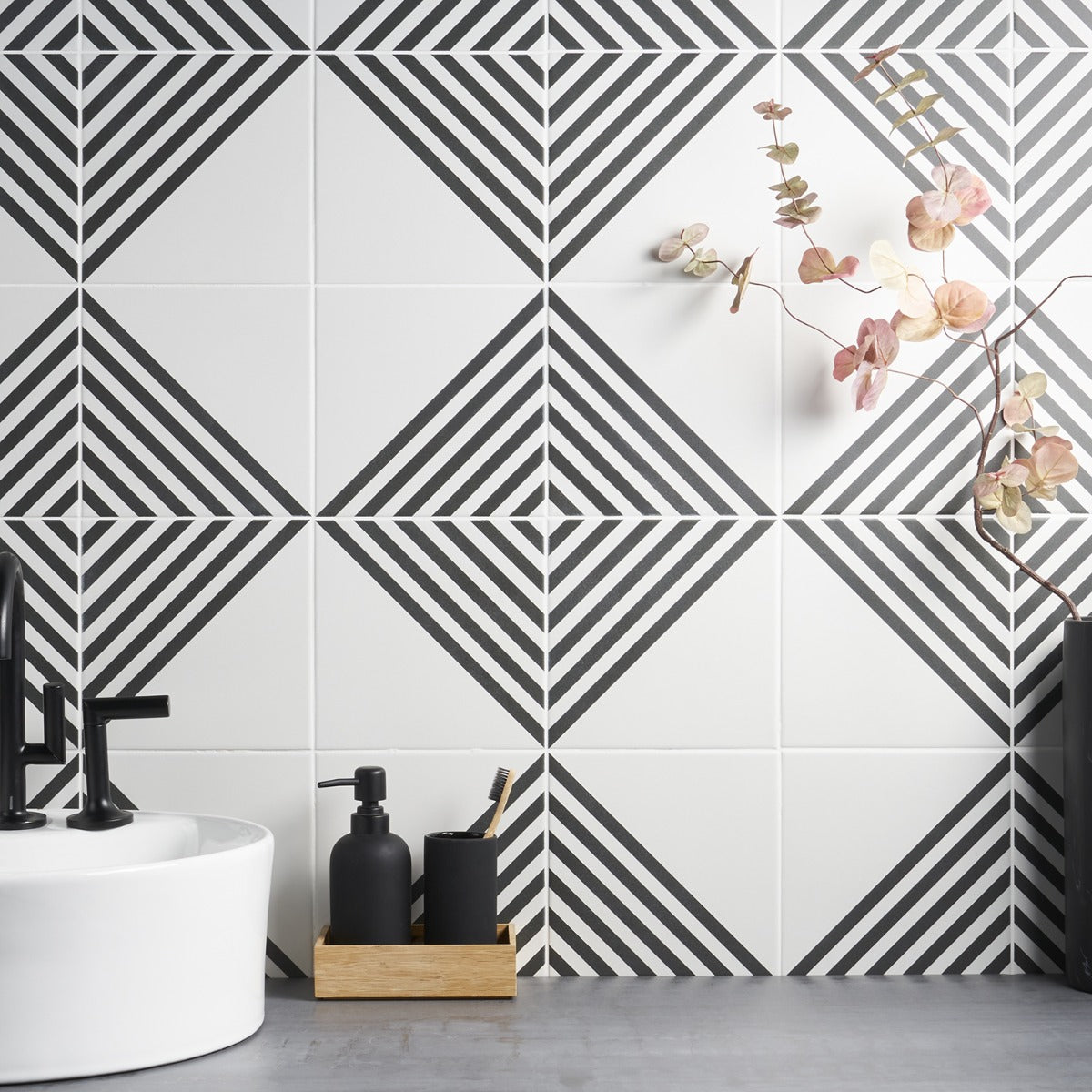 A: The tile features a bold black-and-white geometric pattern inspired by encaustic designs.