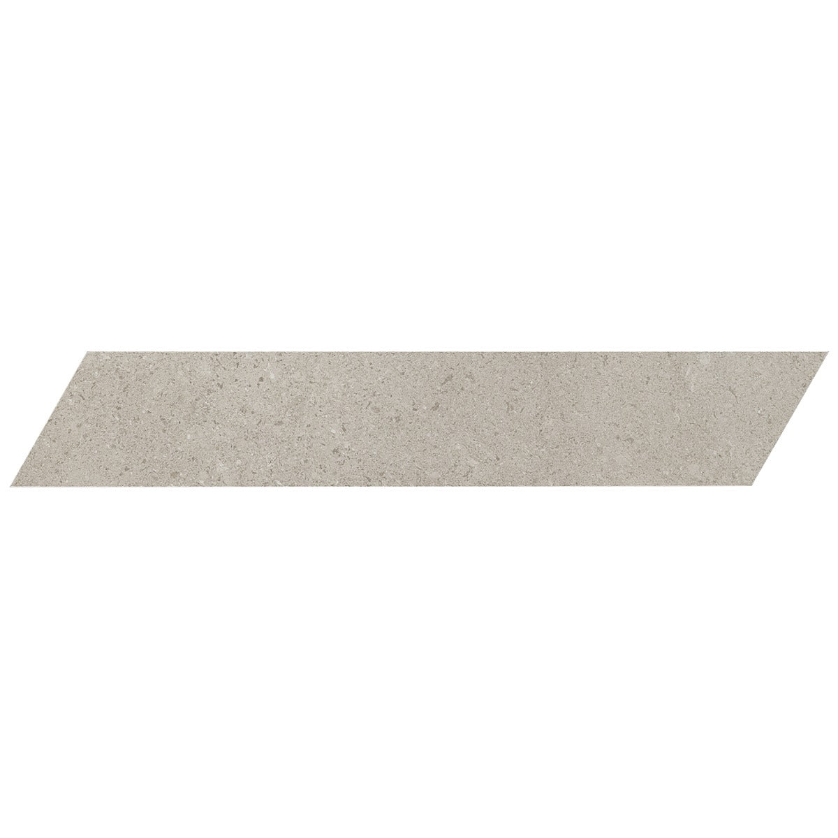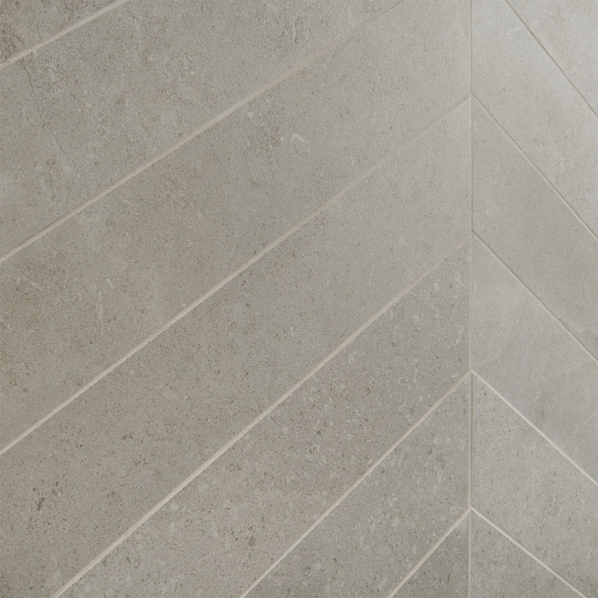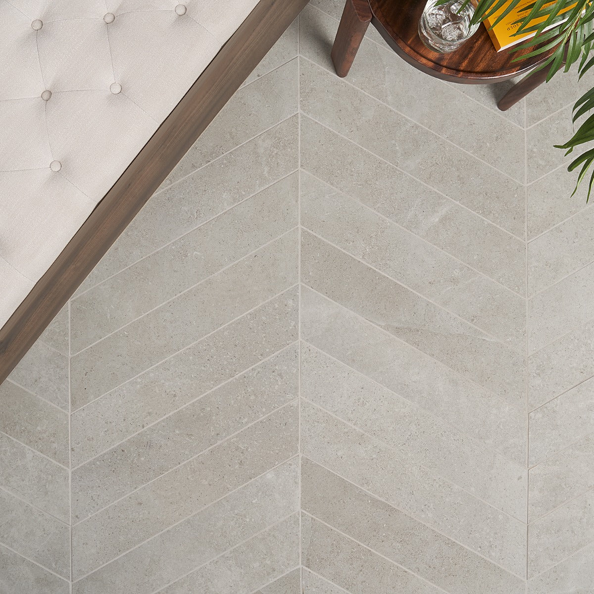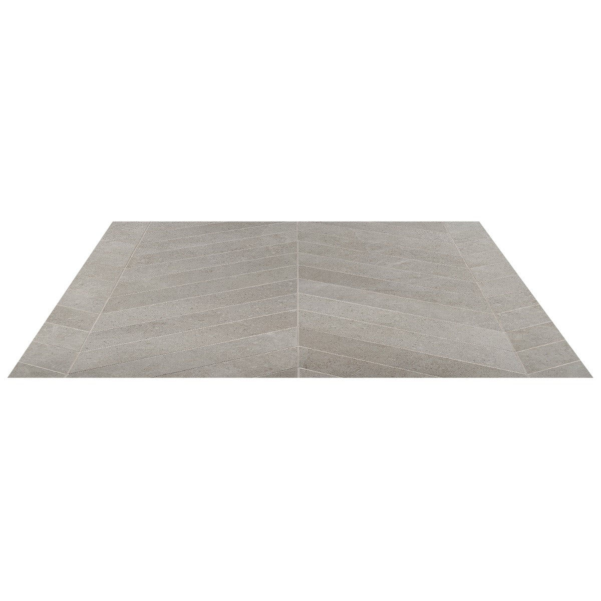 The New Rock Fumo Light Gray Chevron Tile is a masterpiece of design, blending the authentic charm of Lecce limestone with the durability of porcelain. Its smokey gray tones and subtle veining create a serene and sophisticated ambiance, perfect for modern interiors. Style it in a chevron pattern to add dynamic movement to floors or walls, and pair it with natural wood accents for a harmonious look. This tile is not just a surface; it's a statement of refined taste and luxurious living.