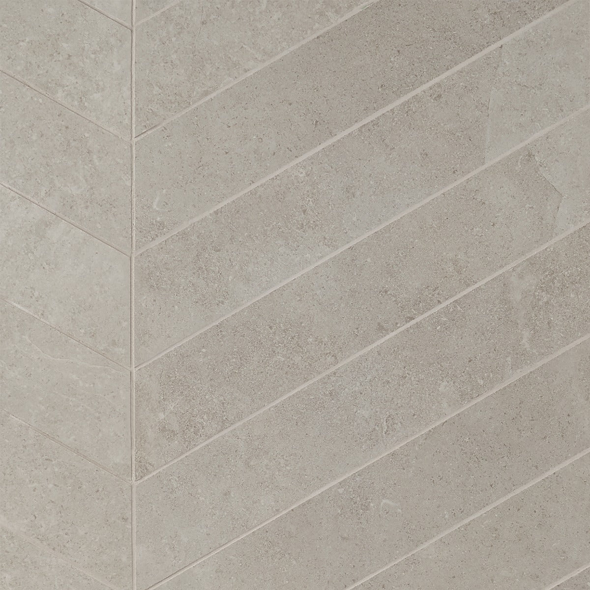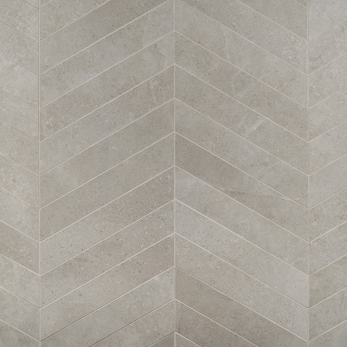 The New Rock Fumo Light Gray Chevron Tile offers a sophisticated limestone look in durable porcelain. Its smokey gray color with subtle veining and matte finish creates a modern yet timeless aesthetic, perfect for both residential and commercial spaces.