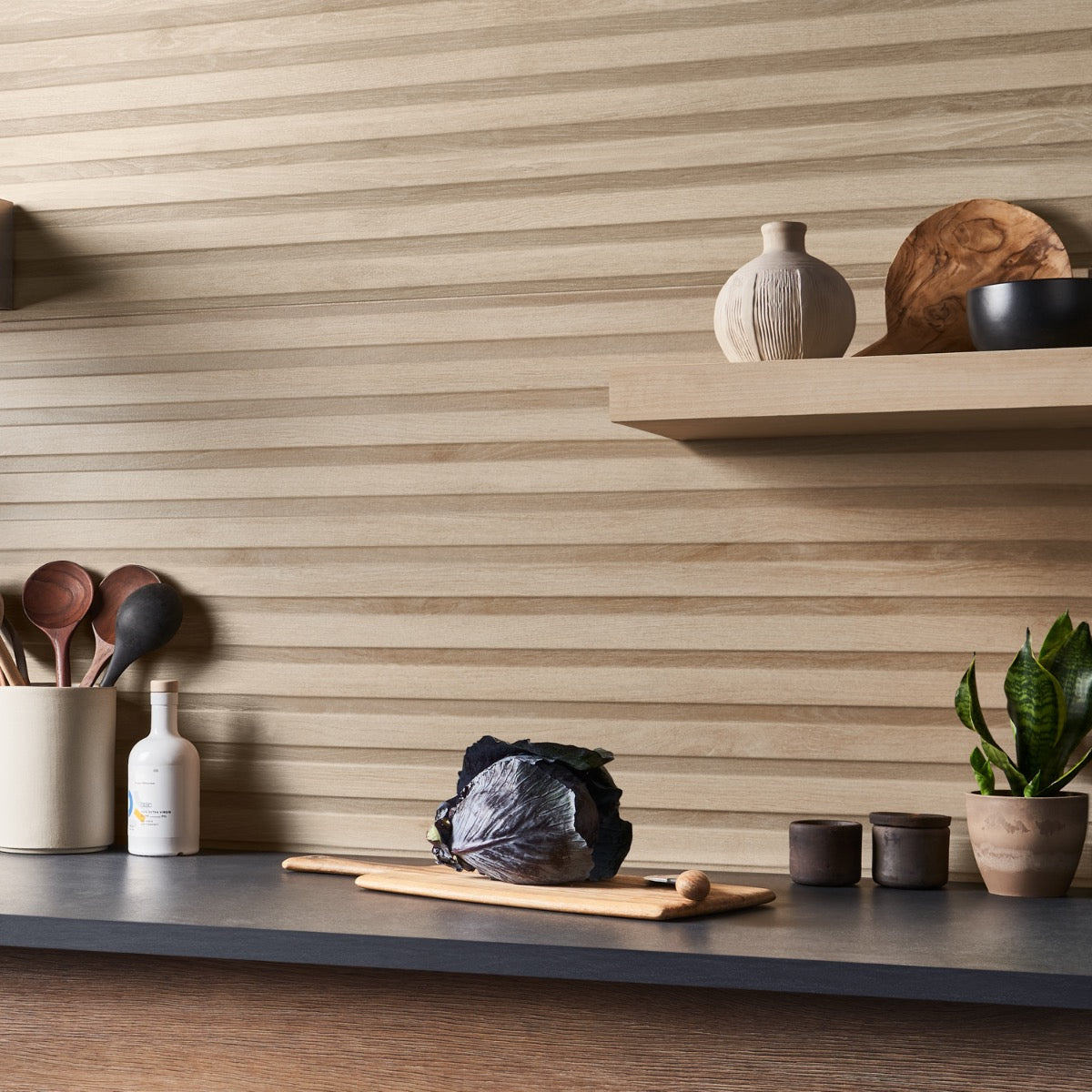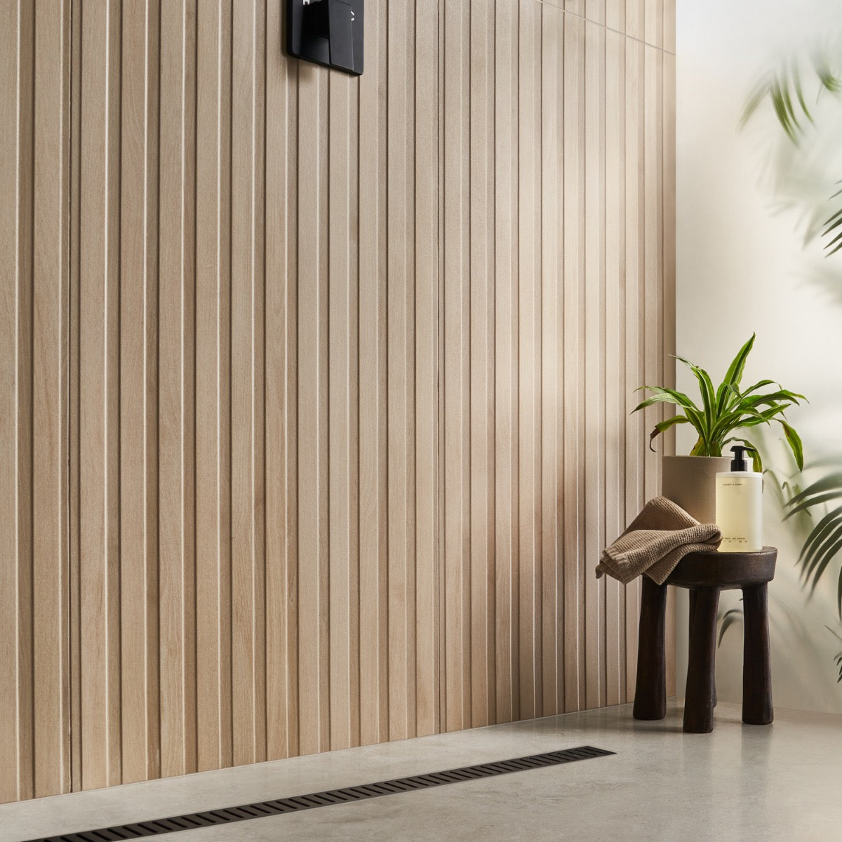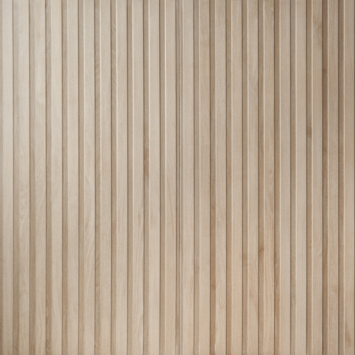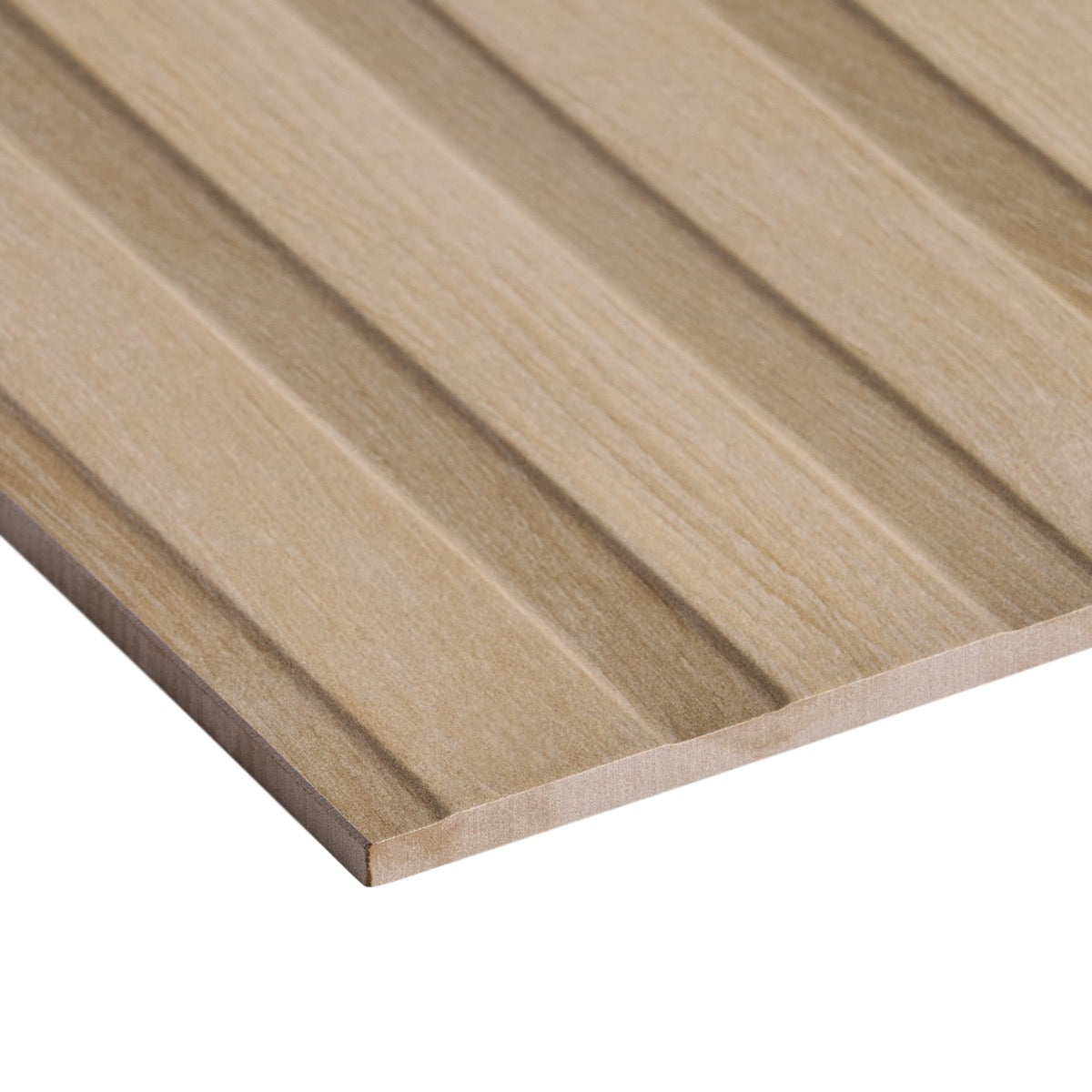 The Nobu Ribbon Almond Brown Tile offers a modern wood-look design with fluted texture, perfect for creating a clean and versatile aesthetic. Made from durable, water-resistant porcelain, it is ideal for areas like bathrooms and kitchens.