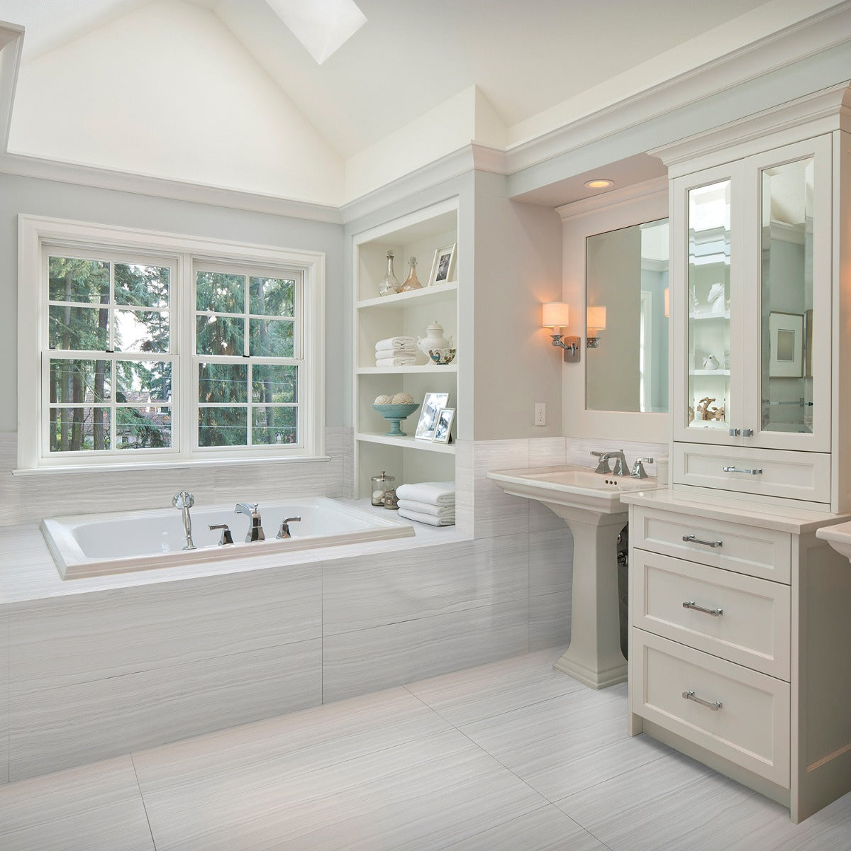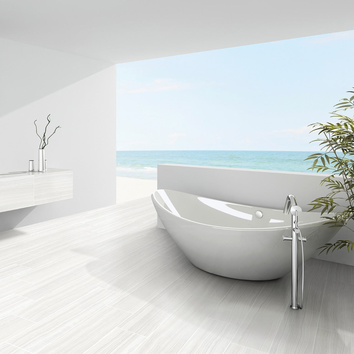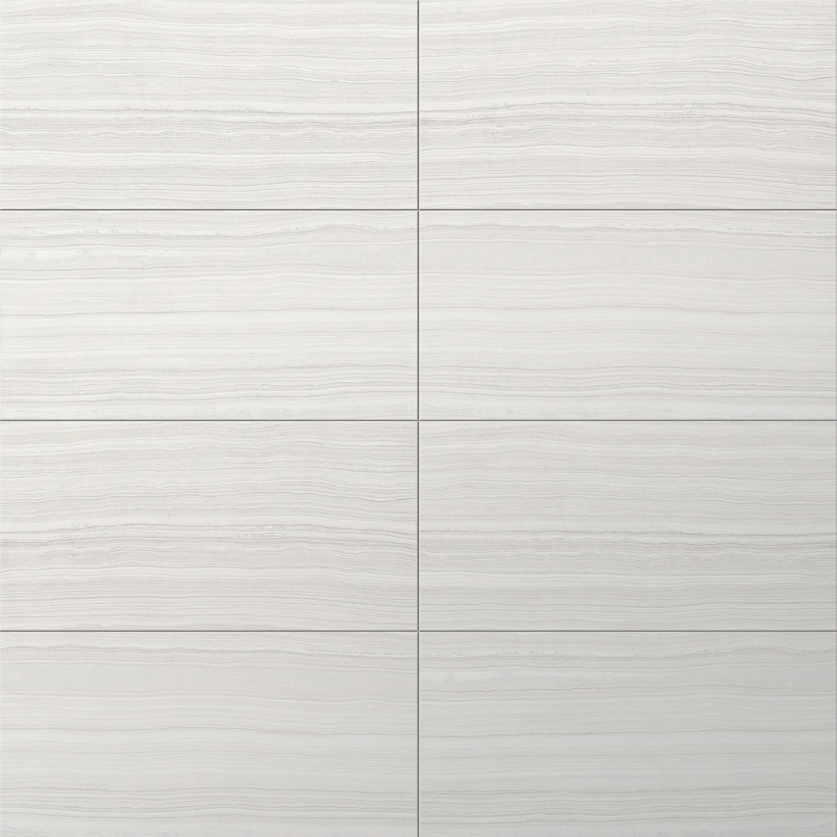 The Miles Bright White 12x24 Matte Porcelain Tile offers a natural stone look with organic lines and soft tones. Its durable porcelain construction is suitable for both indoor and outdoor use, providing a versatile and calming aesthetic.
