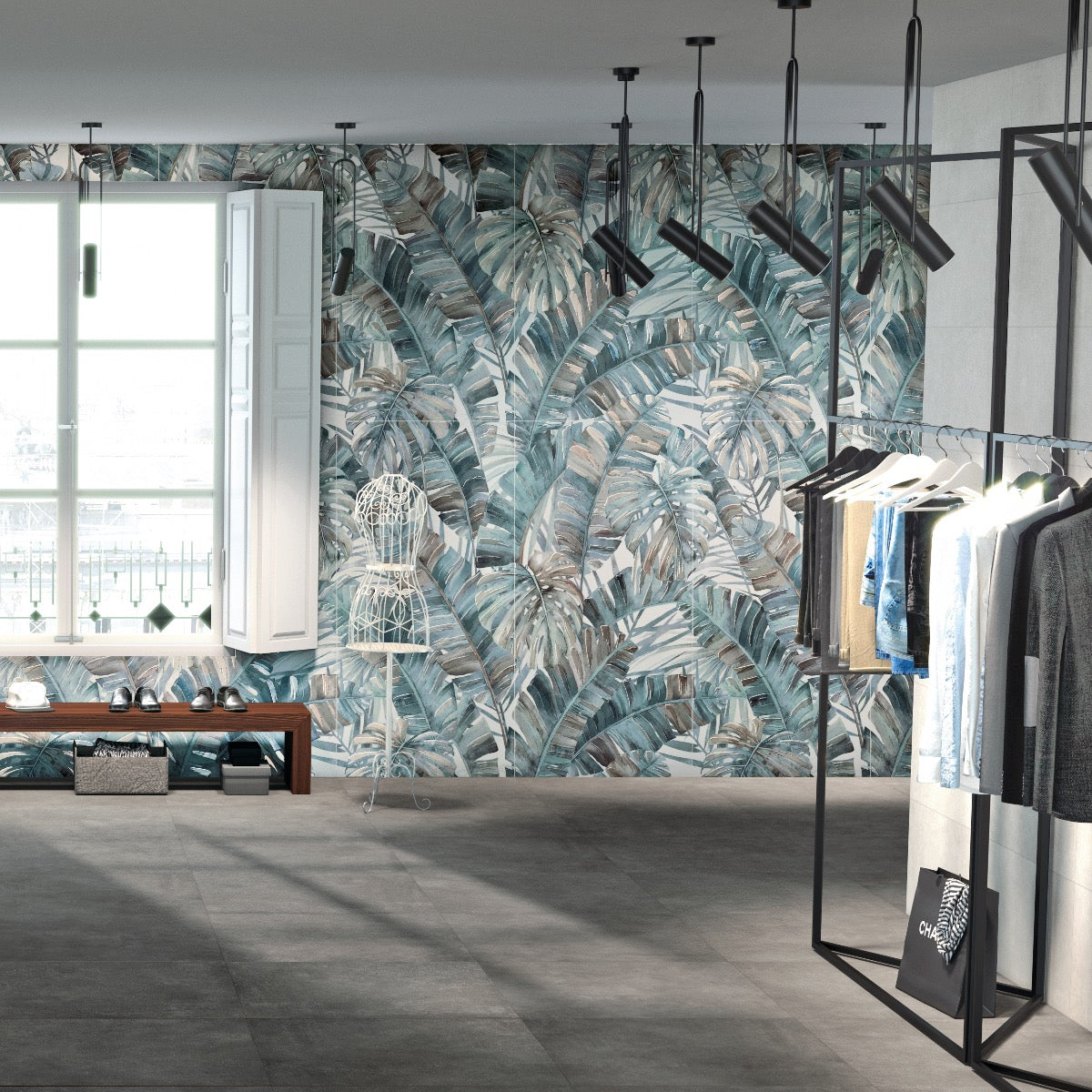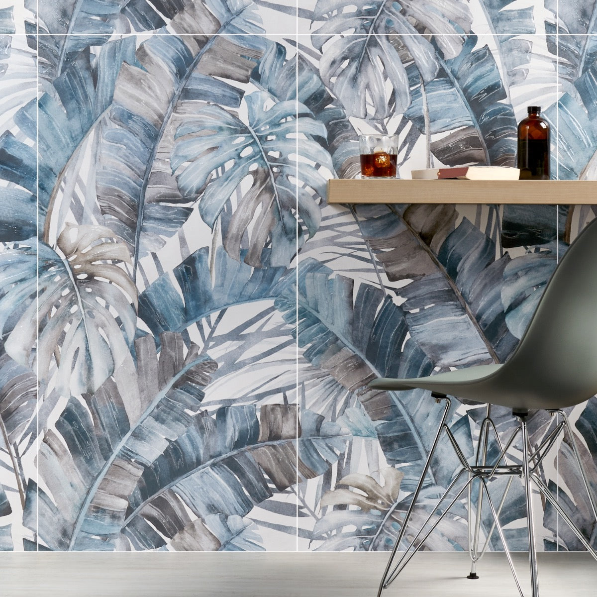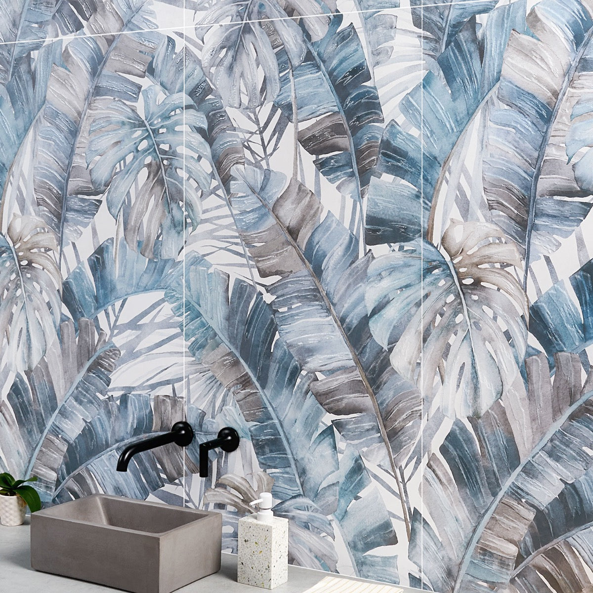 The Monet Rain Forest Blue Porcelain Tile offers a lush, tropical design with a watercolor finish, perfect for creating stunning murals in showers, kitchens, or as a fireplace surround. Made in Italy, this large-format tile combines high-quality materials with intricate silk-screened patterns for a modern and sophisticated look.
