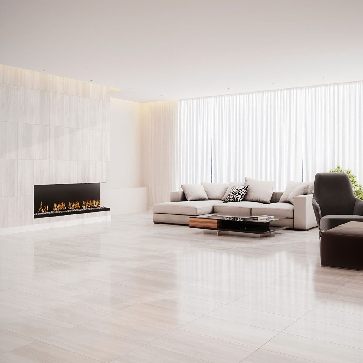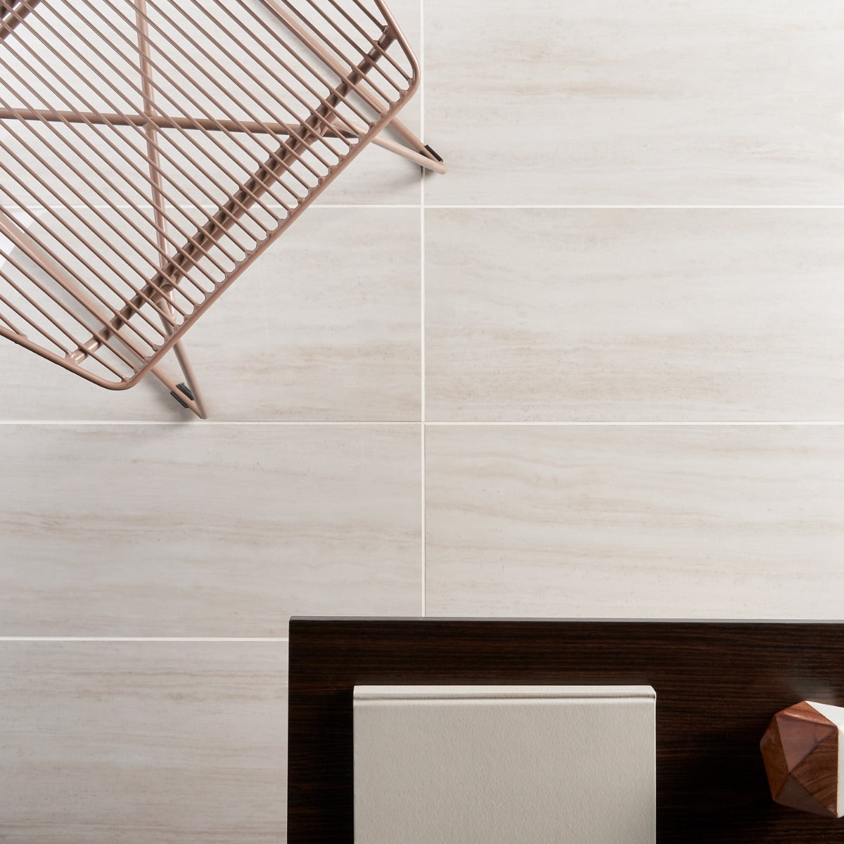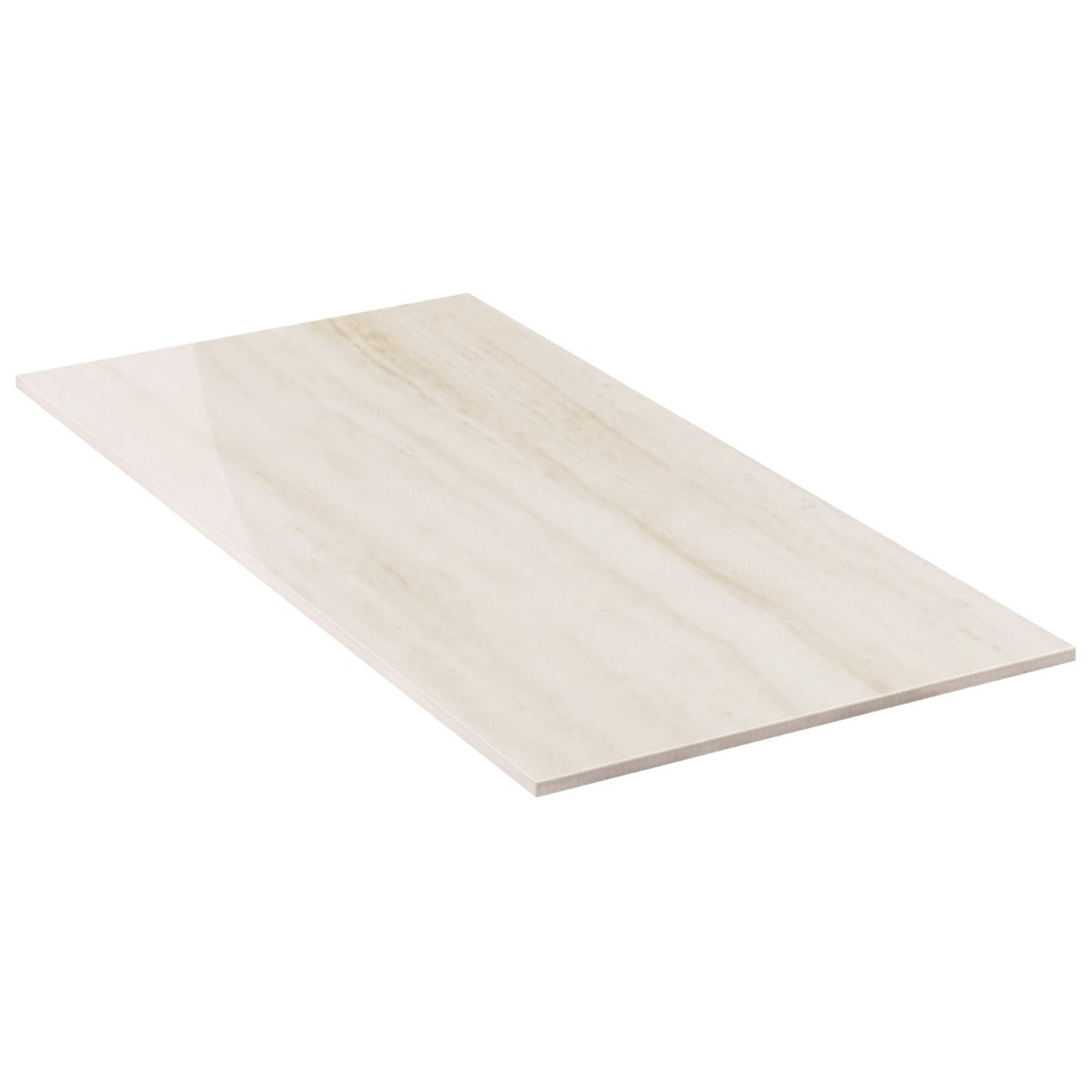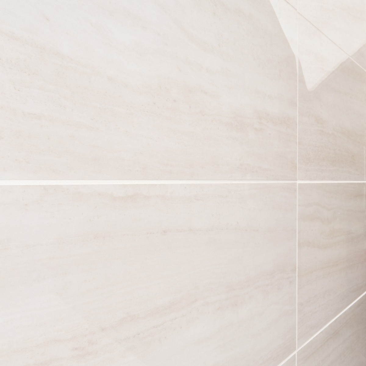The Nashville White Polished Porcelain Tile offers a sophisticated travertine look in a durable porcelain material. Its polished finish and large format make it ideal for both residential and commercial spaces, indoors and outdoors.