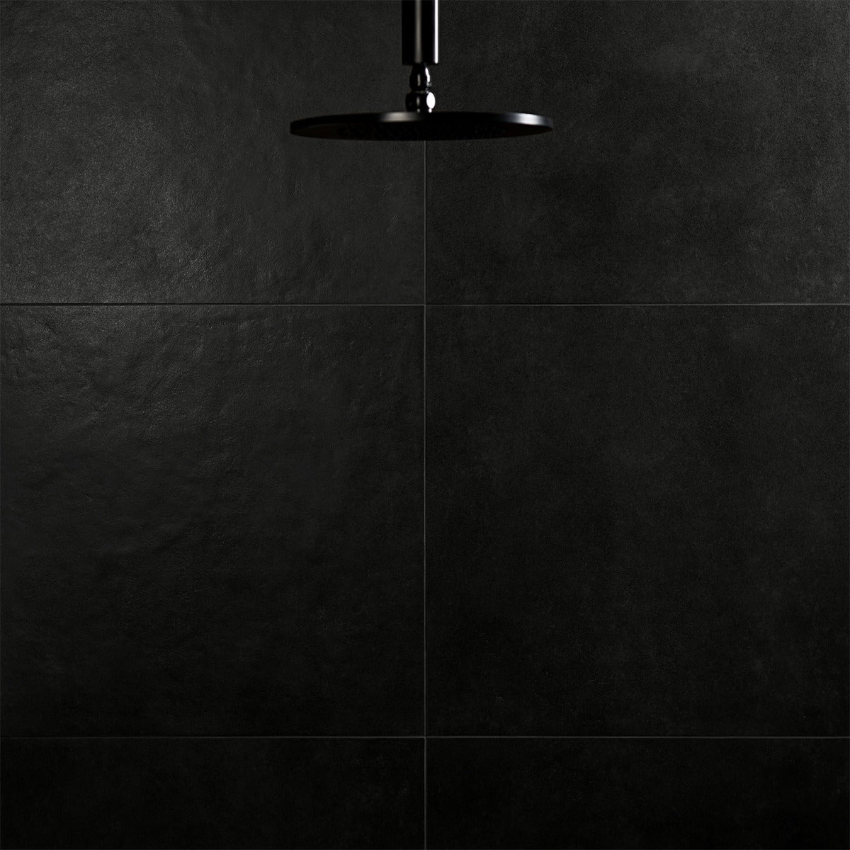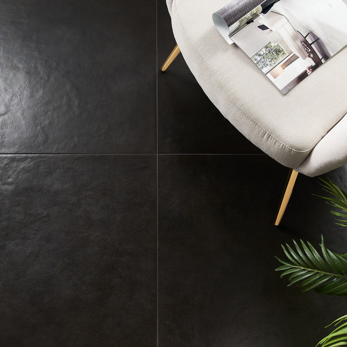The Rethink Leather Black Matte Porcelain Tile offers a sophisticated leather-like texture with a semi-polished matte finish. Its large 24x24 format minimizes grout lines, making it ideal for modern, seamless interiors.