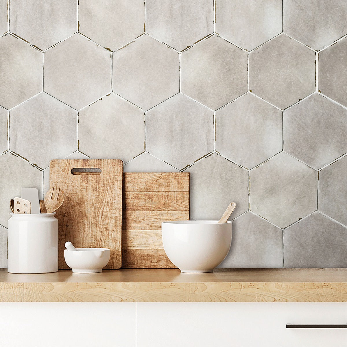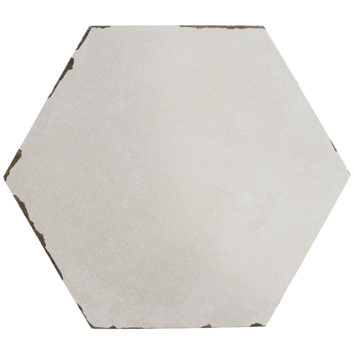 The Sasha Hex Taupe Porcelain Tile features a classic hexagon shape with a distressed, vintage look. Made in Spain, this durable and eco-friendly tile is perfect for kitchens, bathrooms, and pools.