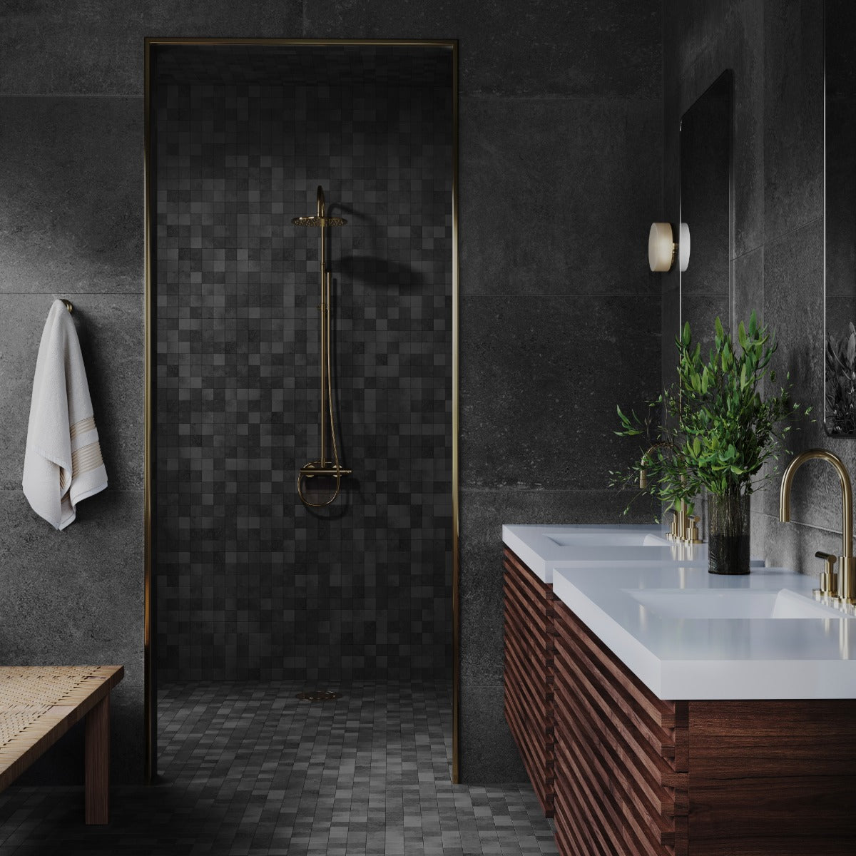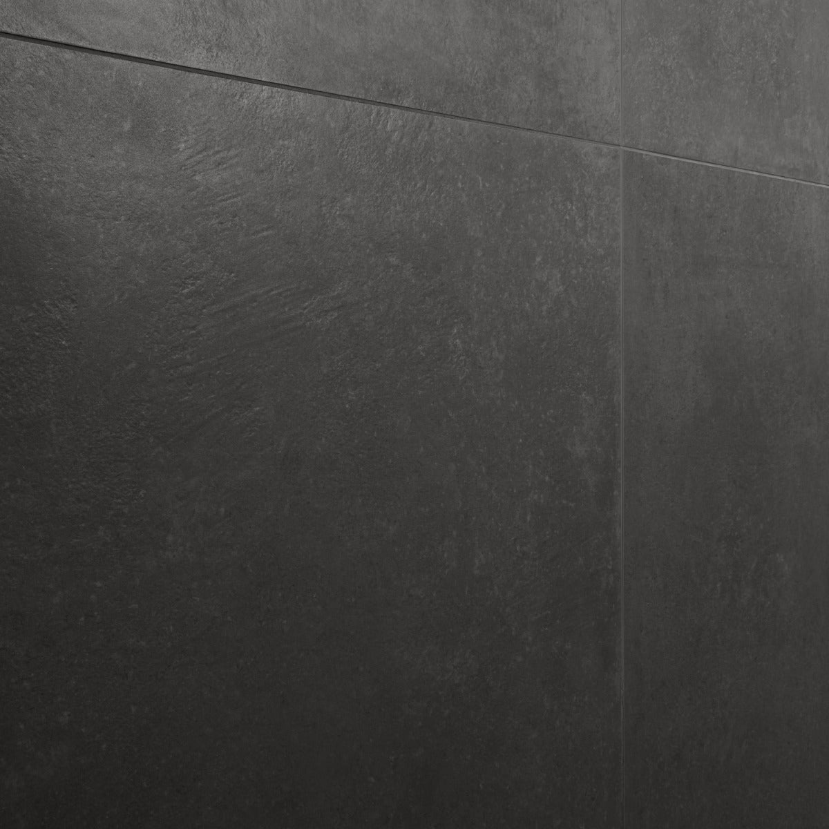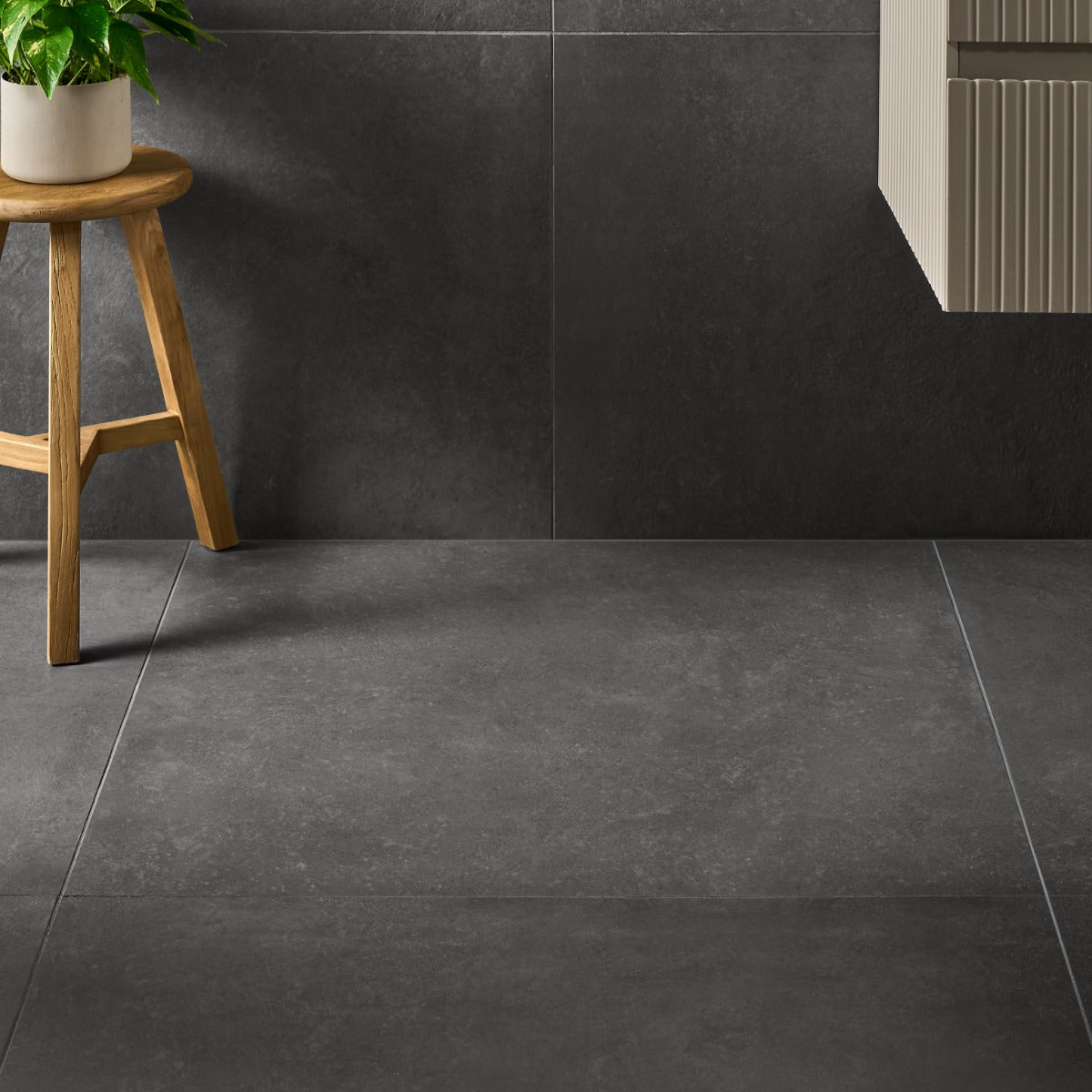 The Stoneside Charcoal Gray Matte Porcelain Tile offers a sleek, modern aesthetic with its concrete-inspired design and deep gray hue. Its oversized format minimizes grout lines, creating a seamless and spacious look.