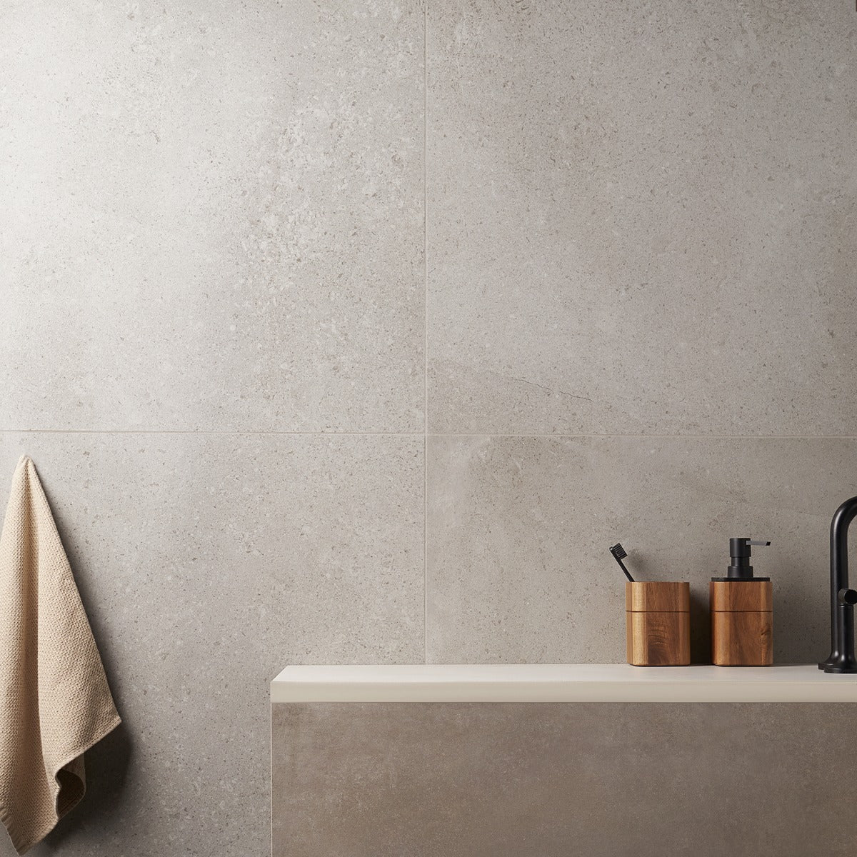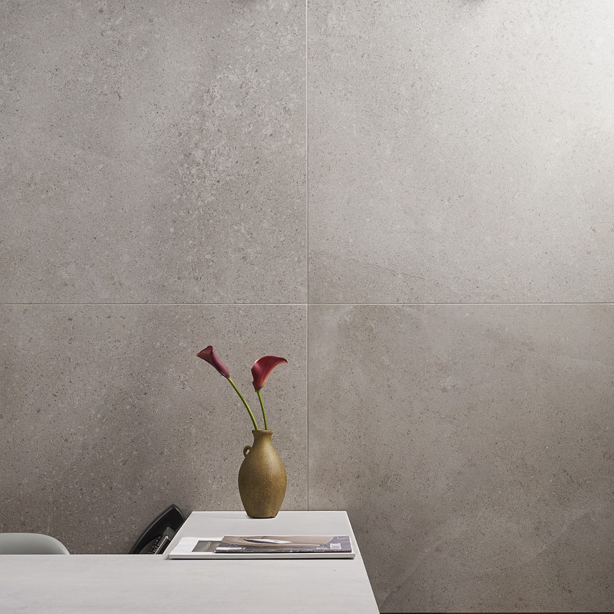 The New Rock Fumo Light Gray Tile offers a sophisticated limestone look with subtle veining, perfect for both residential and commercial spaces. Its matte finish and durable porcelain material make it ideal for walls and floors, indoors and outdoors.