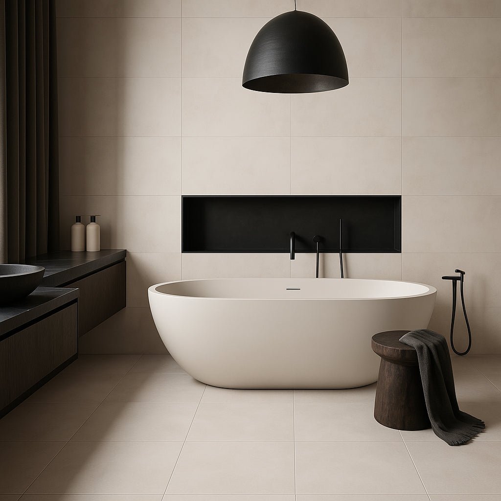 Transform your space with the Luxe Sand Matte Porcelain Tile, offering durability and a sleek cement look.