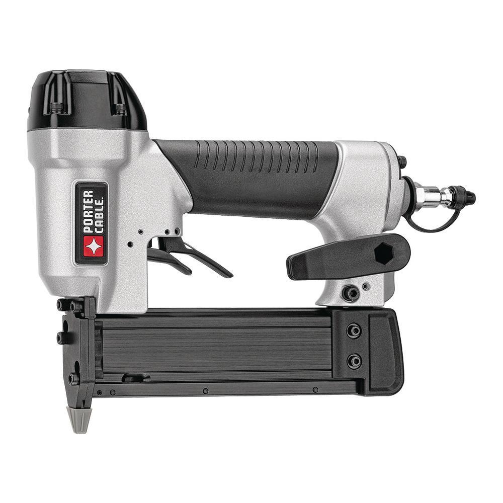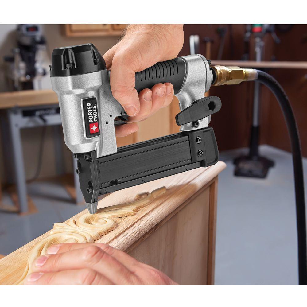 The Porter-Cable PIN138 pin nailer uses 23 Gal. headless and slight head pin nails from 5/8 in. to 1-3/8 in. length. It has a long life, maintenance free motor to keep from staining the work surface. It has consistent power and penetration to sink 1-3/8 in. nail sub-flush into Oak. It has a rear exhaust to keep contaminates away from work surfaces. It also incorporates a dry-fire lock-out that alerts user to re-load nails and eliminates empty nail holes. It has a narrow nose design with a removable non-marring nose tip with on tool storage space. The tool automatically adjusts for different fastener lengths for easier loading and less problems with pins out of spec. It has a convenient side-load magazine that holds 130 micro pin nails and a reversible belt clip to keep tool close to user. It also has an integrated rubber grip for improved comfort. Includes: nailer, 2000 pin nails of 3/4 in., 1/4 in. plug with cap, wrench and carrying case.
