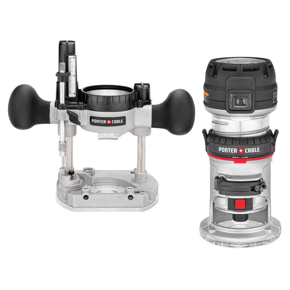 Durable and powerful to tackle you toughest routing applications, the Porter Cable 1-1/4 HP Compact Router with Plunge Base and Bag has a soft-starting motor with full-time electronic feedback that maintains motor speed throughout the cut. Compact and lightweight with overmold rubber handles for comfortable use and a secure grip, the large, low-pressure spindle lock button allows for single wrench bit changes, while the spring-loaded release tab allows for quick base removal. Featuring an adjustment ring that enables controlled bit depth changes to within 1/64 in., this router has a large plunge base for added stability for your heavier applications.