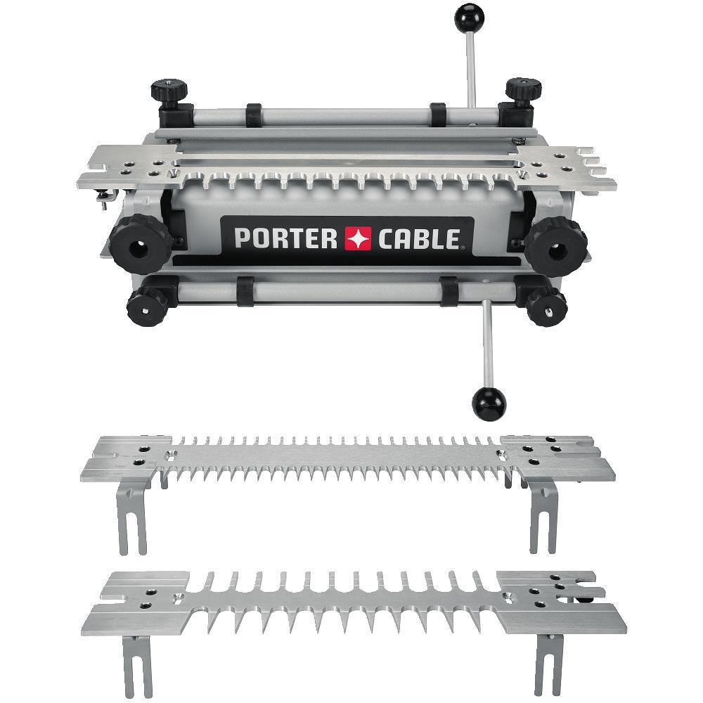 Ideal for woodworking, furniture and cabinet making, the Porter Cable 12 in. Deluxe Dovetail Jig Combination Kit is ideal for cutting a wide variety of joinery for drawers, boxes and furniture. Suitable for stock from 1/4 in. to 1-1/8 in. thick, this jig's heavy-duty cam-type clamps with sandpaper-backed locking bars provide a firm grip on wood. The machined aluminum templates provide superior cutting accuracy and long-lasting durability, while the router bit gauge lets you set bits depths without measuring. Easy to set up, the sturdy 1-piece steel base requires no assembly and conveniently clamps or bolts directly to your work bench.