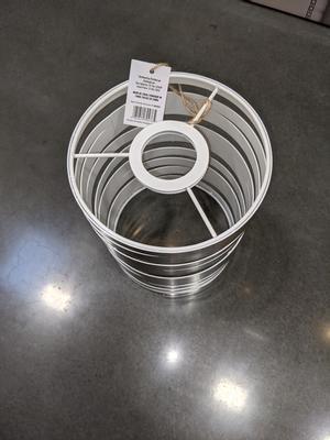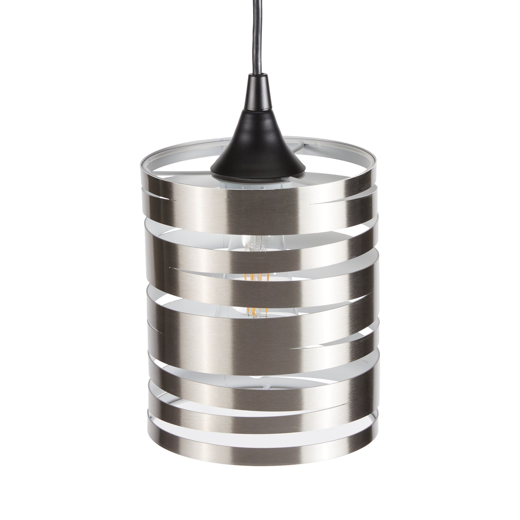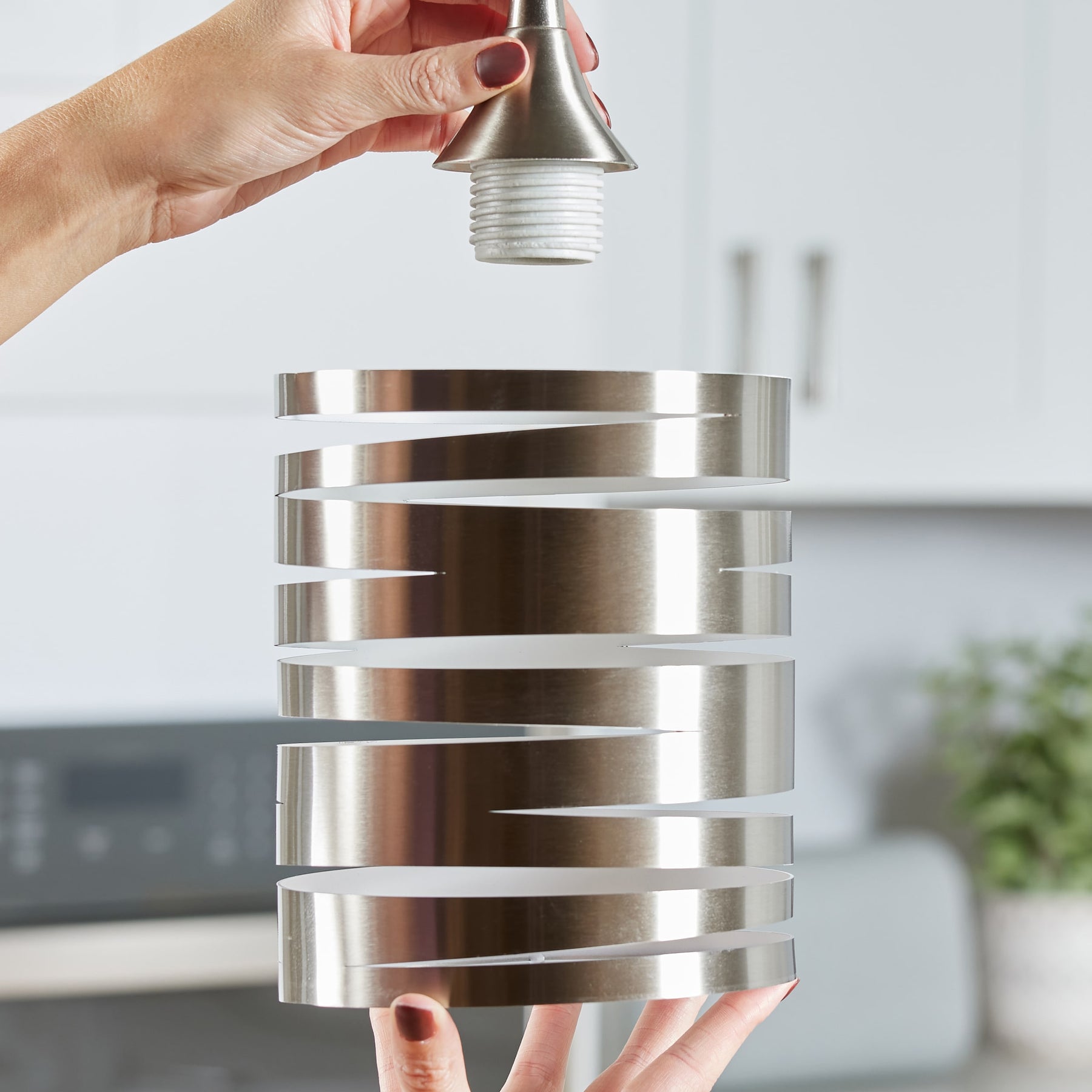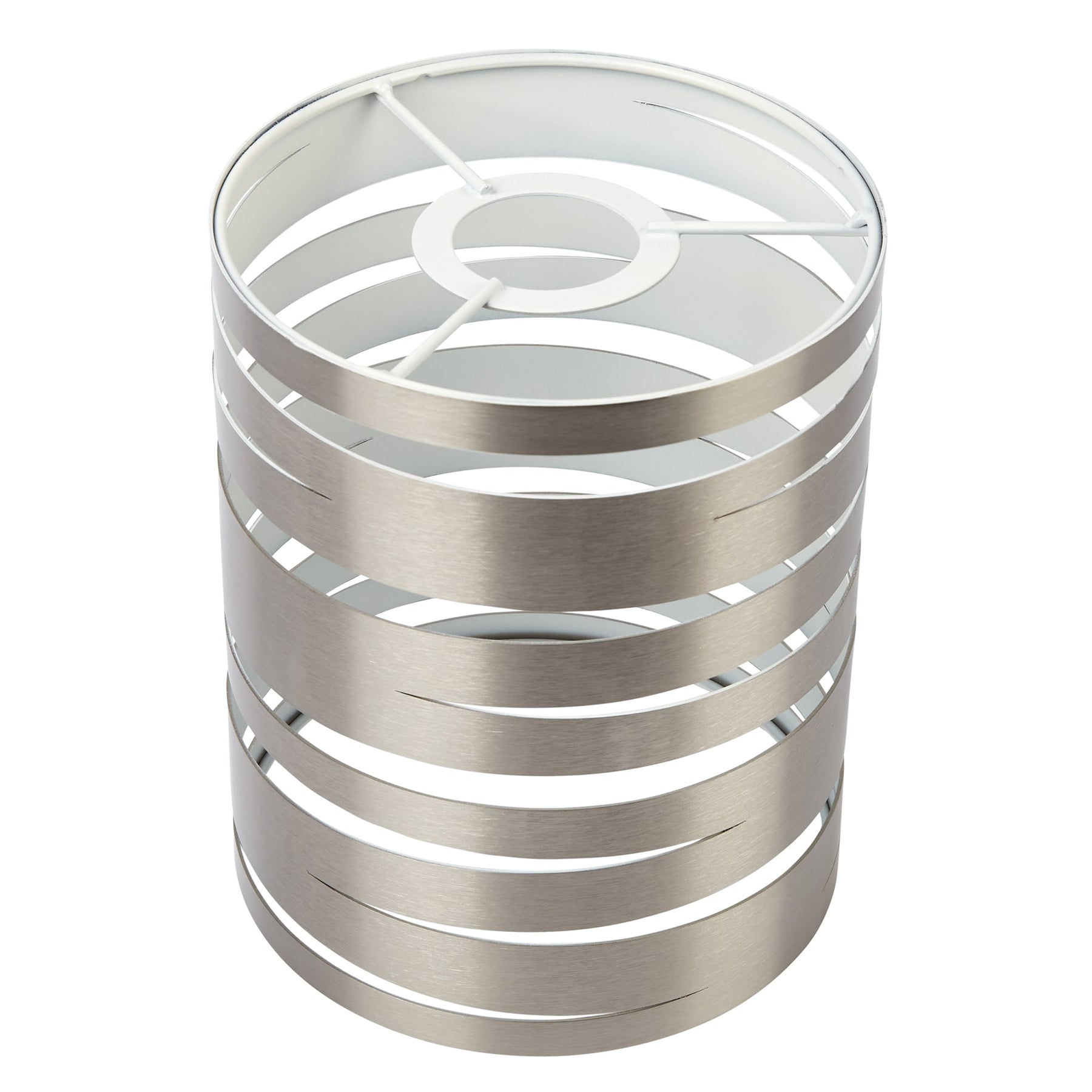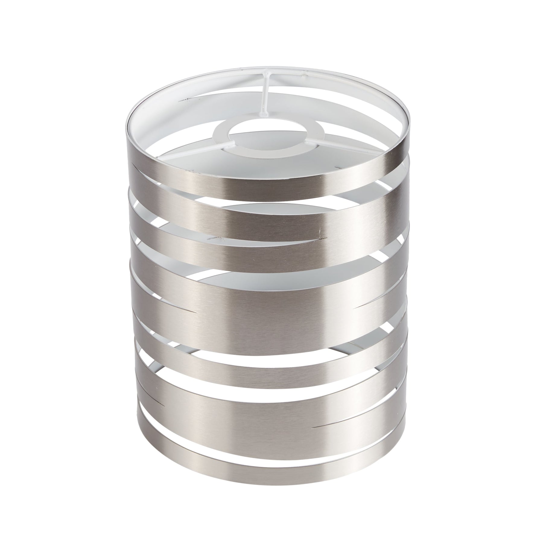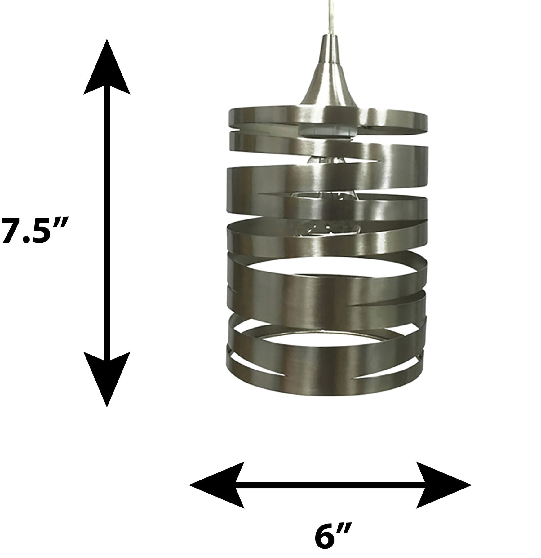 A modern brushed nickel metal shade with a spiral-cut cylinder design that refreshes pendants with contemporary flair. Sized at 7.5 inches high by 6 inches wide, it features a white interior to enhance light output and fits standard medium-base pendant fitters.