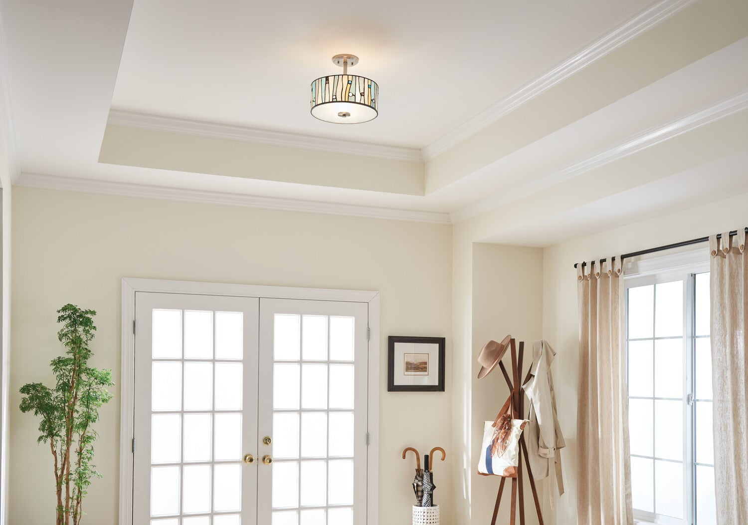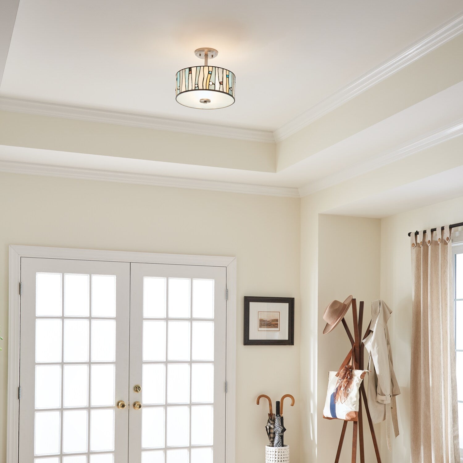 This 13-inch semi-flush mount pairs a brushed nickel finish with a Tiffany-style glass drum and etched diffuser for soft, inviting illumination. Hardwired and damp-rated, it’s ideal for hallways, bedrooms, or kitchens, using two medium-base bulbs for ample overhead light.