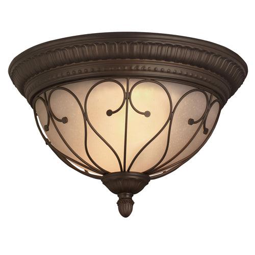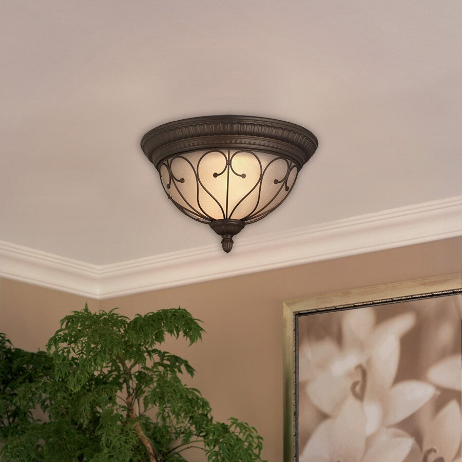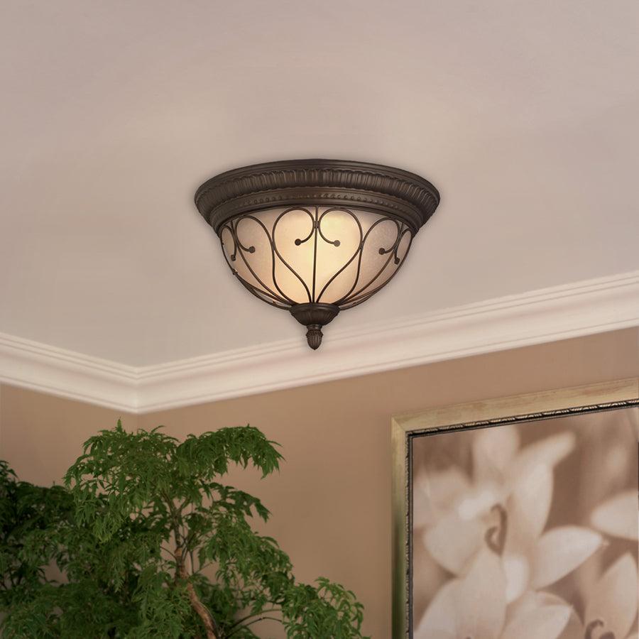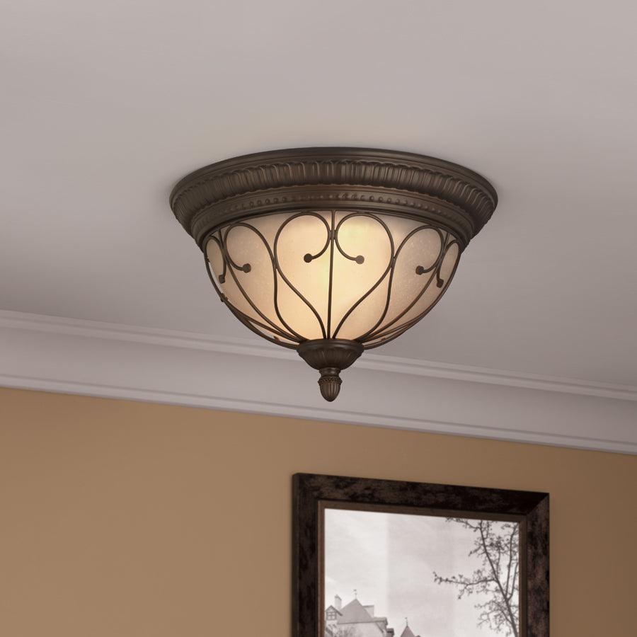 The Charton Place flush mount drapes the ceiling in graceful scrollwork, its oil-rubbed bronze frame tracing romantic curves around a veil of amber glass. The warm, dappled glow flatters every surface, coaxing depth and texture into the room. Style it over a cozy sitting area or along a corridor of framed art for a layered, mansion-like ambience. It’s a quietly lavish finishing touch that makes everyday living feel indulgent.