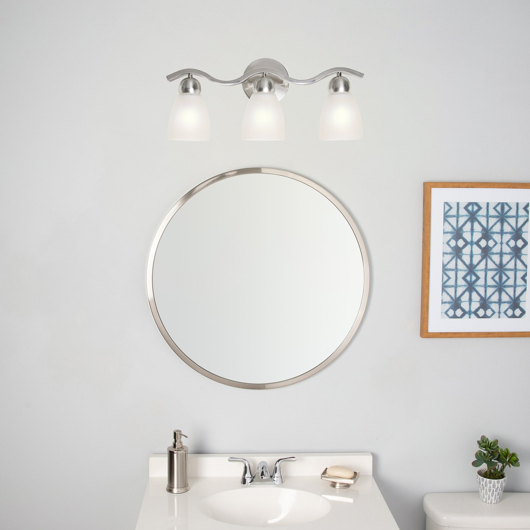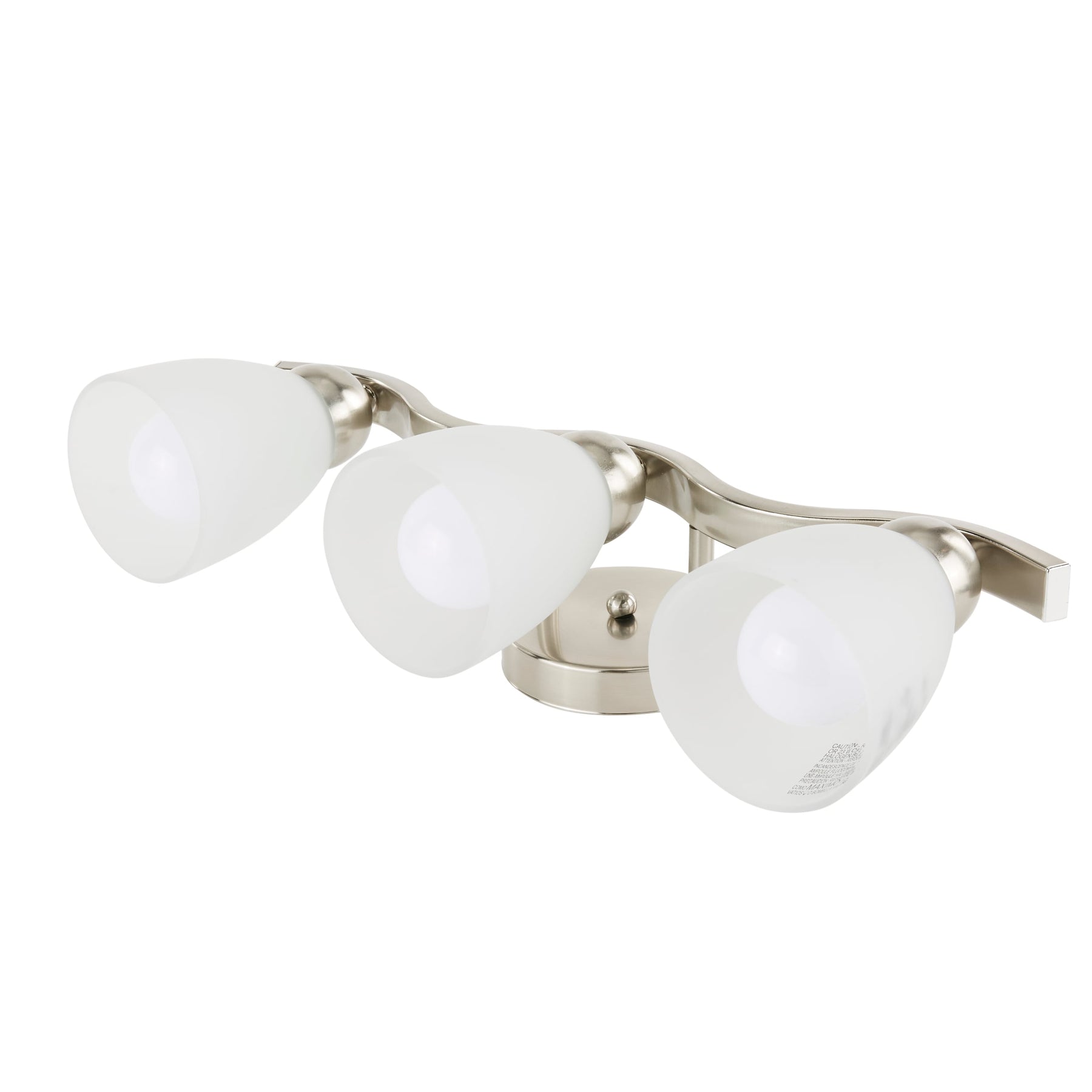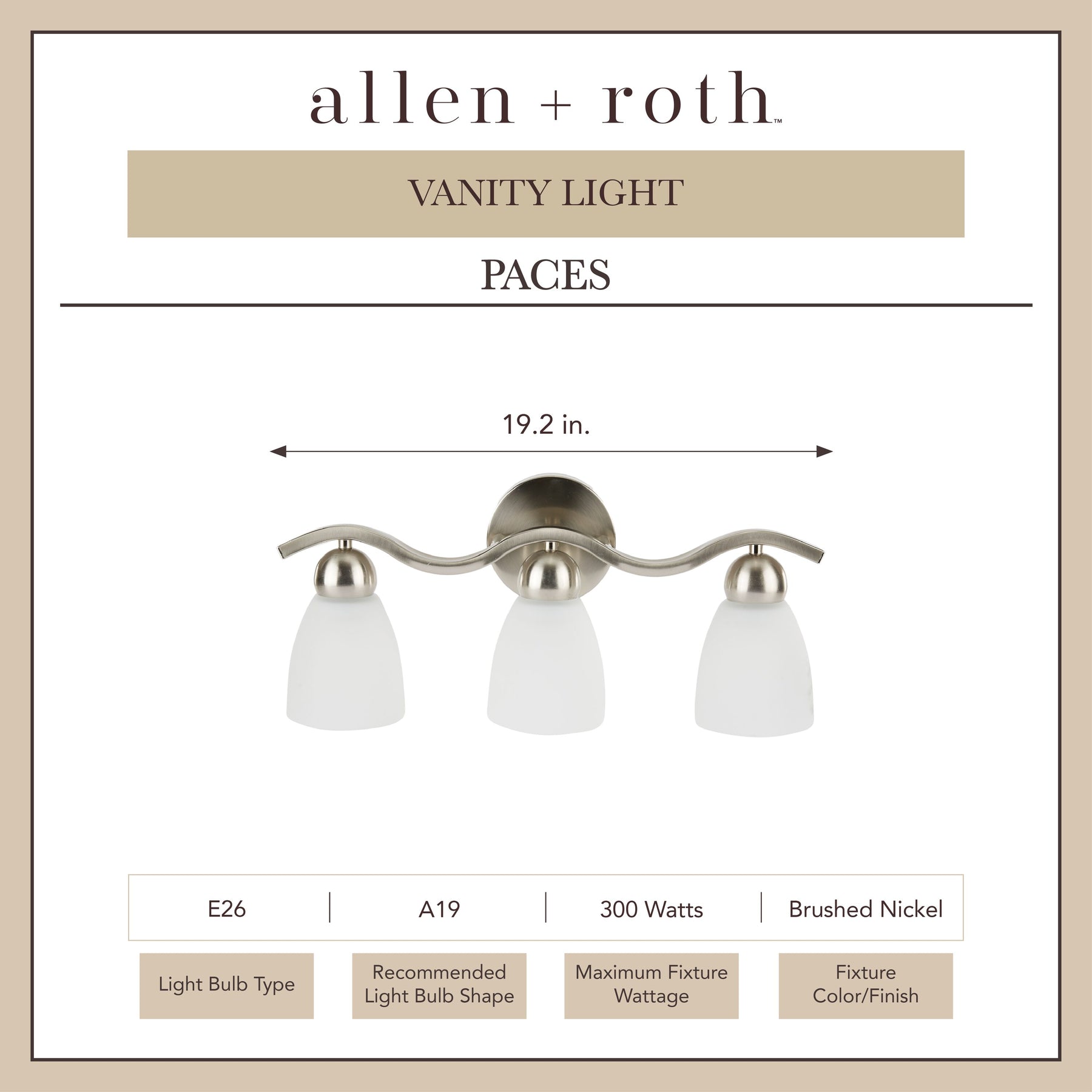 Elevate your bath with the Paces 3-light vanity fixture in brushed nickel, featuring softly etched marble-wash glass shades for a warm, diffused glow. Hardwired and dimmable, it supports three E26 A19 bulbs up to 100W each for versatile, modern illumination.