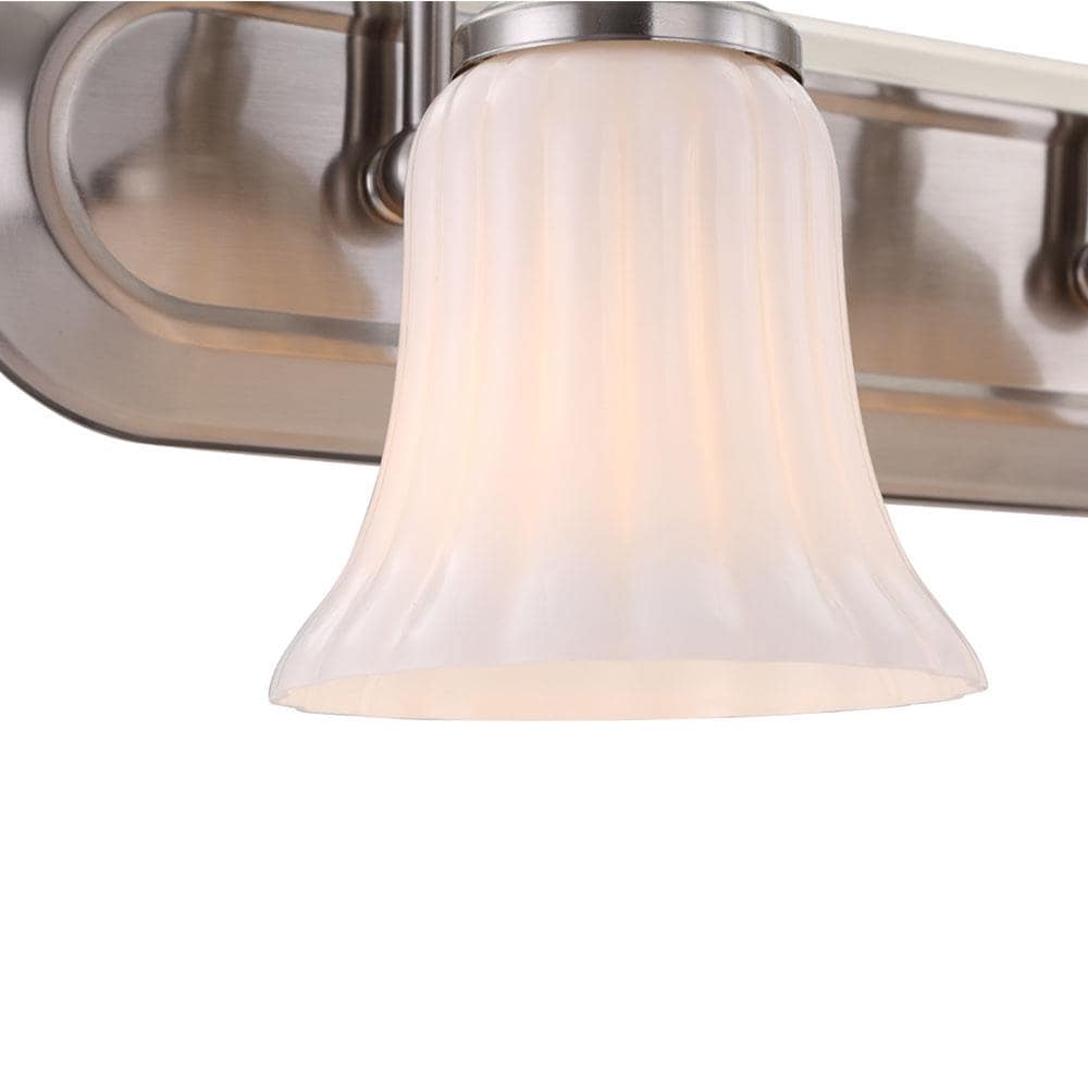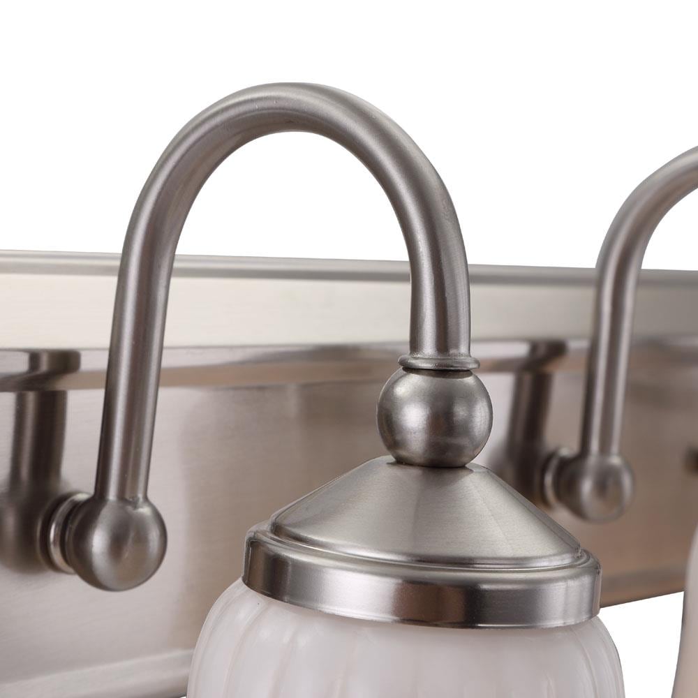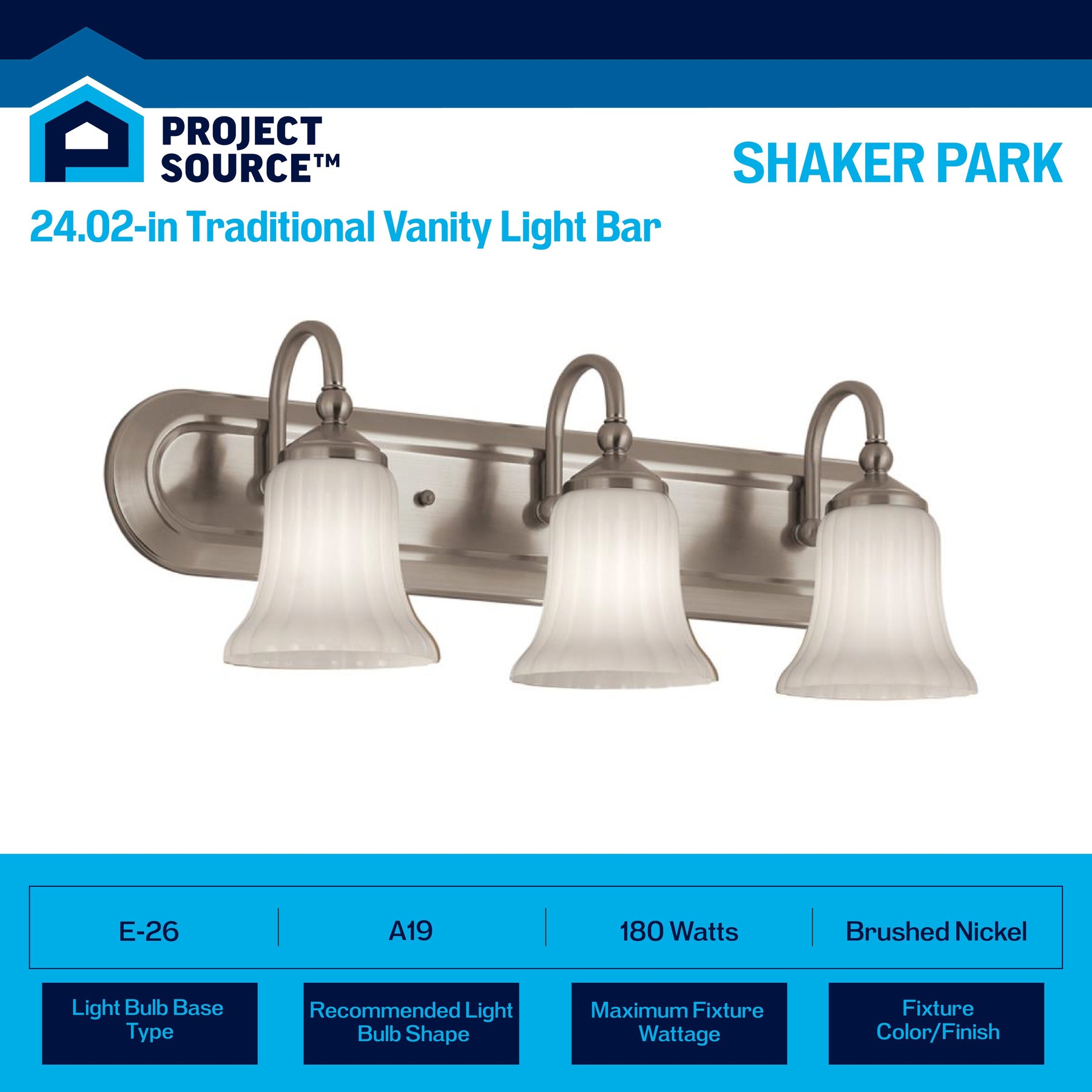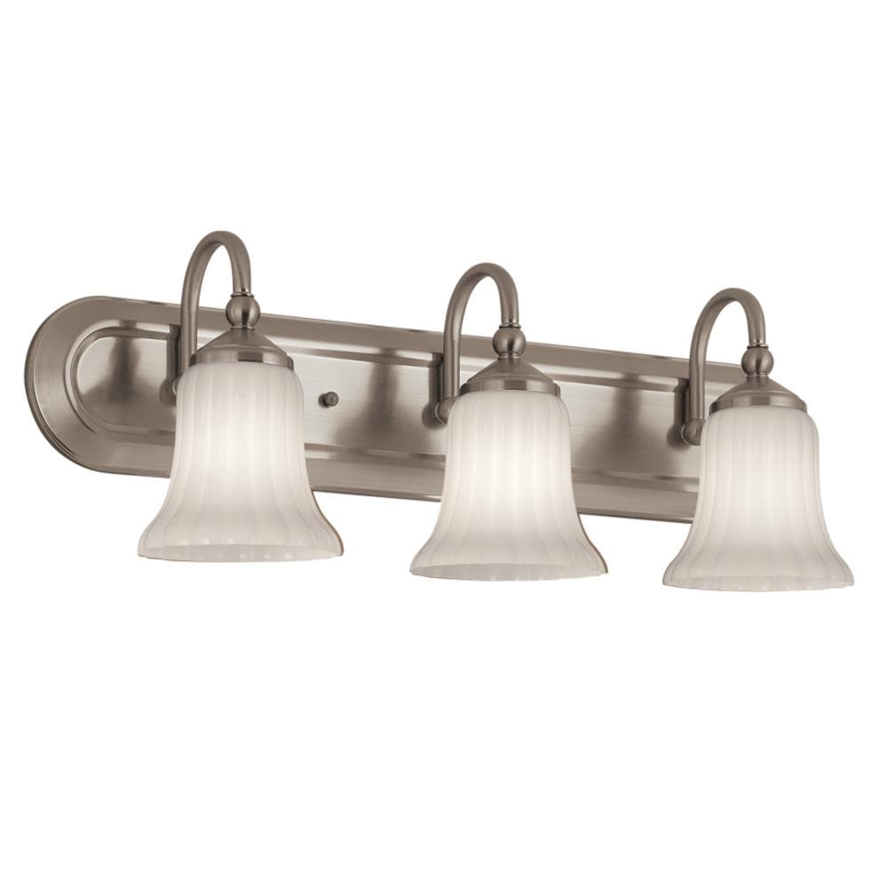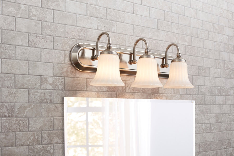 A traditional 3-light vanity fixture from the Shaker Park collection, featuring a brushed nickel finish and ribbed opal glass shades for a soft, even glow. Sized at 24.02 inches wide, it installs up or down and is ideal for bathrooms and powder rooms.