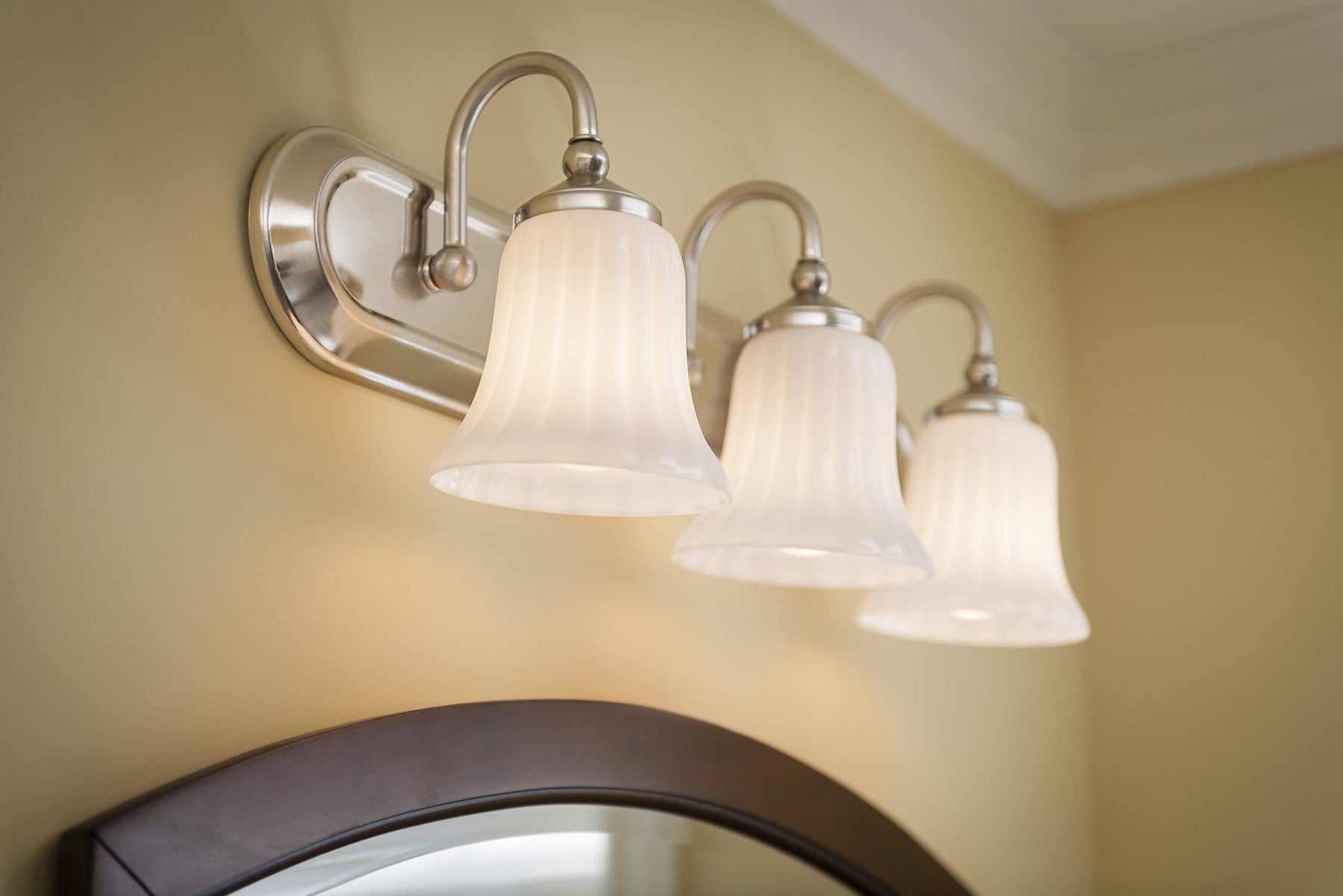 Shaker Park’s gently fluted opal glass casts a lyrical, velvety light that lifts any bath with poise. The brushed nickel arc and elongated backplate bring a timeless, tailored note to the room. Pair it above a simple framed mirror and let the ribbed globes echo subway tile for a chic, cohesive moment. It’s a refined essential that makes everyday rituals feel wonderfully luxe.