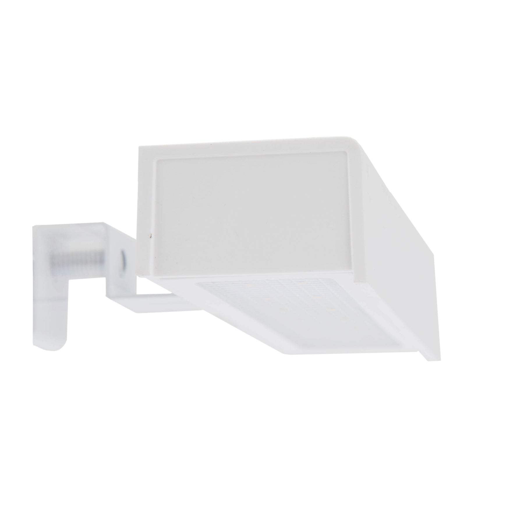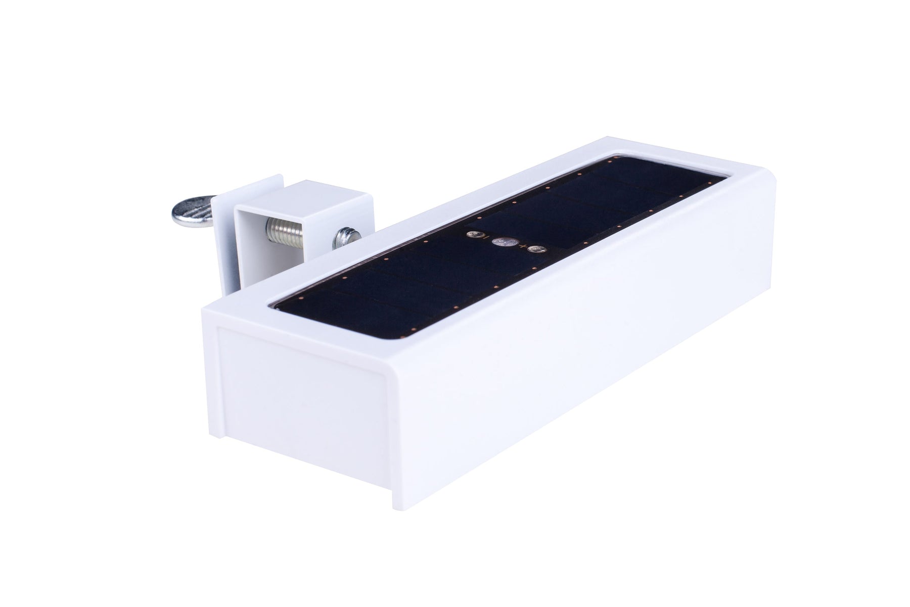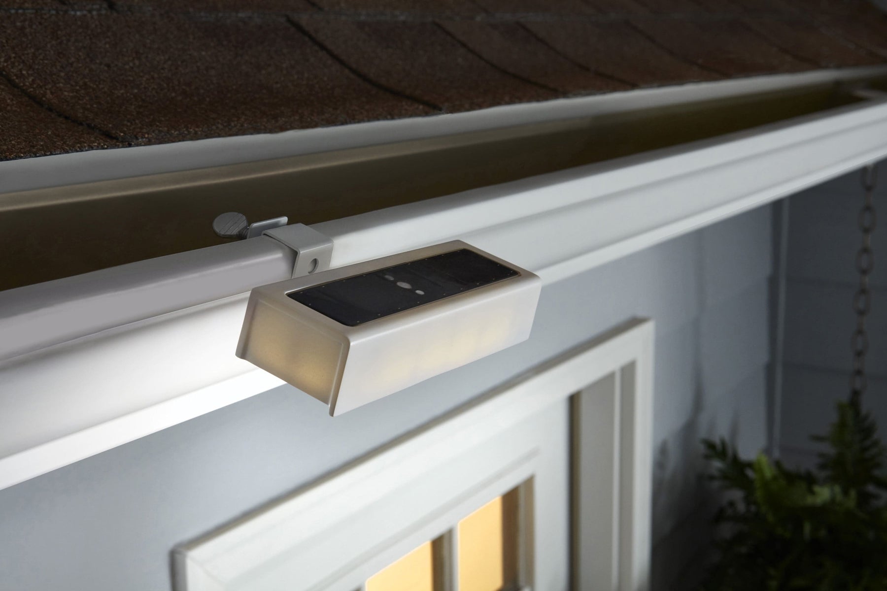 Compact solar-powered LED deck/gutter light delivers warm white illumination with dusk-to-dawn automation. Weather-resistant plastic housing in white mounts easily to gutters or railings to light pathways, patios, and entryways.