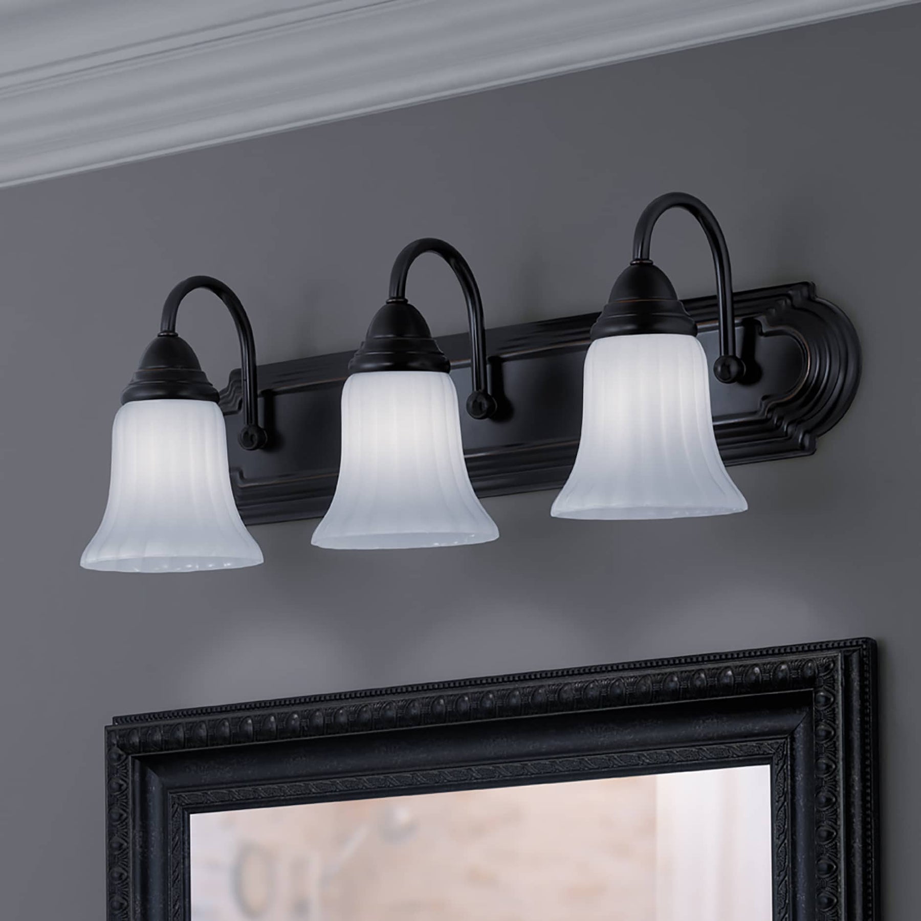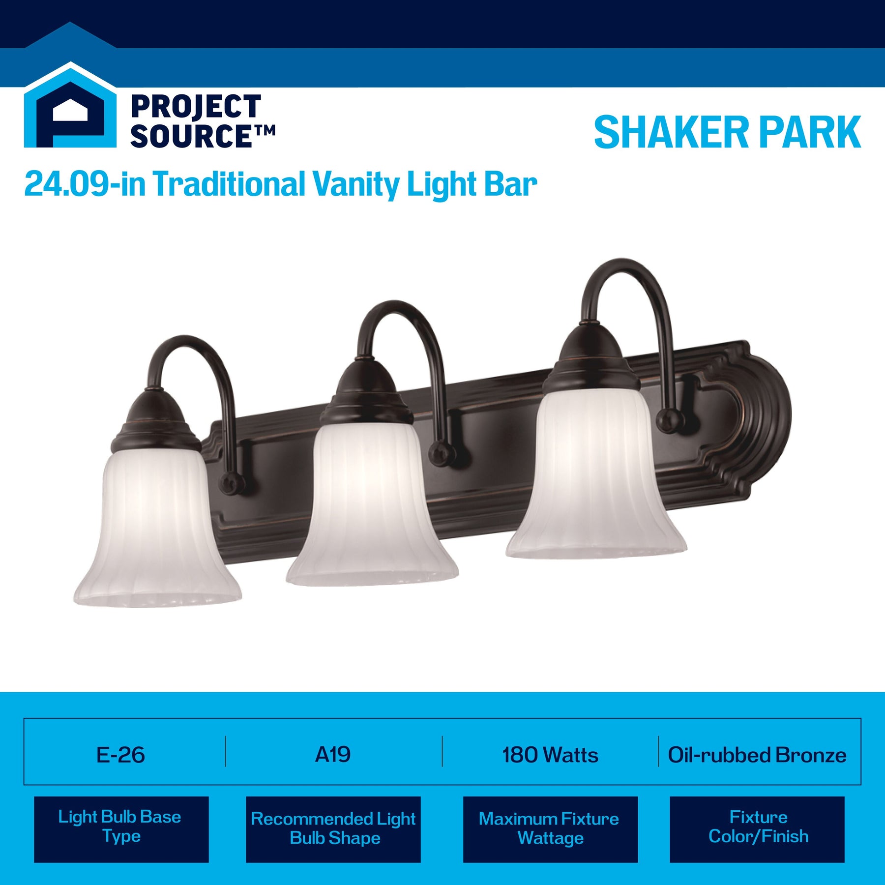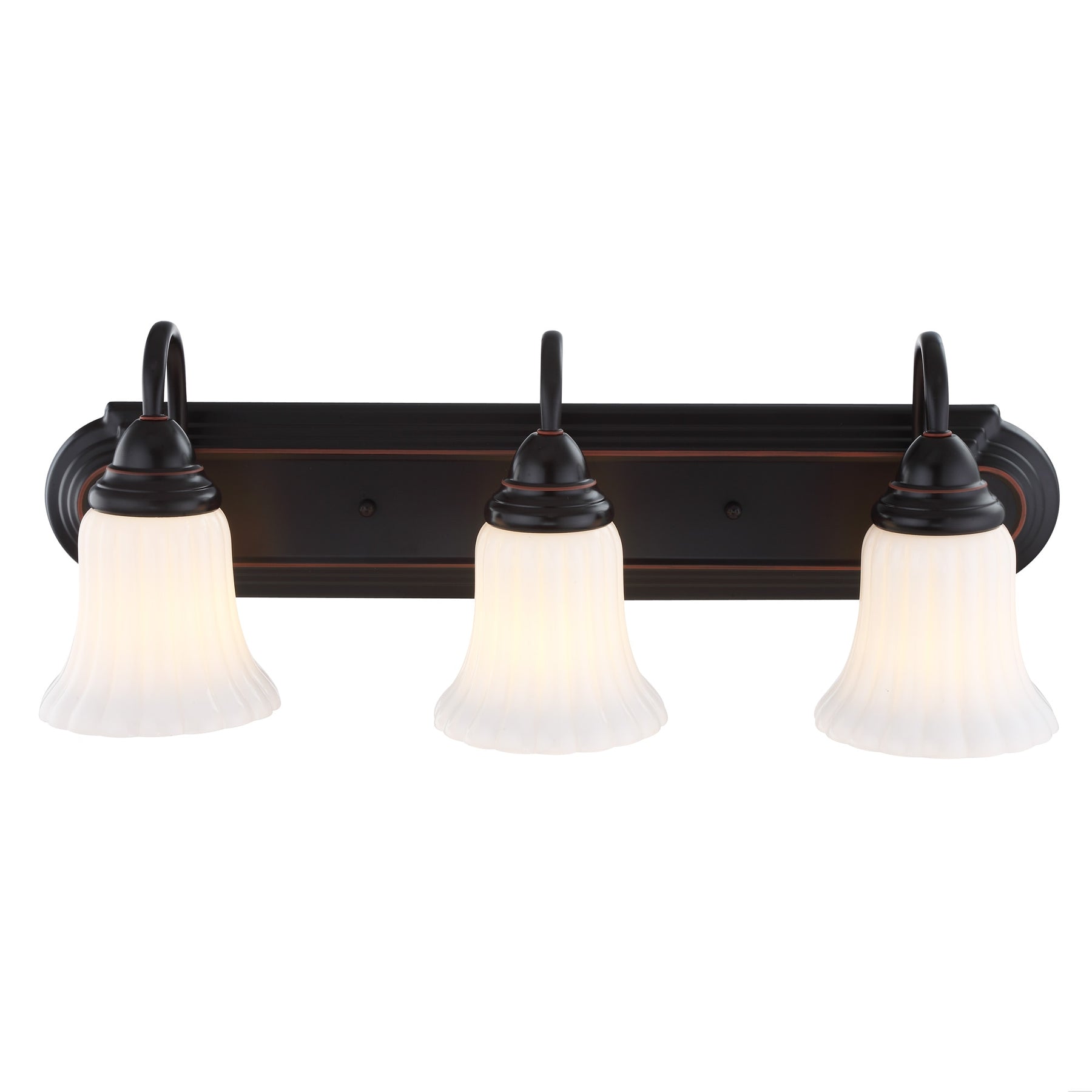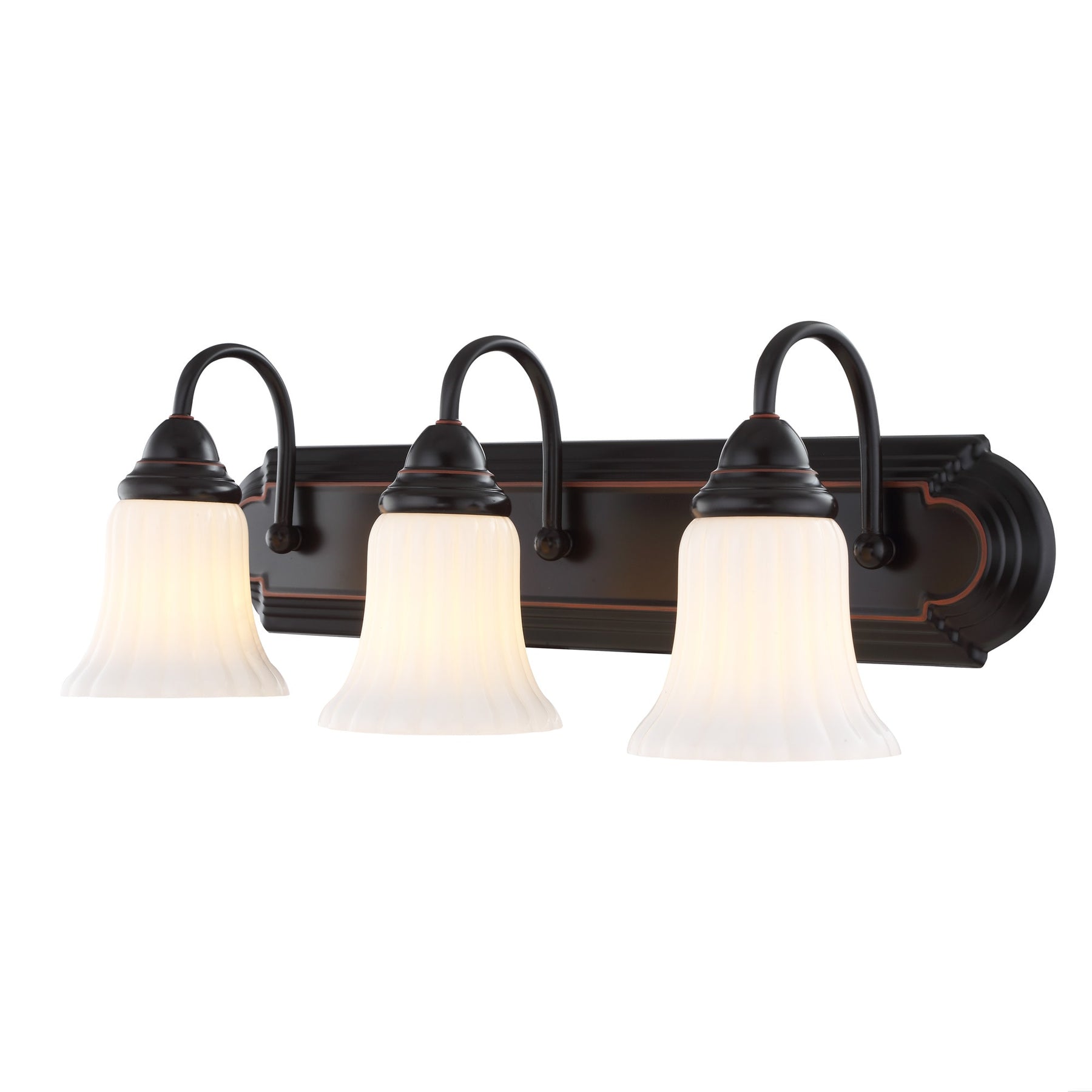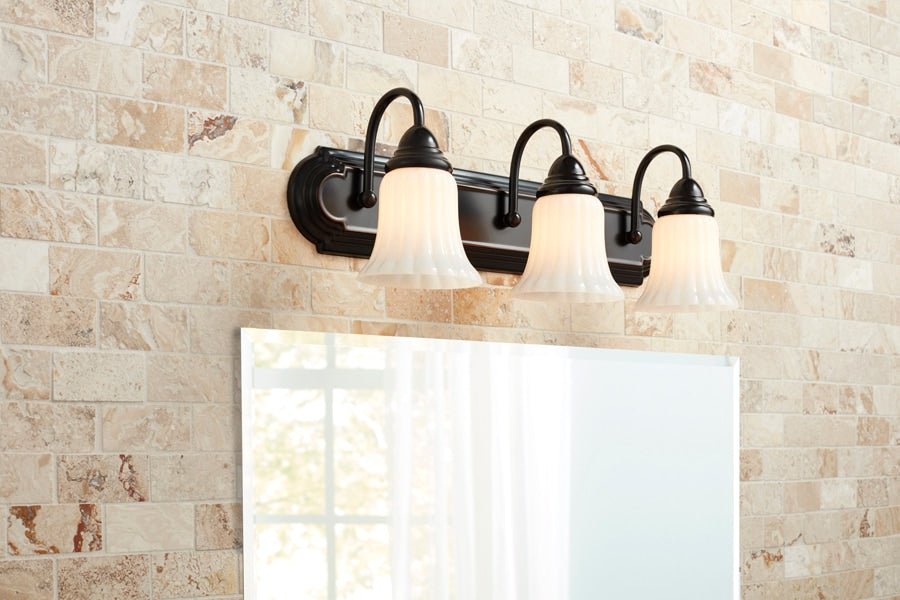 This traditional 3-light vanity fixture features an oil-rubbed bronze finish and white opal glass bell shades for a warm, even glow. At 24.09 inches wide, it’s ideal over small to mid-size bathroom mirrors and installs as a downlight for focused illumination.