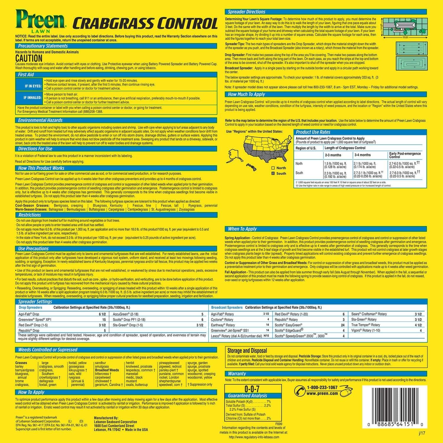 Preen Lawn Crabgrass Control prevents crabgrass and other grassy and broadleaf weeds for up to 4 months when applied prior to their germination in lawns and ornamental turfgrasses. It also provides post-emergence control of seedling crabgrass for up to 4 weeks after it germinates. Don't choose between killing and preventing—get both! Because it can be applied later in spring, Preen Lawn Crabgrass Control provides season-long control for some of the toughest weeds, including crabgrass, chickweed, henbit, yellow foxtail and spurge. Use it on many types of cool and warm season grasses, including bentgrass, fescues, kentucky bluegrass, ryegrass, bermudagrass, carpetgrass, St. Augustinegrass and zoysiagrass.