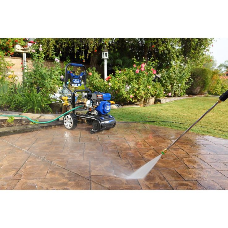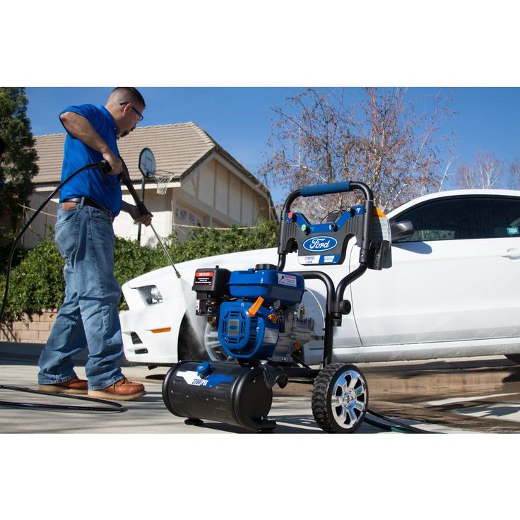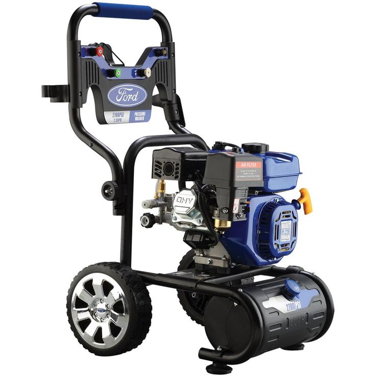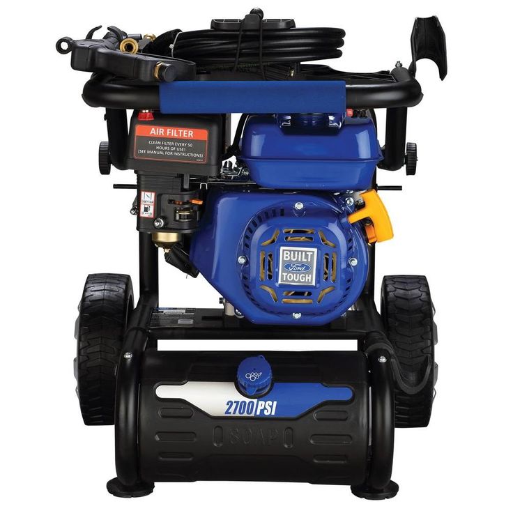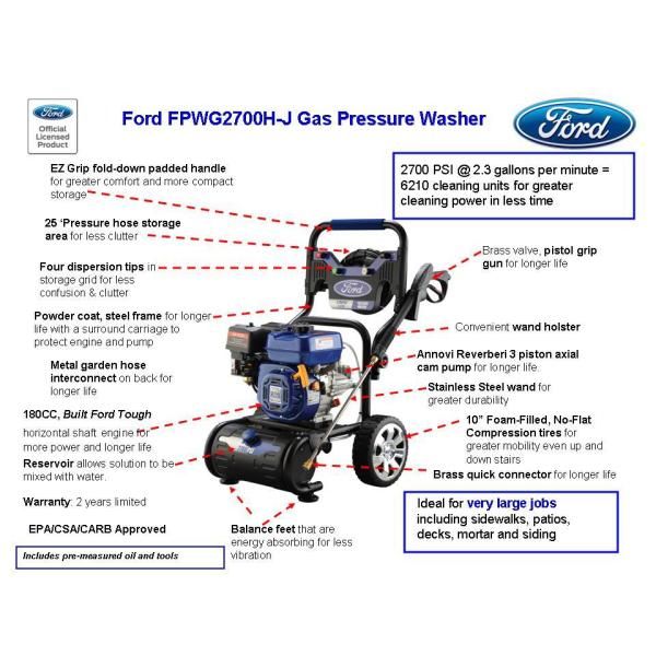 Ford pressure washers are Built Ford Tough and will provide years of quality cleaning service. The 2,700 psi high performance gasoline-powered pressure washer melds an 180cc, 5 HP OHV four-stroke, horizontal shaft gasoline engine with a three-piston axial cam pump to create 2,700 psi at 2.3 GPM (Gallons Per Minute) for 6210 cleaning units designed for more cleaning efficiency. The heavy duty 1-1/4 in. powder coated frame with foam grip handle ensures comfort and durability where it is needed the most while the oversized no-flat, pneumatic tires make this unit easy to take up and down stairs or inclines. The Ford 2700H includes a stainless steel wand and 25 ft. braided high pressure hose that can withstand high water pressure for long periods of time while four independent quick-connect dispersion tips including chemical, 0°, 25°, 40° that attach and remove easily. The 0° nozzle is designed for blasting caked-on mud from heavy duty equipment and removing rust from steel. The 25° nozzle is designed for general cleaning of roofs, gutters and light stains. The 40° nozzle is designed for light washing/rinsing of windows, walls, patios and driveways. The soap dispensing nozzle helps control a constant stream of chemicals to help with pre-washing most surfaces from an integrated oversized front-load dispenser that allows for longer work times without replenishment.