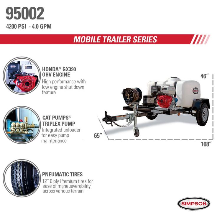 This powerful SIMPSON mobile pressure washing system will handle all your commercial jobs. It is perfectly suited for contract cleaners, mobile detailers, municipalities and resorts. The trailer is dot certified as an over-the-road pressure washer system. Job-Site set-up is a snap. Pull up to the work area, connect the spray gun, start the engine and begin cleaning.