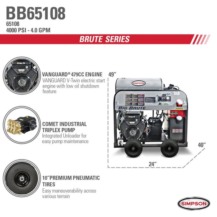 Regular price $5,340.00The Simpson Big Brute 4000 psi at 4.0 GPM hot water pressure washer powers through industrial cleaning applications. Industry experts rely on the Big Brute for enhanced cleaning power and efficiency. The BB65108 runs on a Vanguard V-twin engine and comes with a 50 hose, an ergonomic spray gun and 5 Quick Connect nozzles.