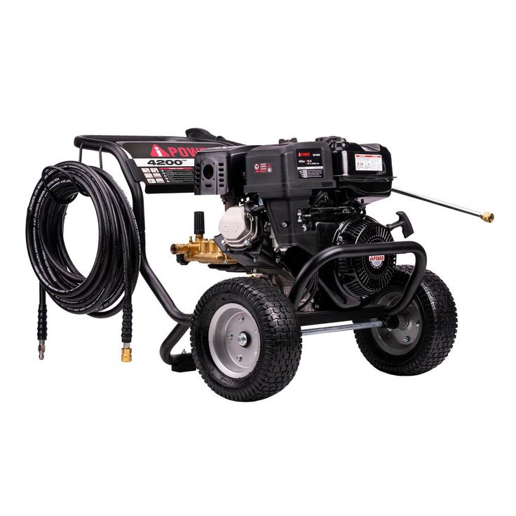 A-iPower Model PWF4200SH heavy Duty commercial grade pressure washer. 4,200 psi 4.0 GPM, Powerful 420cc OHV Engine and AR (Annovi Reverberi) brand Tri-Plex Pump Gas Pressure Washer. The A-iPower APW4200A is built to handle your toughest job. Powered by a reliable Senci 420 cc Heavy-Duty OHV gasoline engine that feeds into an AR (Annovi Reverberi) Brand Tri-Plex Brass Head Pump, it delivers a powerful 4,200 psi of cleaning power at 4.0 Gal. per minute, that's over 16,000 Cleaning Units to handle the toughest job. It is simple to use and perfect for cleaning driveways, sidewalks, walls, ideal for construction sites, can be used for the heavy industrial jobs as well as around your house. It features a durable, compact frame design and built-in large 12 in. never-flat wheels which provide easy transport. With the heavy-duty 50 ft. non-marring long-reach high pressure hose, its flexibility provides easy access. With its quick connect stainless steel spray wands and nozzles and the ergonomic grip handle, the A-iPower APW4200A pressure washer allows you to operate efficiently and effortlessly. For added convenience, the pressure washer comes with an on-board accessory storage panel, includes 5 quick connect nozzles for versatile cleaning options.