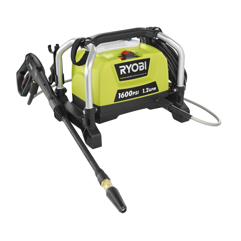 Compact yet powerful, this RYOBI electric pressure washer delivers 1,600 PSI and 1.2 GPM for effective cleaning of decks, driveways, siding, and vehicles. The included 12 in. surface cleaner helps quickly remove grime from large flat areas while the portable frame and onboard storage keep everything organized.