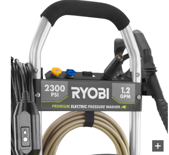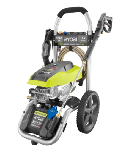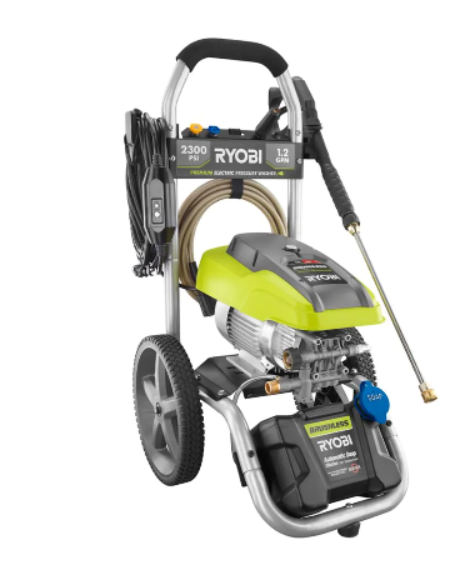 This reconditioned RYOBI electric pressure washer delivers up to 2,300 PSI at 1.2 GPM for fast, effective cleaning of driveways, decks, siding, and more. A brushless induction motor and on-board detergent tank provide powerful, reliable performance with convenient soap application.