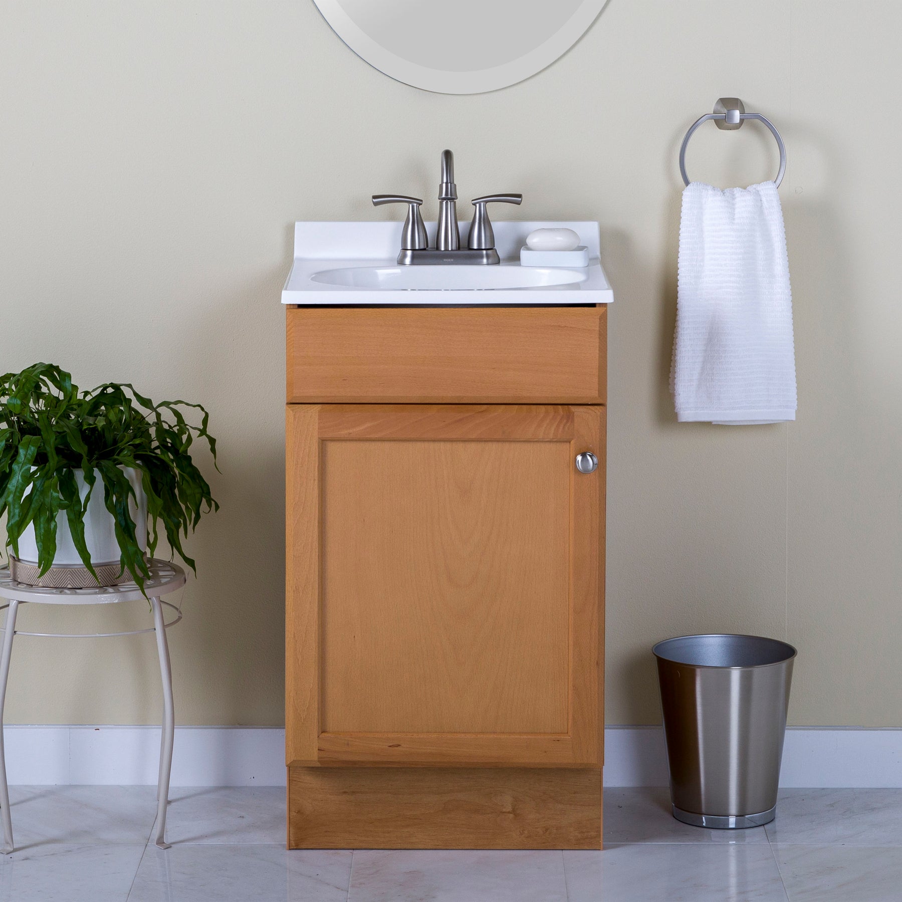 This petite vanity introduces a golden, sunlit warmth that instantly brightens a tight bath. The cultured marble top’s gentle curves and integrated bowl feel crisp and tailored, balanced by a simple recessed-panel door and brushed nickel hardware. Pair it with a round mirror and soft white linens to echo the clean lines and luminous palette. It’s a small-scale piece that delivers a polished, luxurious touch to daily routines.