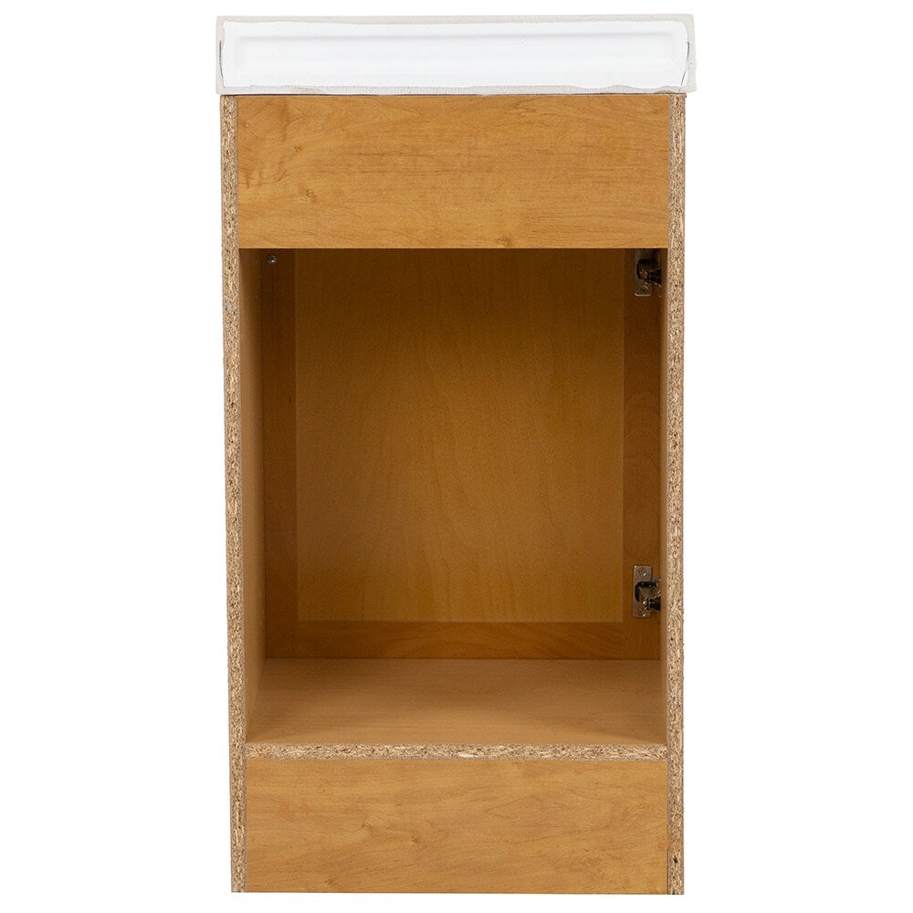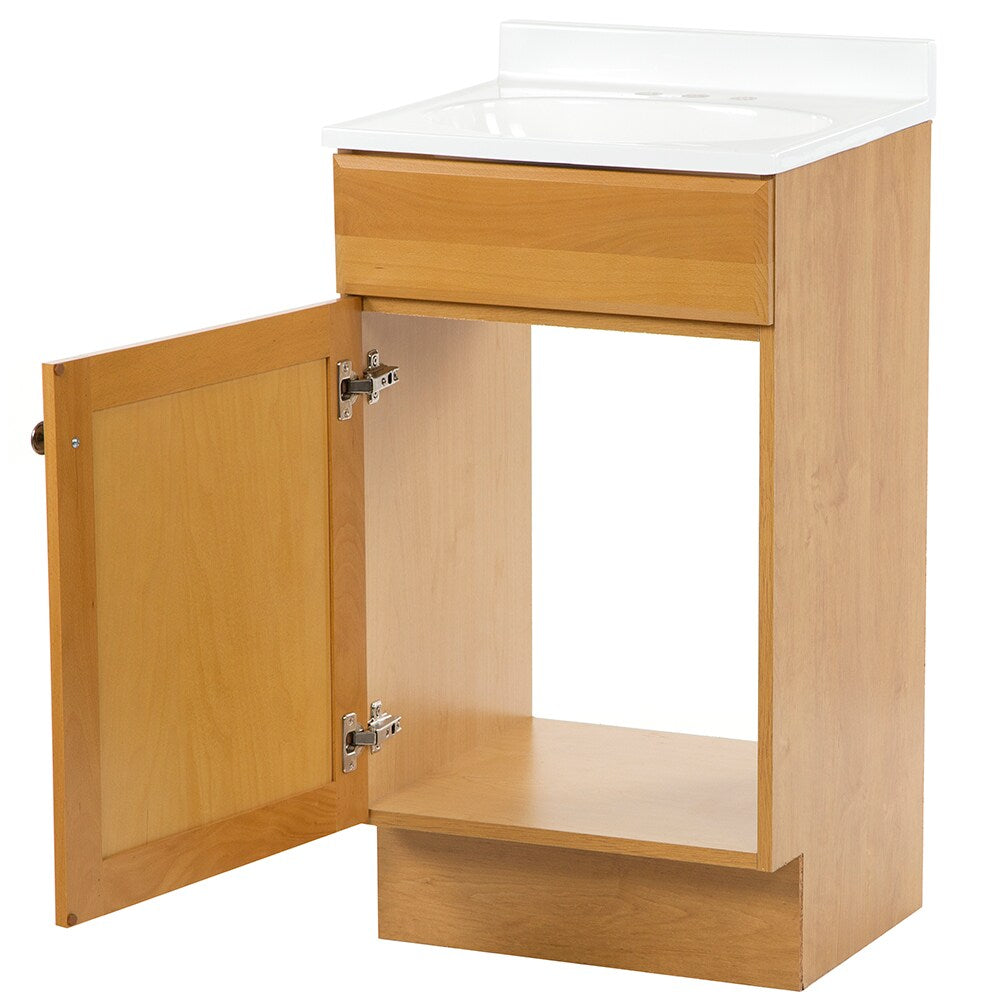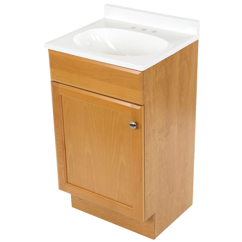 Compact, freestanding vanity with a golden oak finish and integrated white cultured marble top and sink. Ideal for small baths, it offers a clean, one-piece design with center-set faucet compatibility and interior storage behind a recessed panel door.