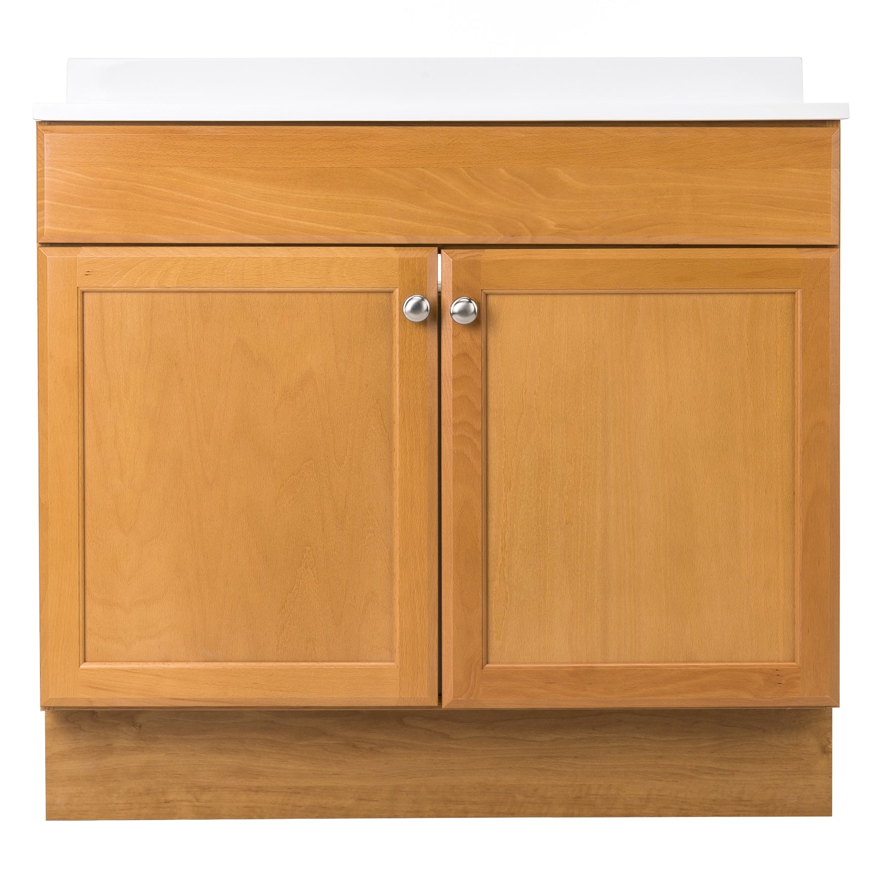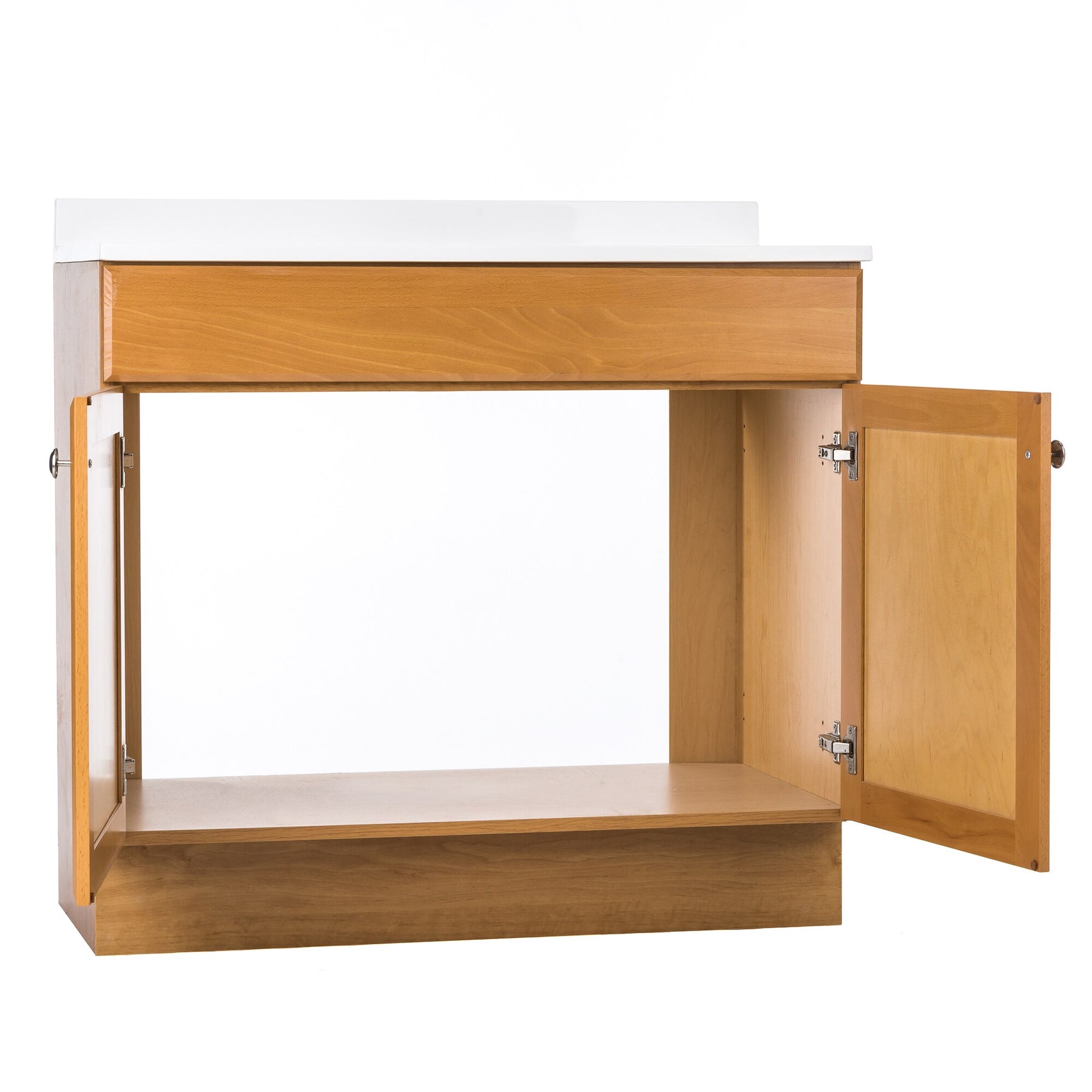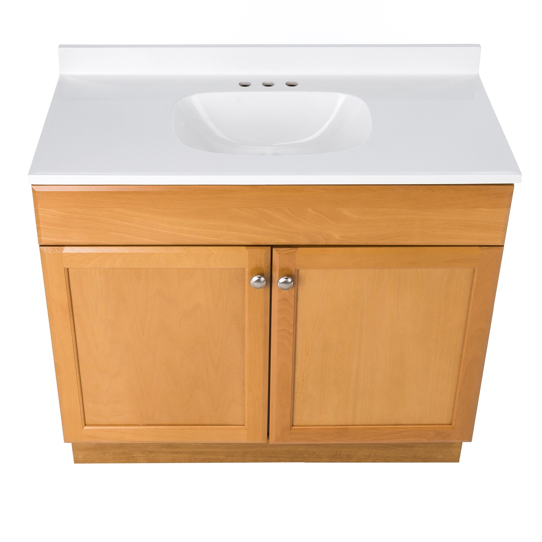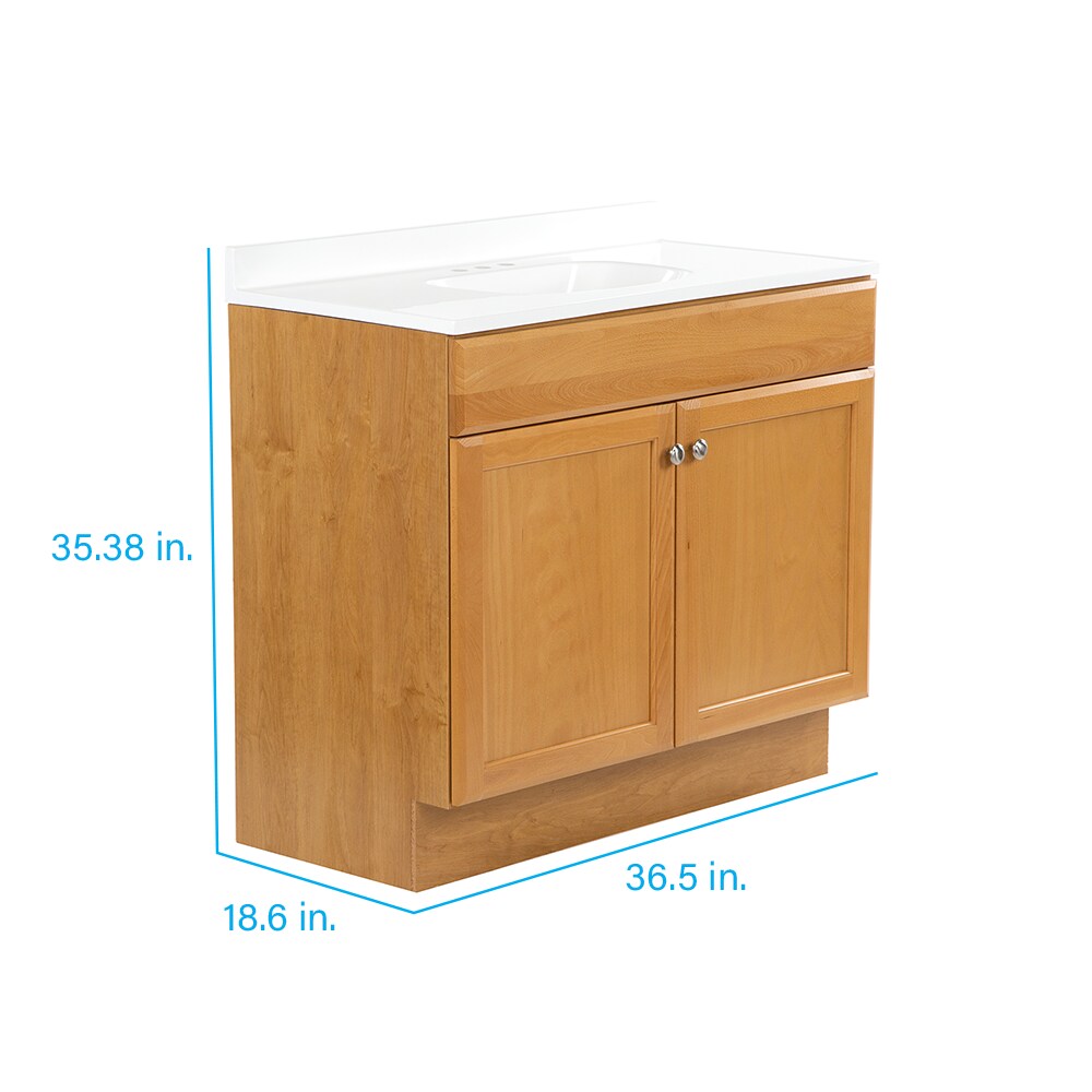 Upgrade your bath with this freestanding Project Source vanity featuring a Golden stained finish and a seamless white cultured marble top with integrated oval sink. At 36.5-in W x 18.6-in D, it arrives fully assembled with brushed nickel hardware and two recessed-panel doors for easy, concealed storage.