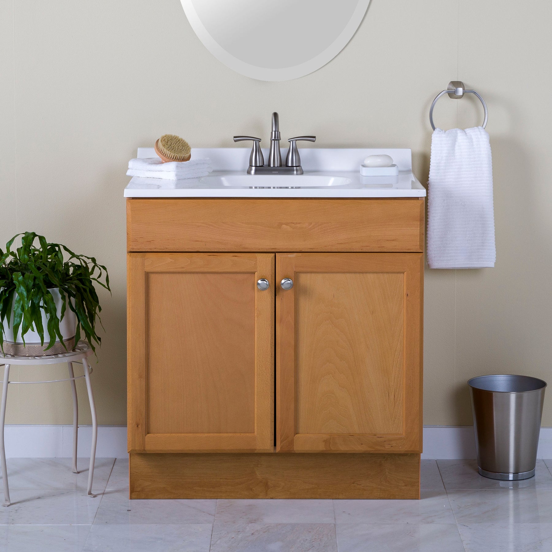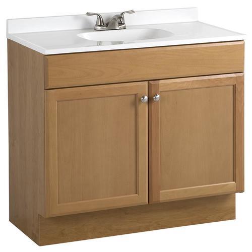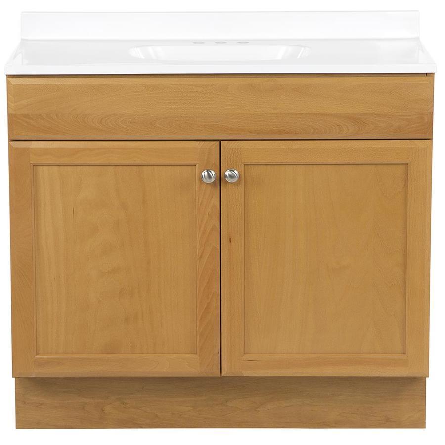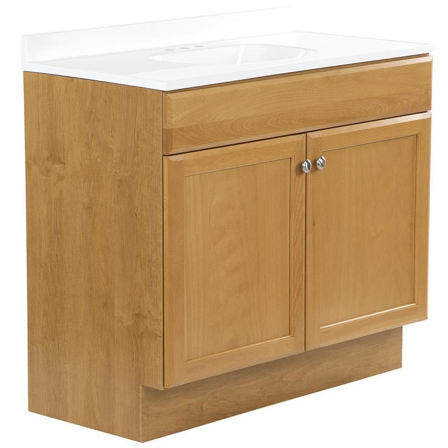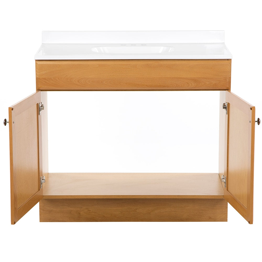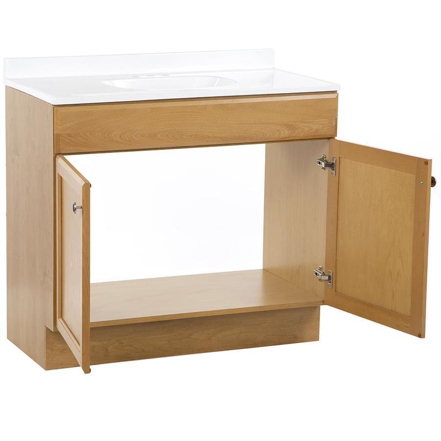 Upgrade your bath with this freestanding Project Source vanity featuring a Golden stained finish and a seamless white cultured marble top with integrated oval sink. At 36.5-in W x 18.6-in D, it arrives fully assembled with brushed nickel hardware and two recessed-panel doors for easy, concealed storage.