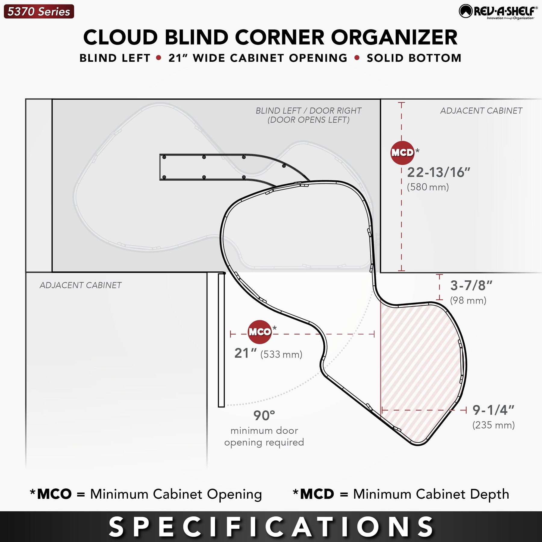 • Blind Corner Optimization: Designed for blind left cabinets with right-hinged doors and a 21-in opening for full-access storage