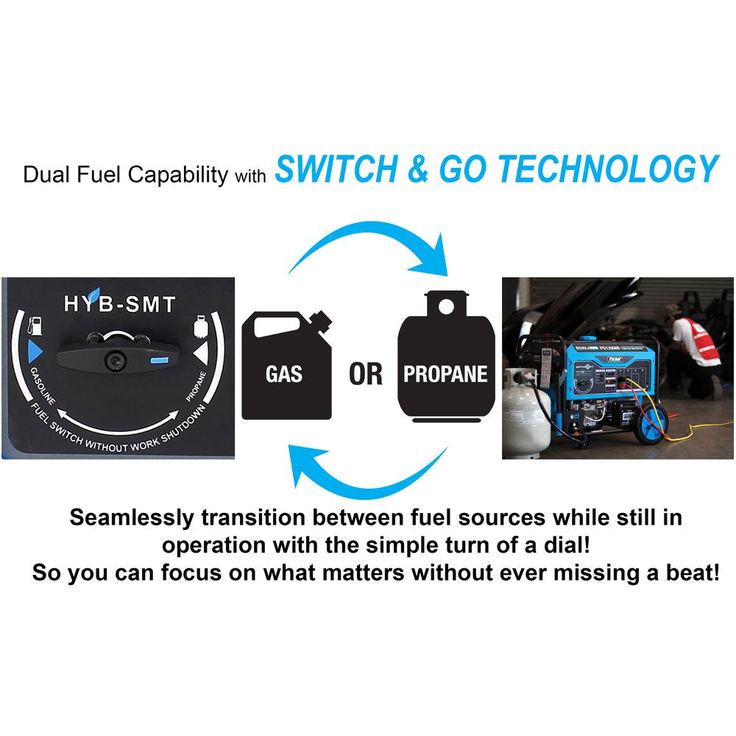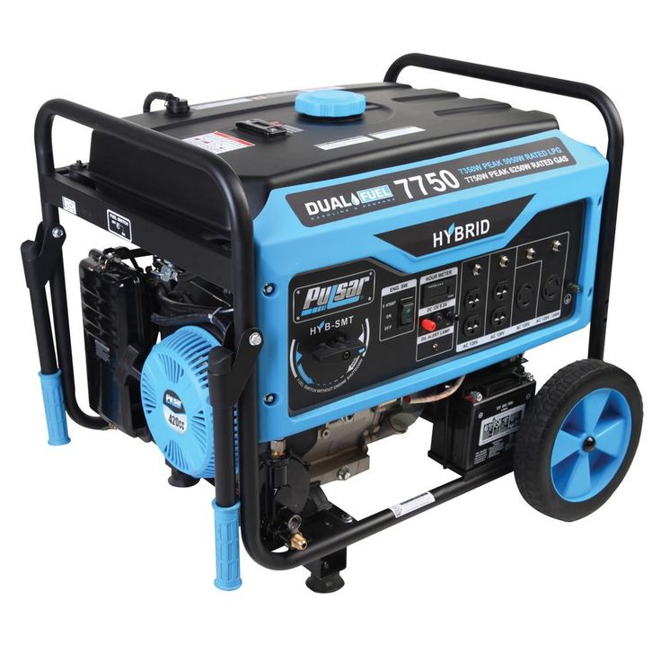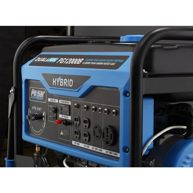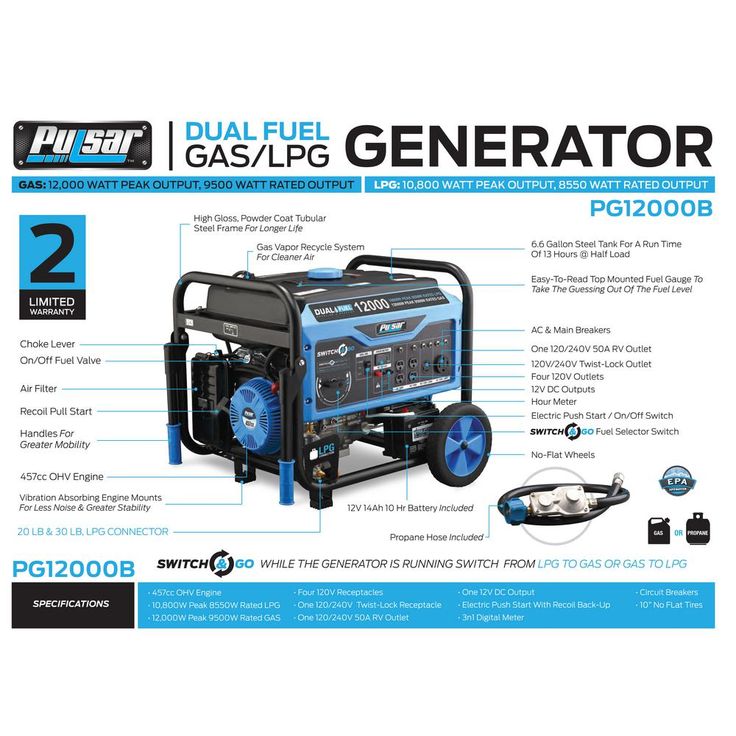 Pulsars PG12000B Dual Fuel Portable Generator was built to keep you out of the dark during the next power outage. The dual fuel feature with the ability to run on gasoline or liquid propane to provide you with more options and peace of mind in the event of a natural disaster. Its 457 cc, single cylinder, 4-stroke, OHV engine produces 12,000 Peak Watts/9,500 Running Watts on Gasoline and 10,800 Peak Watts/8,550 Running Watts on LPG. The extended run-time and output make it an ideal source of backup power for running large appliances and other electronic devices, so you can comfortably weather the storm. The PG12000Bs convenient Switch and Go technology allows you to seamlessly transition between fuel sources while in use without you missing a beat. Its durable steel frame, 10" never-flat wheels, and convenient drop-down handles make storage and maneuvering easier than ever. When you need the convenience of portability and the power to perform, the Pulsar PG12000B has you covered.