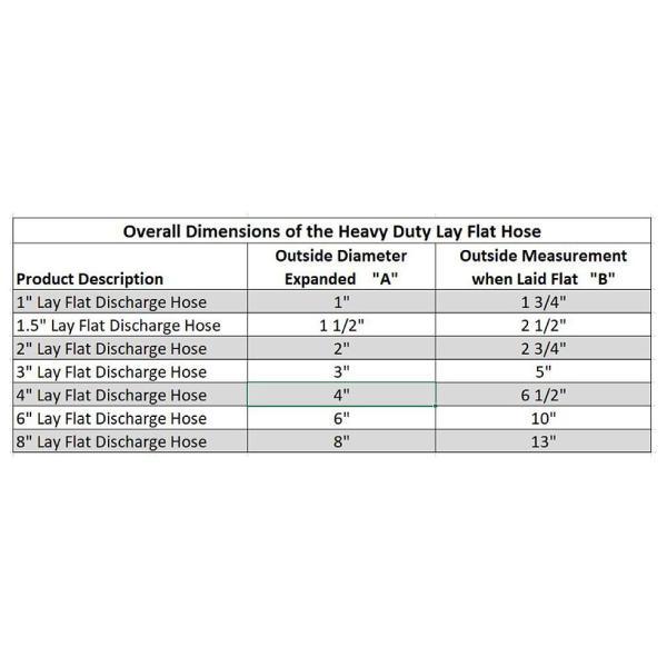 Our 6 Bar, Standard Duty Lay Flat Discharge Hose, commonly referred to as lay flat hose, discharge hose, backwash hose, construction hose, pool discharge hose, pump hose, and flat hose is perfect for use with water, light chemicals and other industrial, agricultural, irrigation, mining and construction fluids. Manufactured with a continuous high tensile strength polyester fiber circularly woven to provide reinforcement, it is one of the most durable lay flat hoses in the industry and is designed as a standard duty hose in residential, industrial and construction applications. Formulated with UV protectant, it is able to withstand outdoor conditions, and is ideally suited for use in pool, spa and other general open-end water discharge applications, greenhouses, nurseries, agricultural use, farm use, construction use, oil and gas exploration and extraction use and for mining discharge.