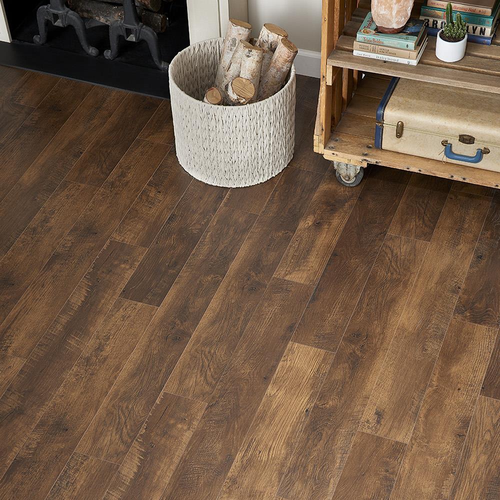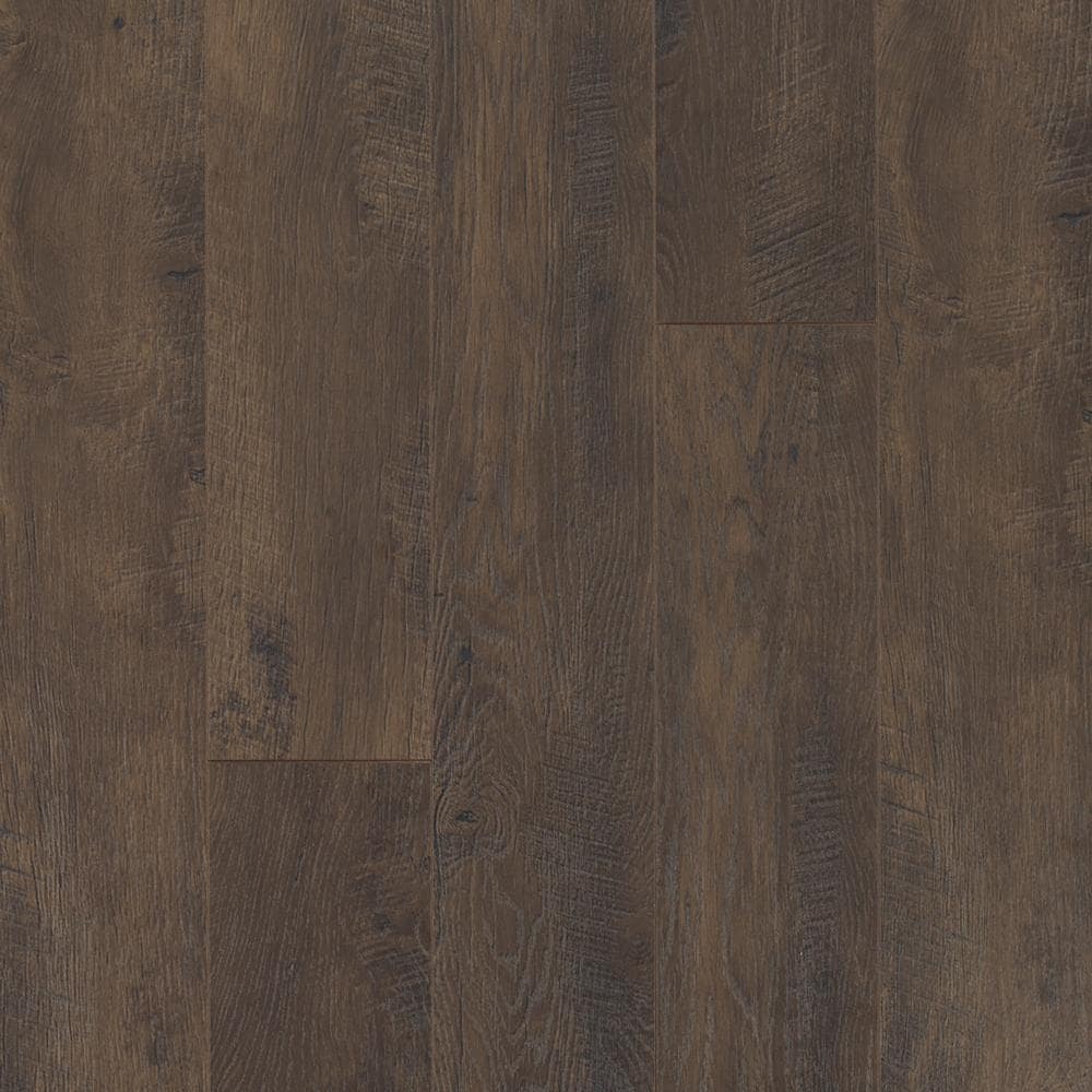 Experience the look of rustic oak with this QuickStep Studio laminate sample. The embossed wood-grain surface and beveled edges showcase rich brown tones, helping you preview how the 10mm, attached-pad planks will elevate your space.